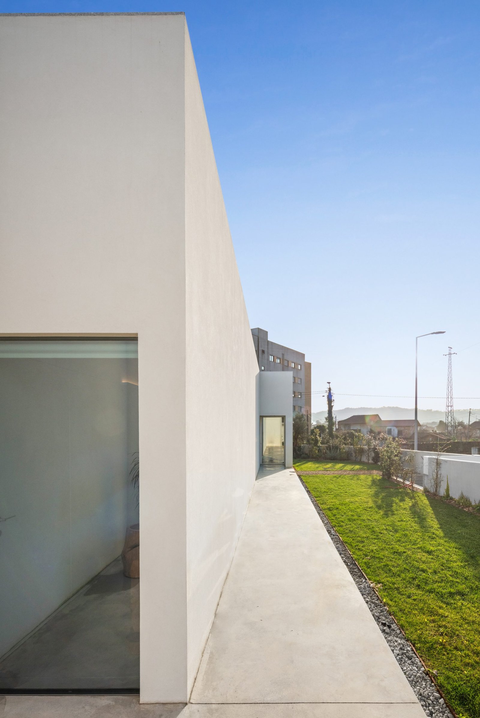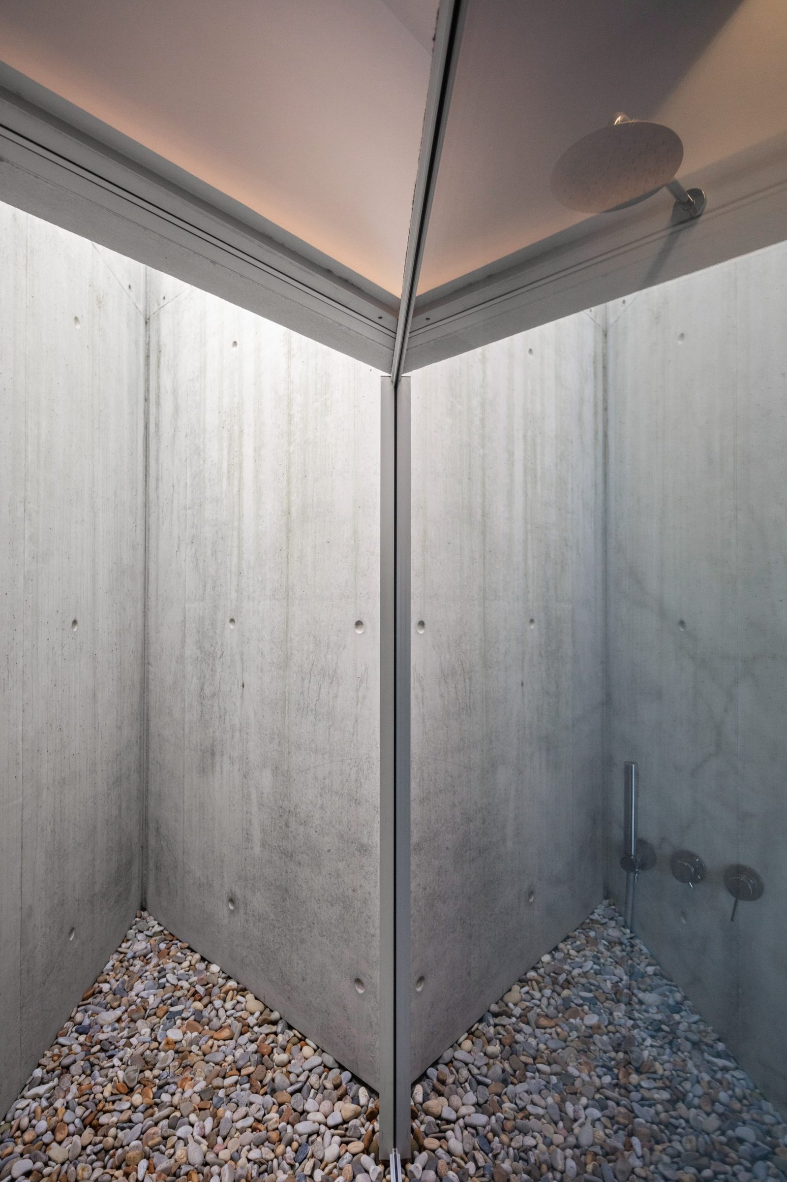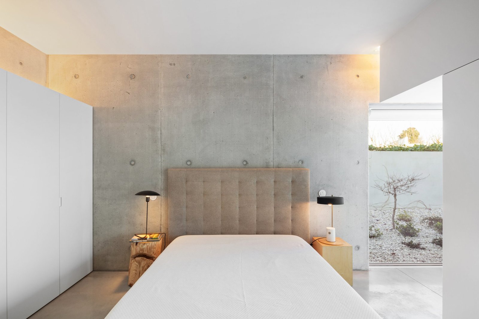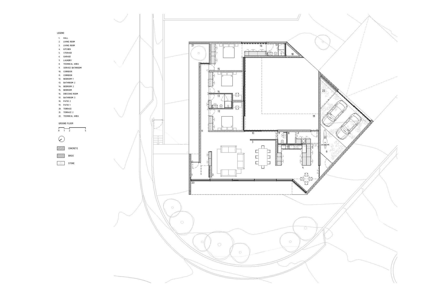 El ala privada de la casa está compuesta por dos dormitorios que comparten un baño y un dormitorio con vestidor y baño privado. El estacionamiento es un espacio cubierto que se conecta con la cocina a través de un vestíbulo.