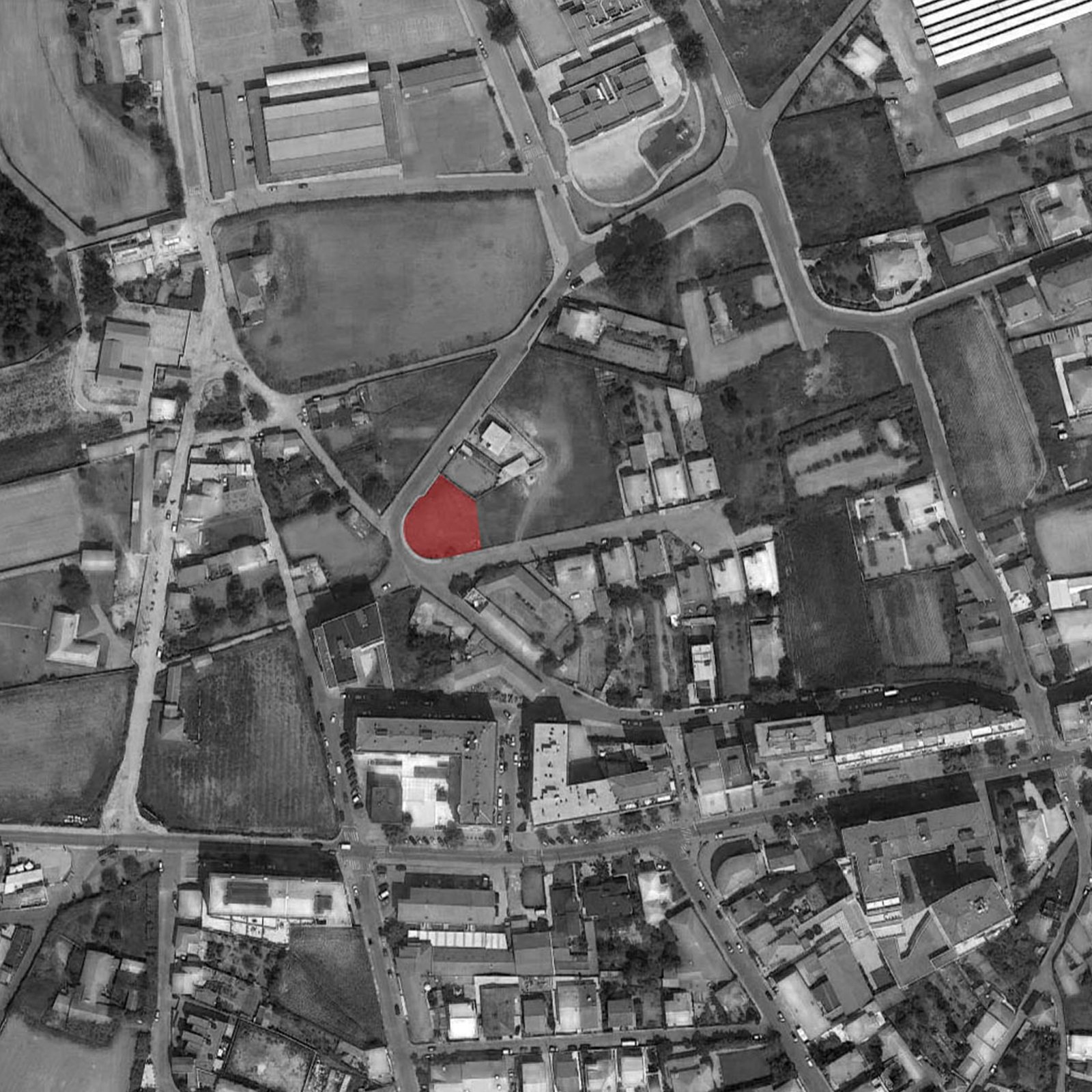 El terreno de intervención tiene una superficie de 931,00 m² y se encuentra en una esquina, con una fachada en curva y un ángulo cerrado. La topografía, aproximadamente 1,0 m por encima de los niveles de referencia de la calle, acompaña las pendientes de las vías que delimitan el terreno, en dirección al cruce.