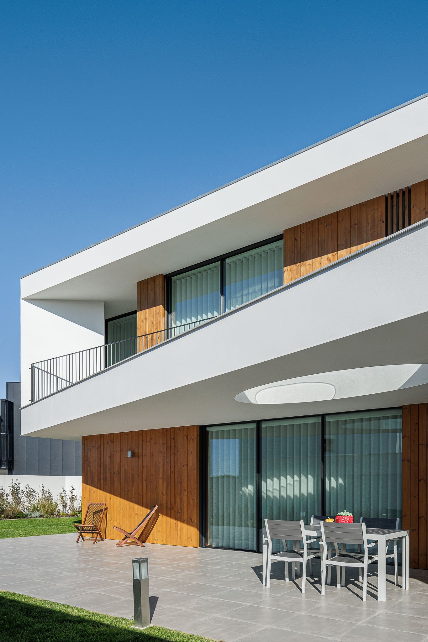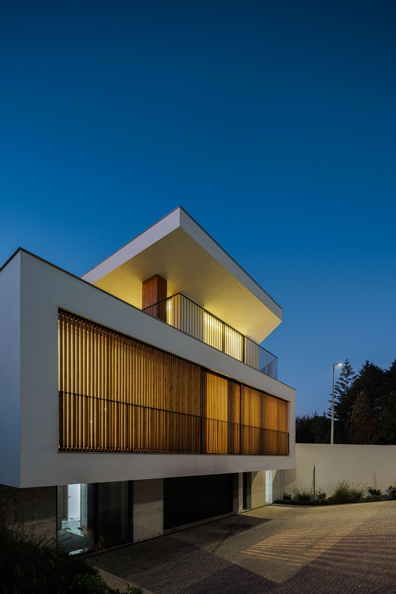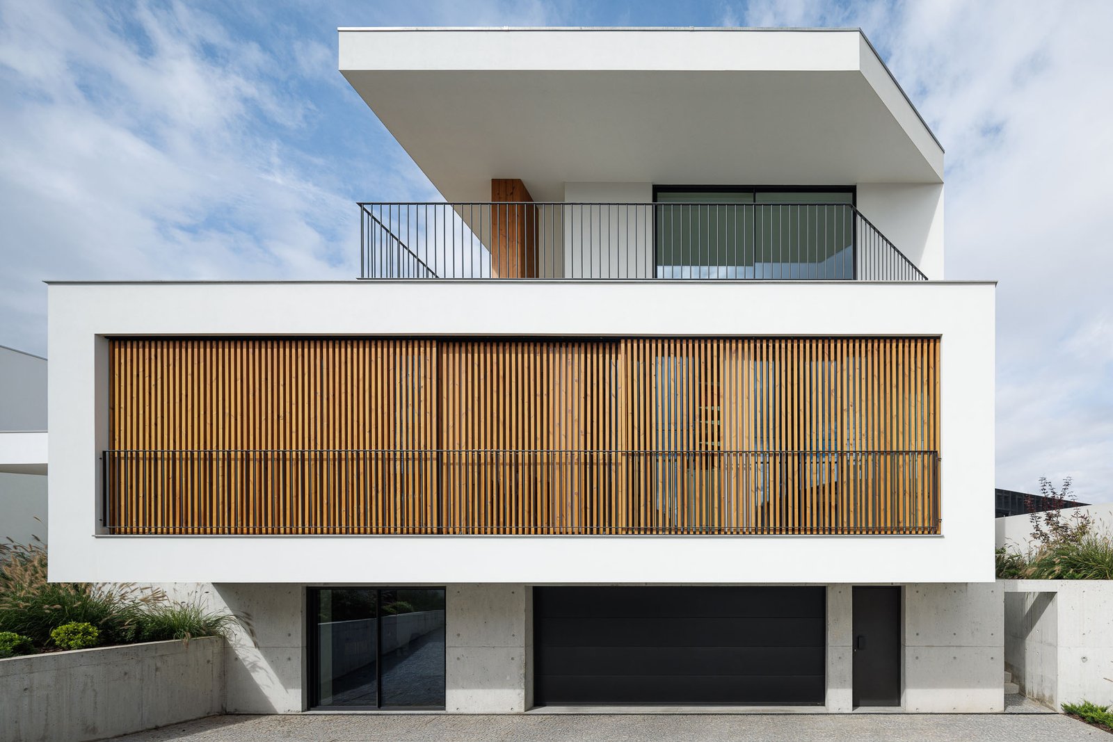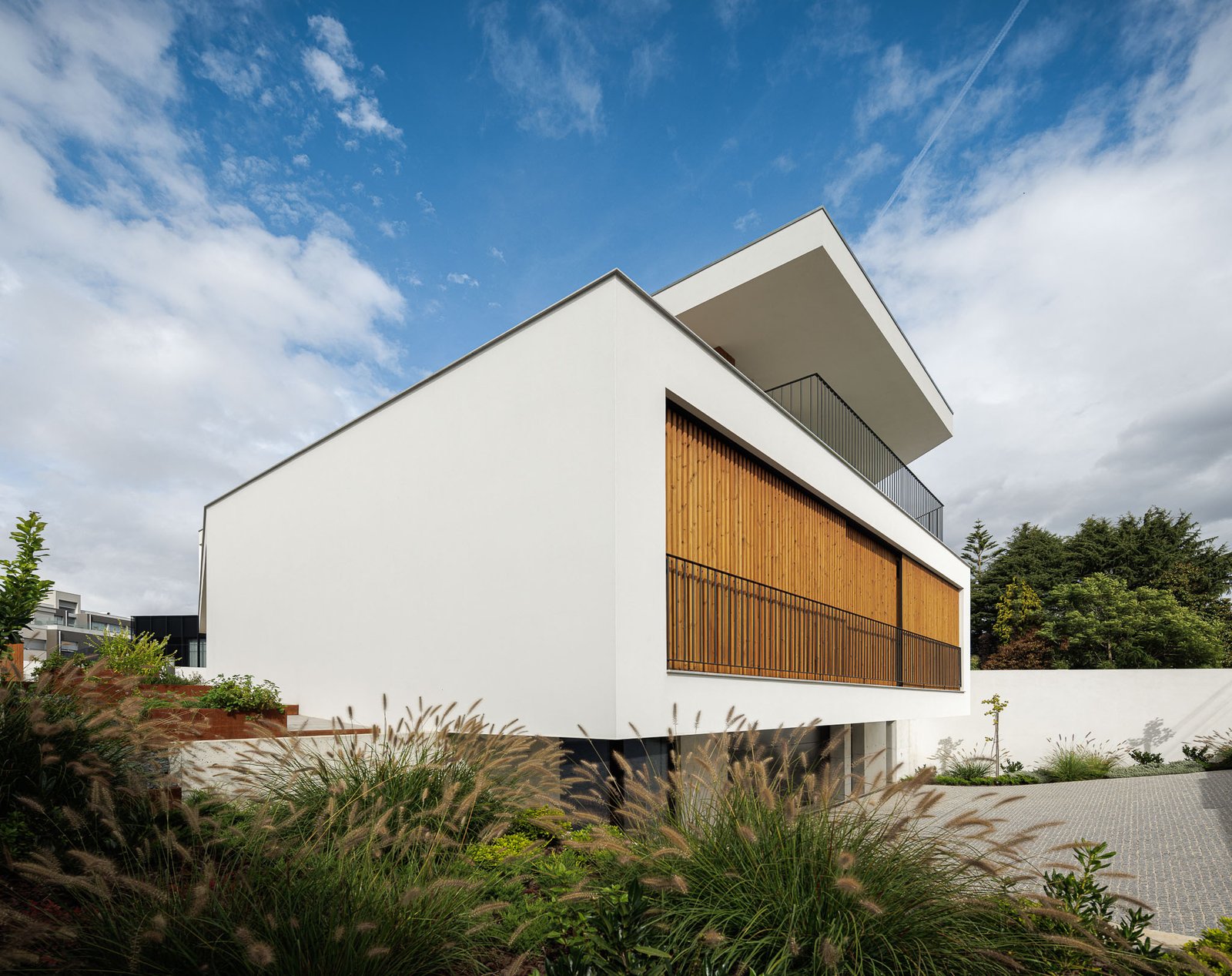 La casa se caracteriza por el uso de hormigón visto en el sótano, formando la base, y por el enlucido blanco contrastado con revestimientos de madera.