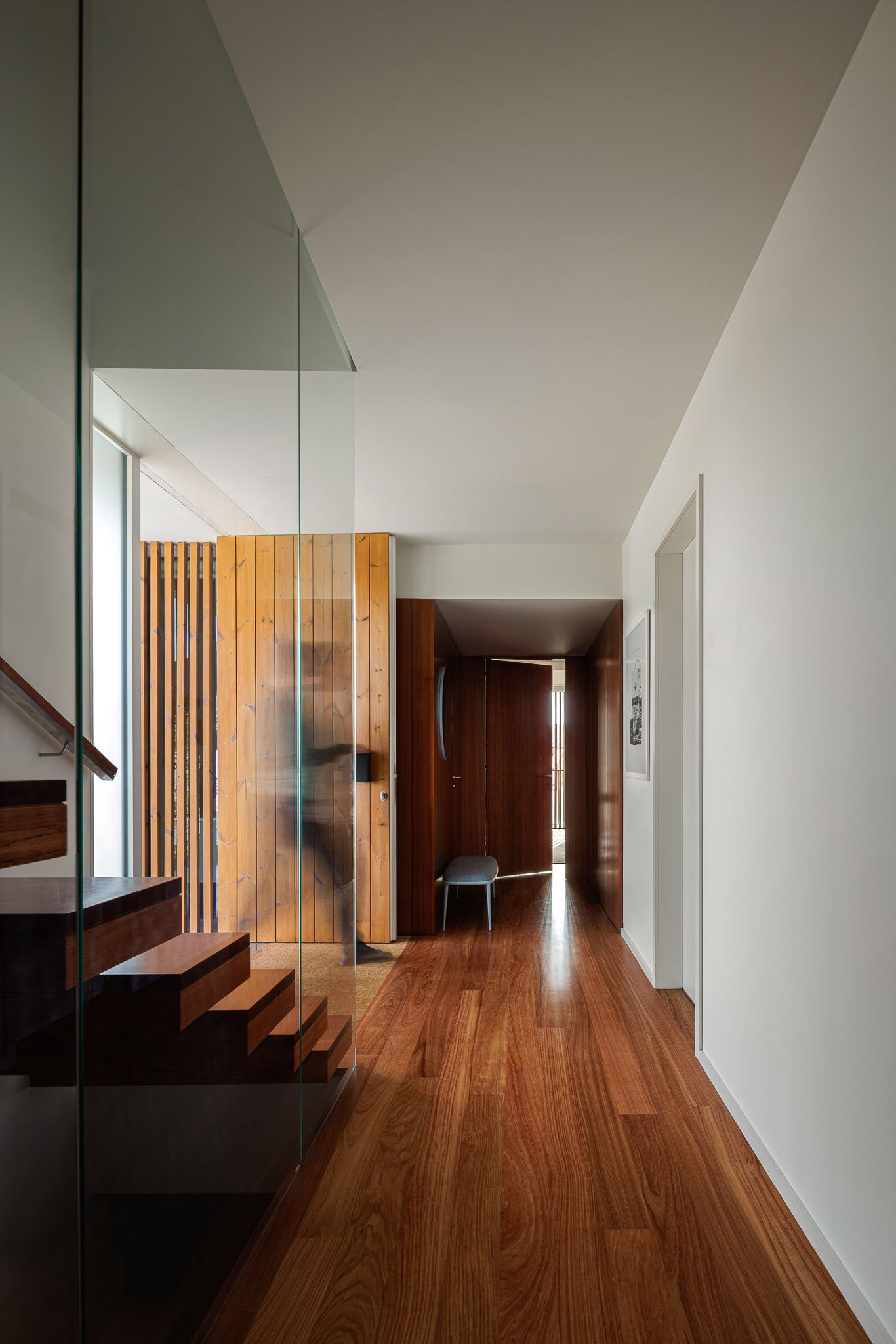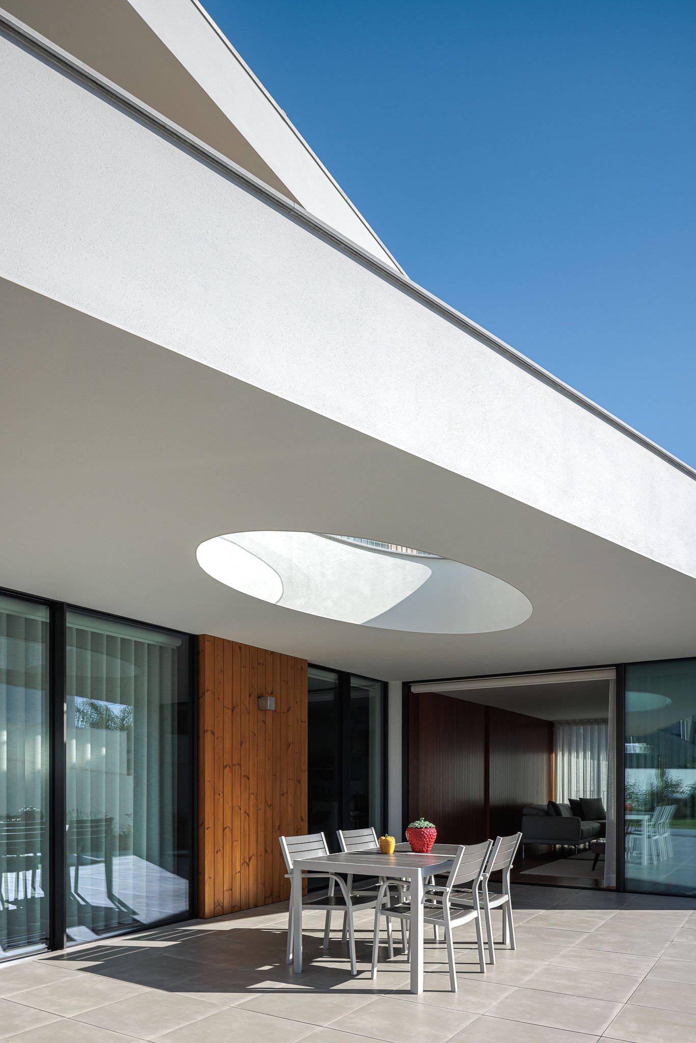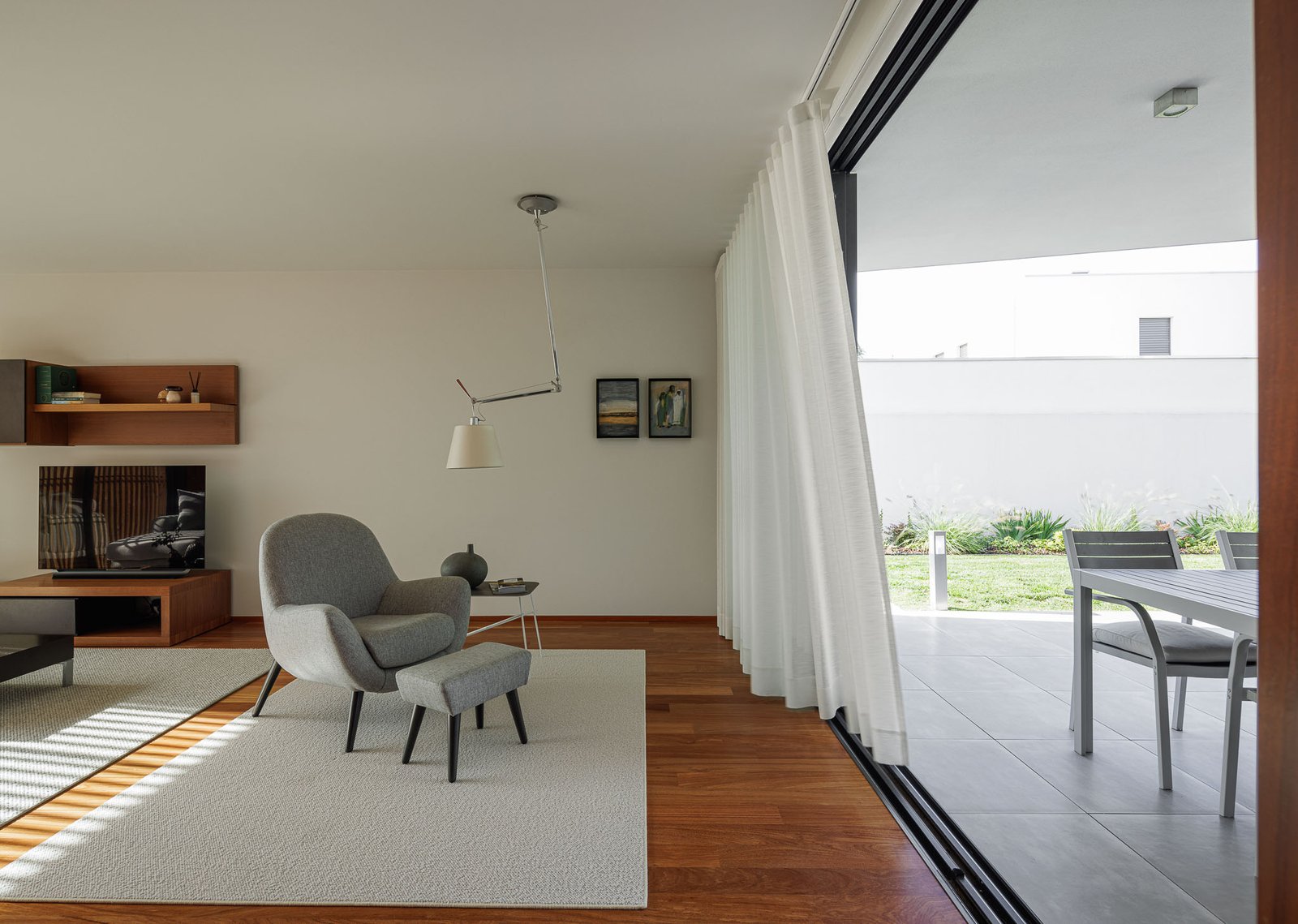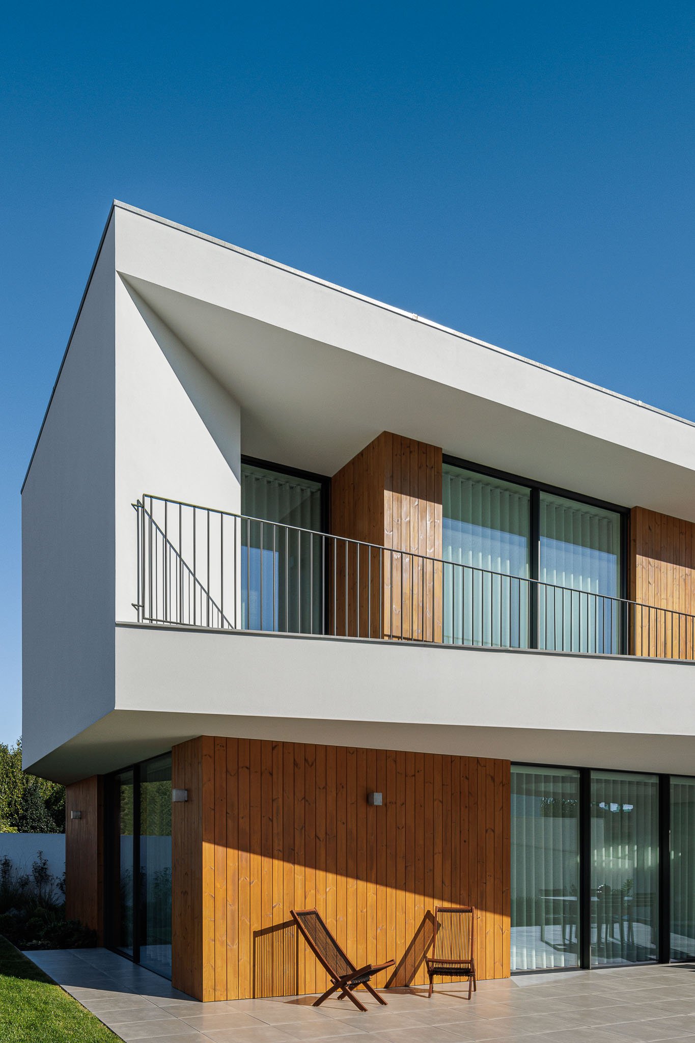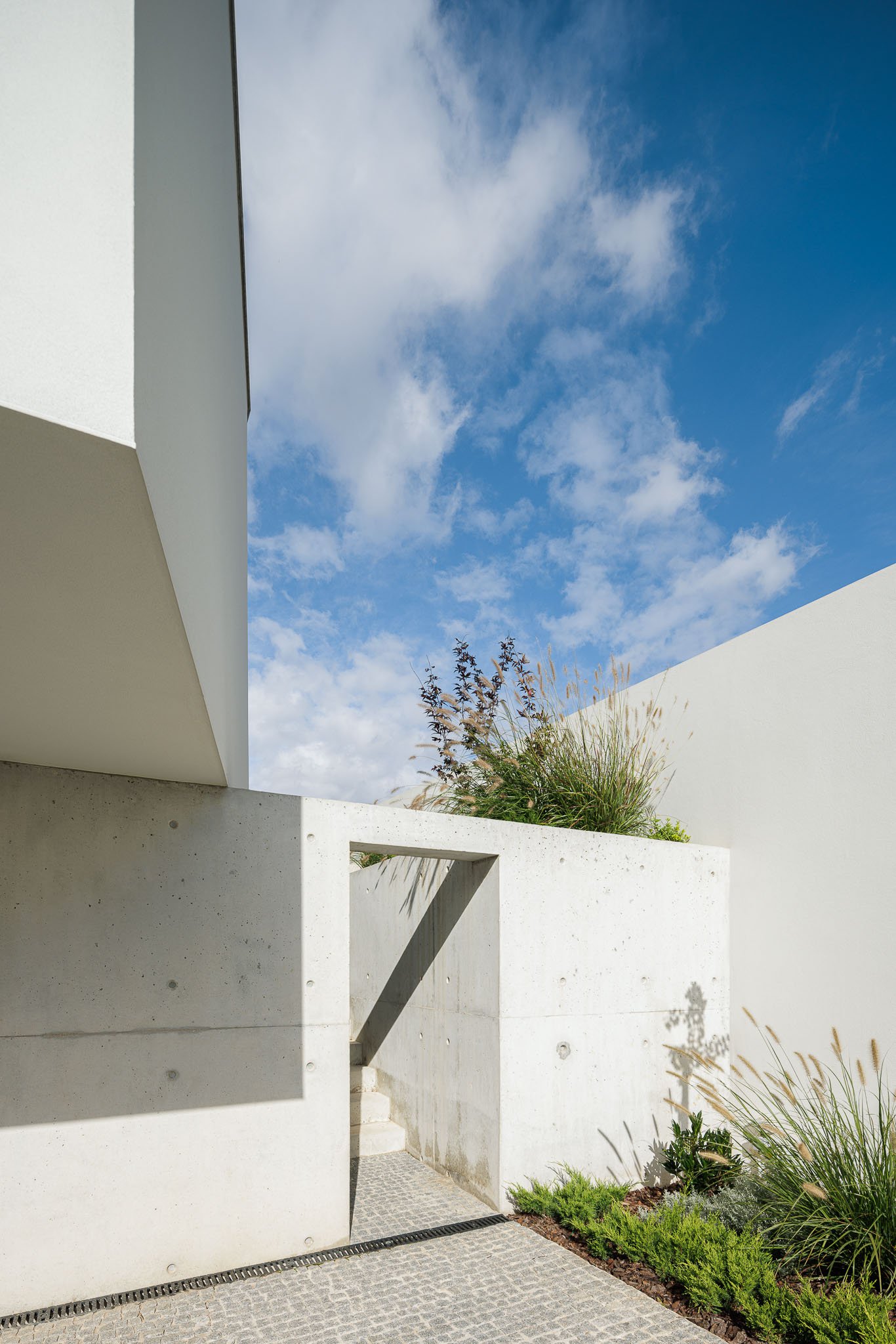 La casa se caracteriza por el uso de hormigón visto en el sótano, formando la base, y por el enlucido blanco contrastado con revestimientos de madera.