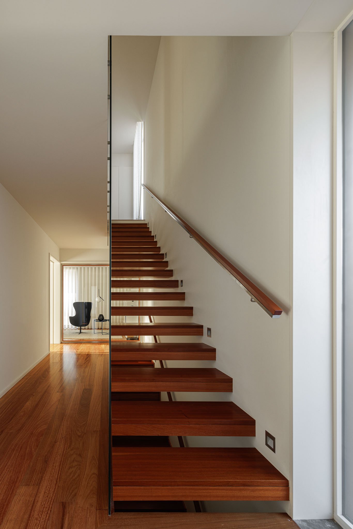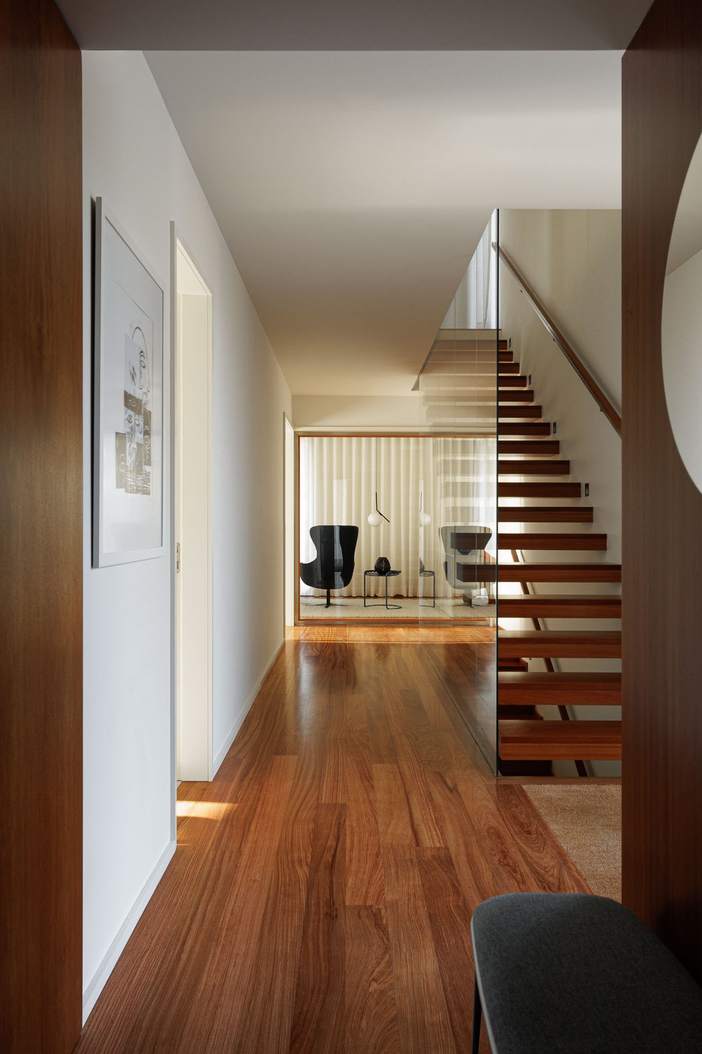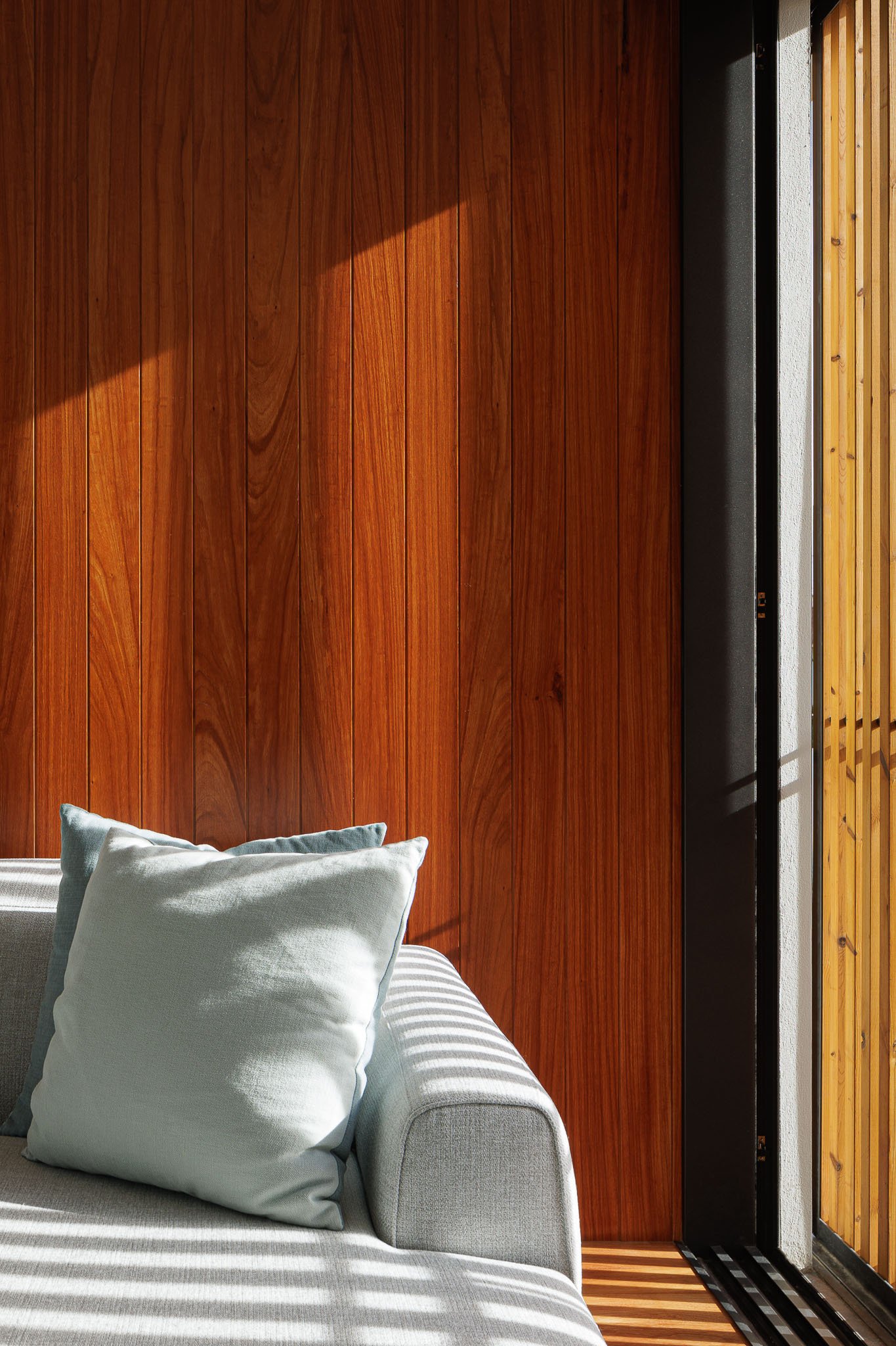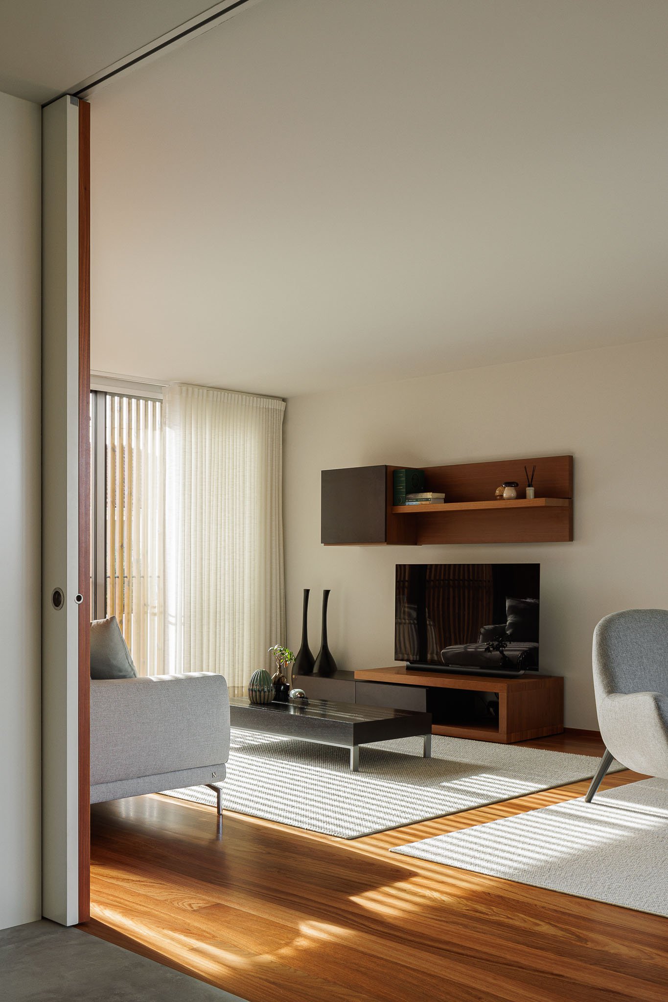 La casa se caracteriza por el uso de hormigón visto en el sótano, formando la base, y por el enlucido blanco contrastado con revestimientos de madera.