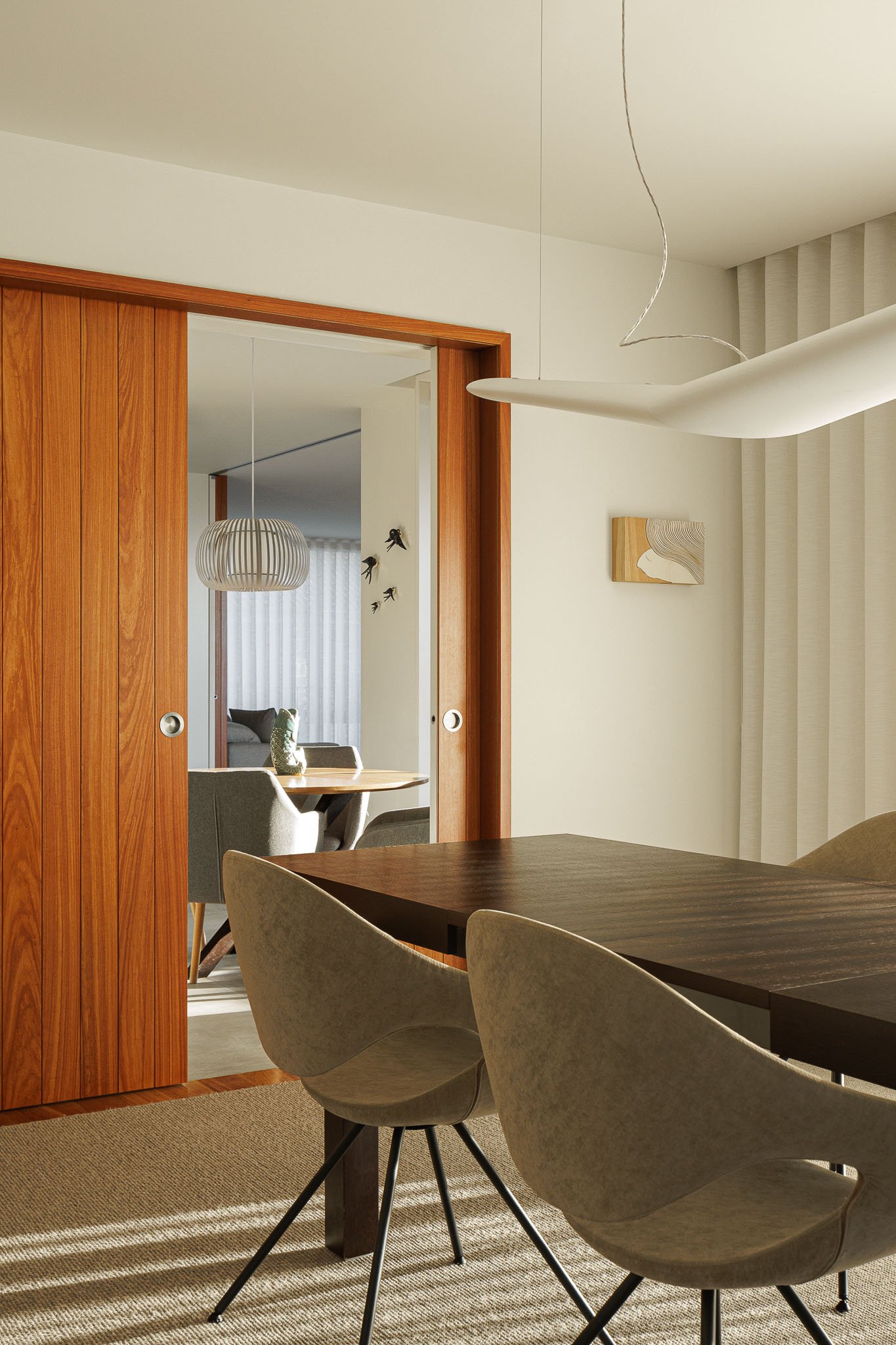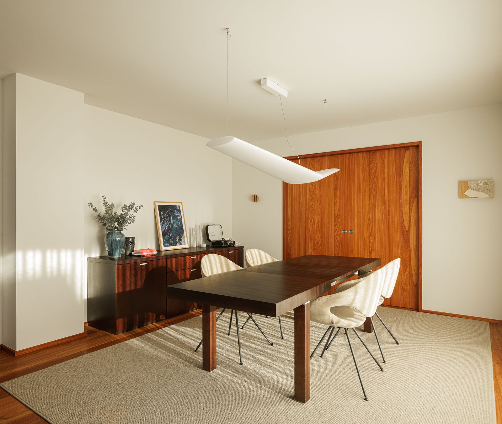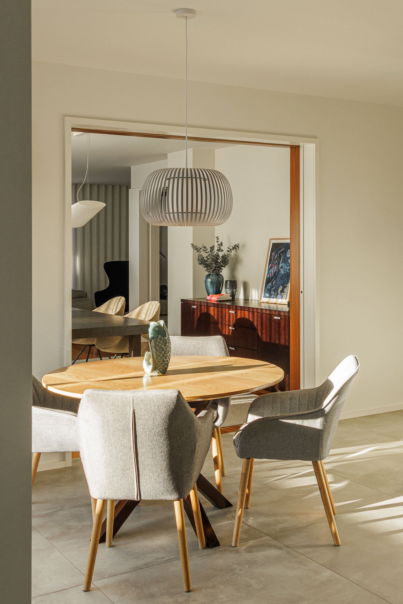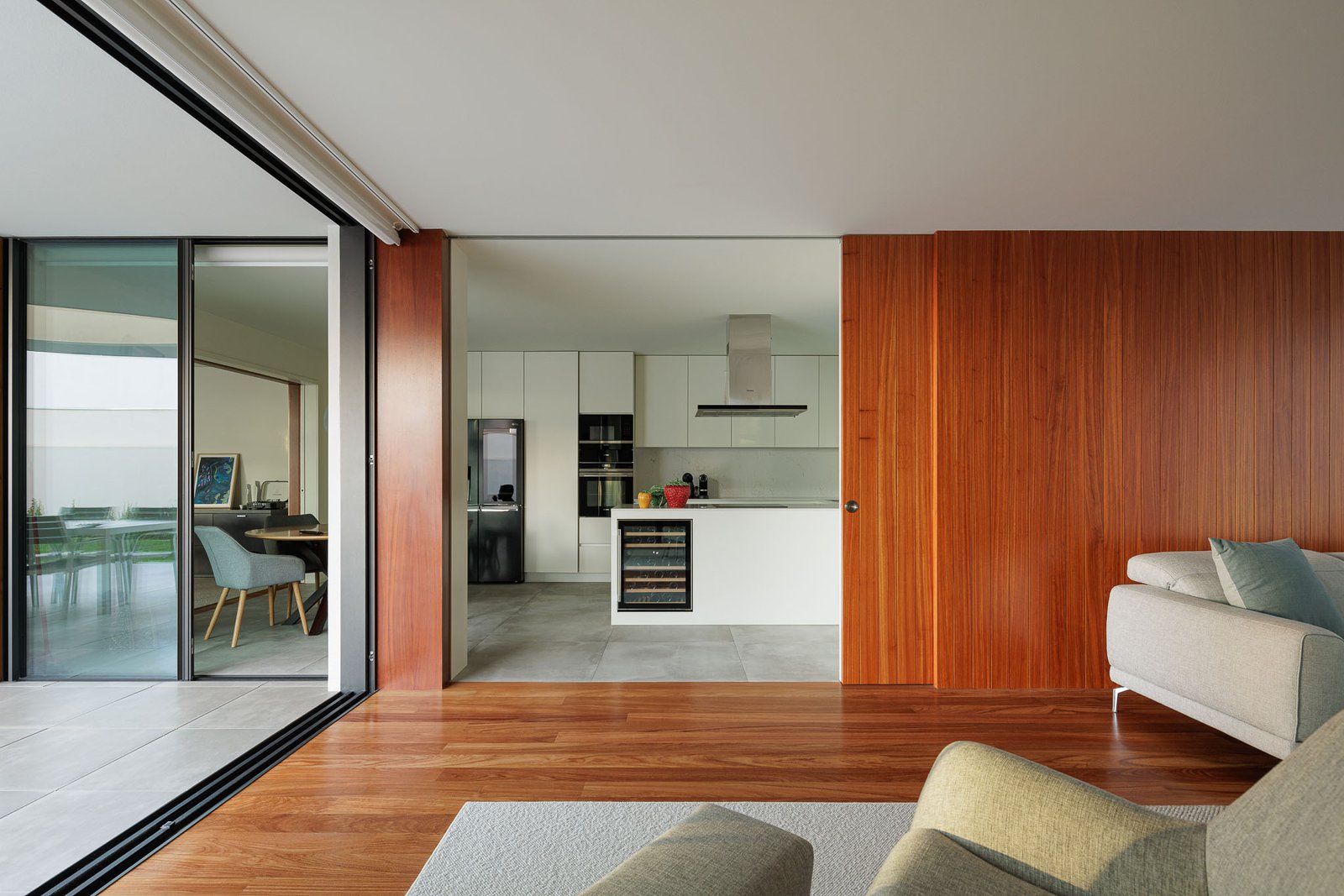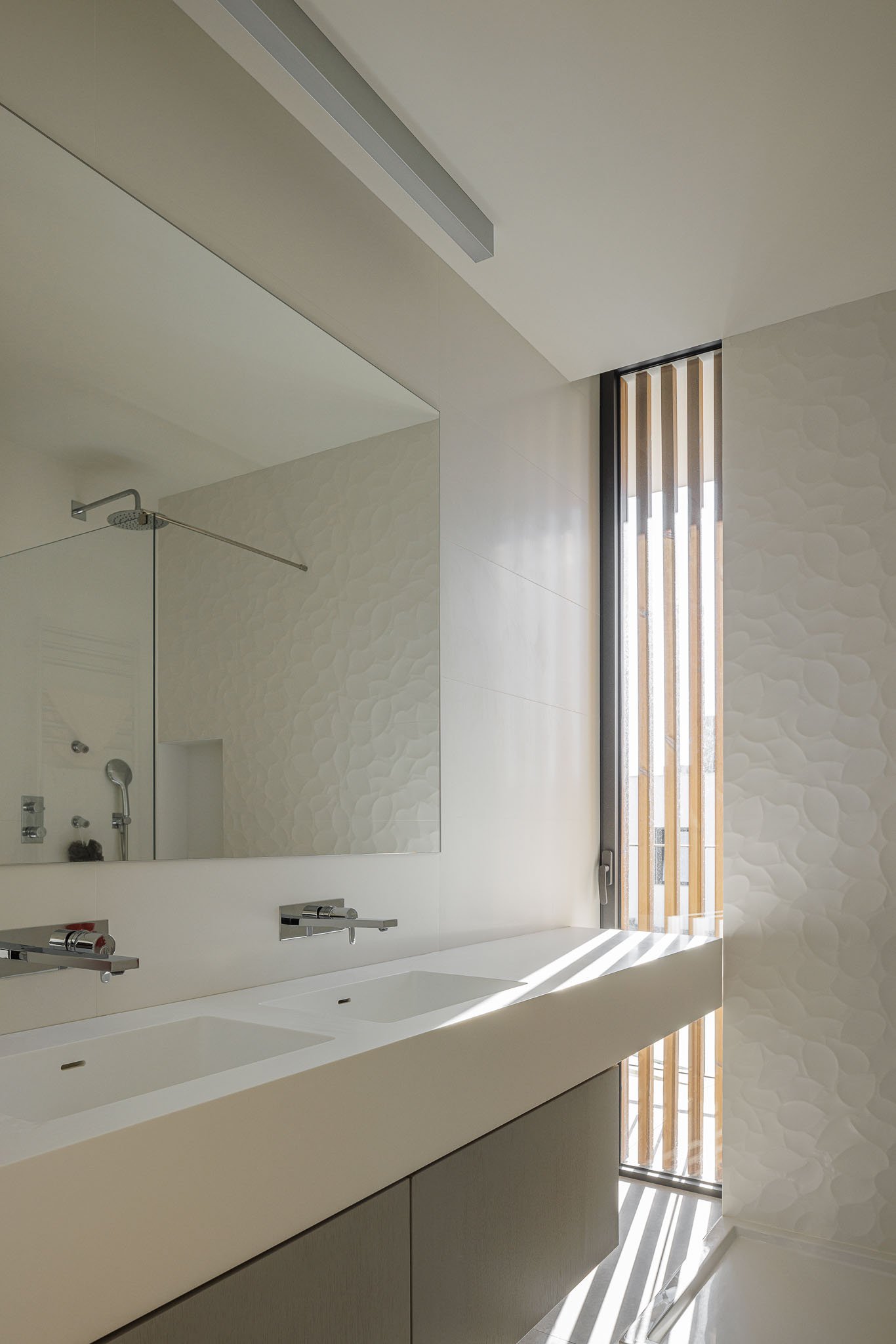 La casa se caracteriza por el uso de hormigón visto en el sótano, formando la base, y por el enlucido blanco contrastado con revestimientos de madera.