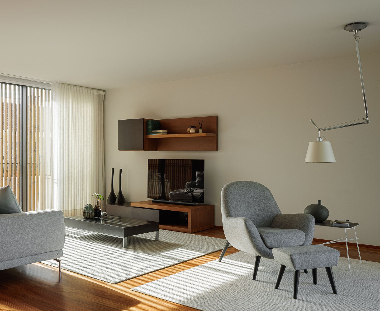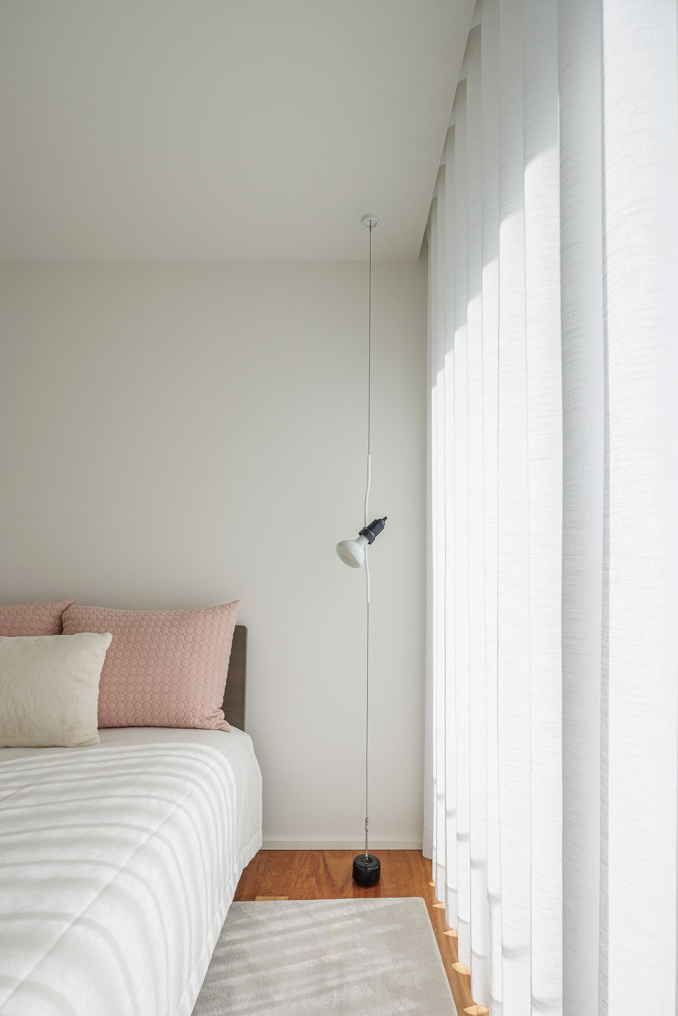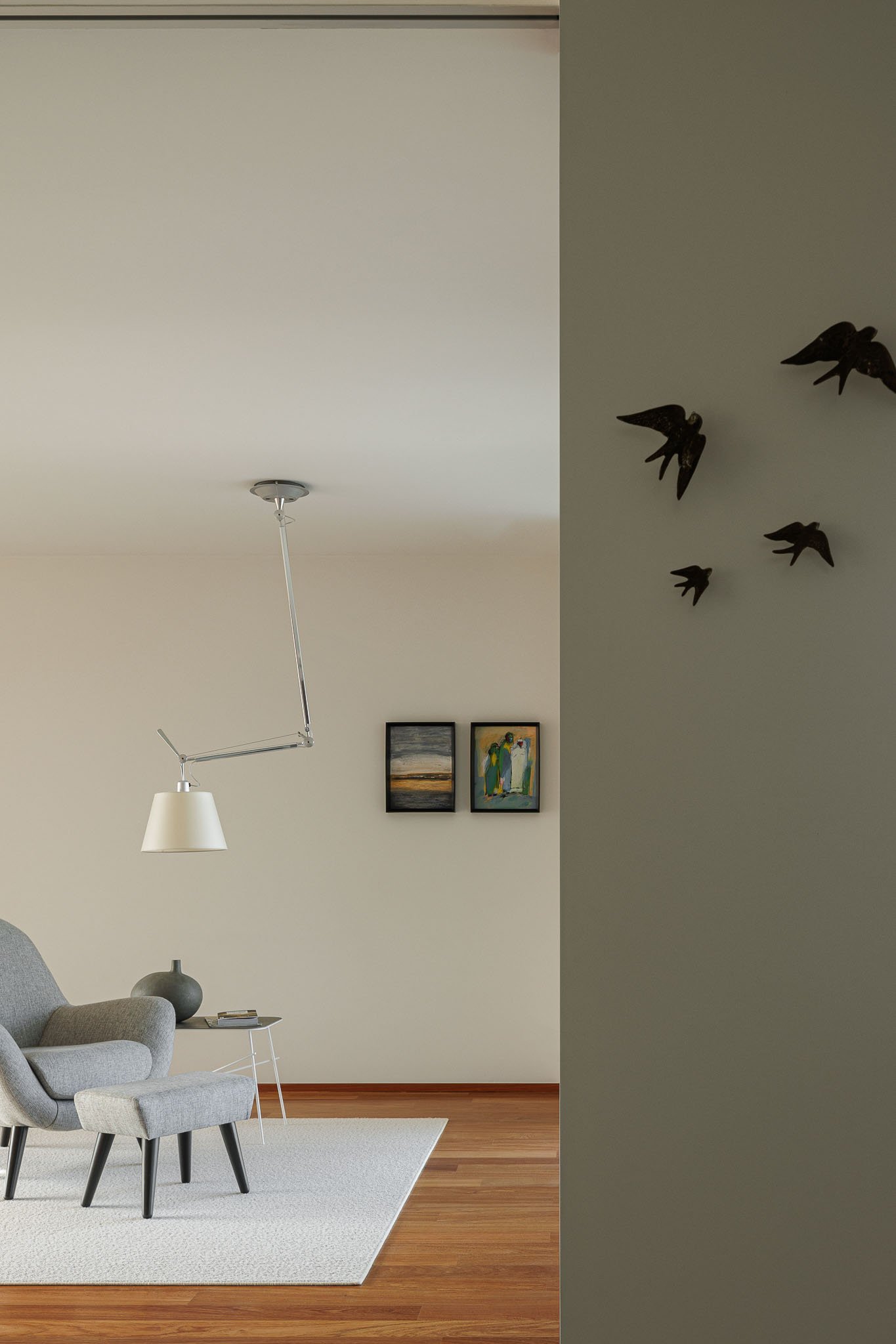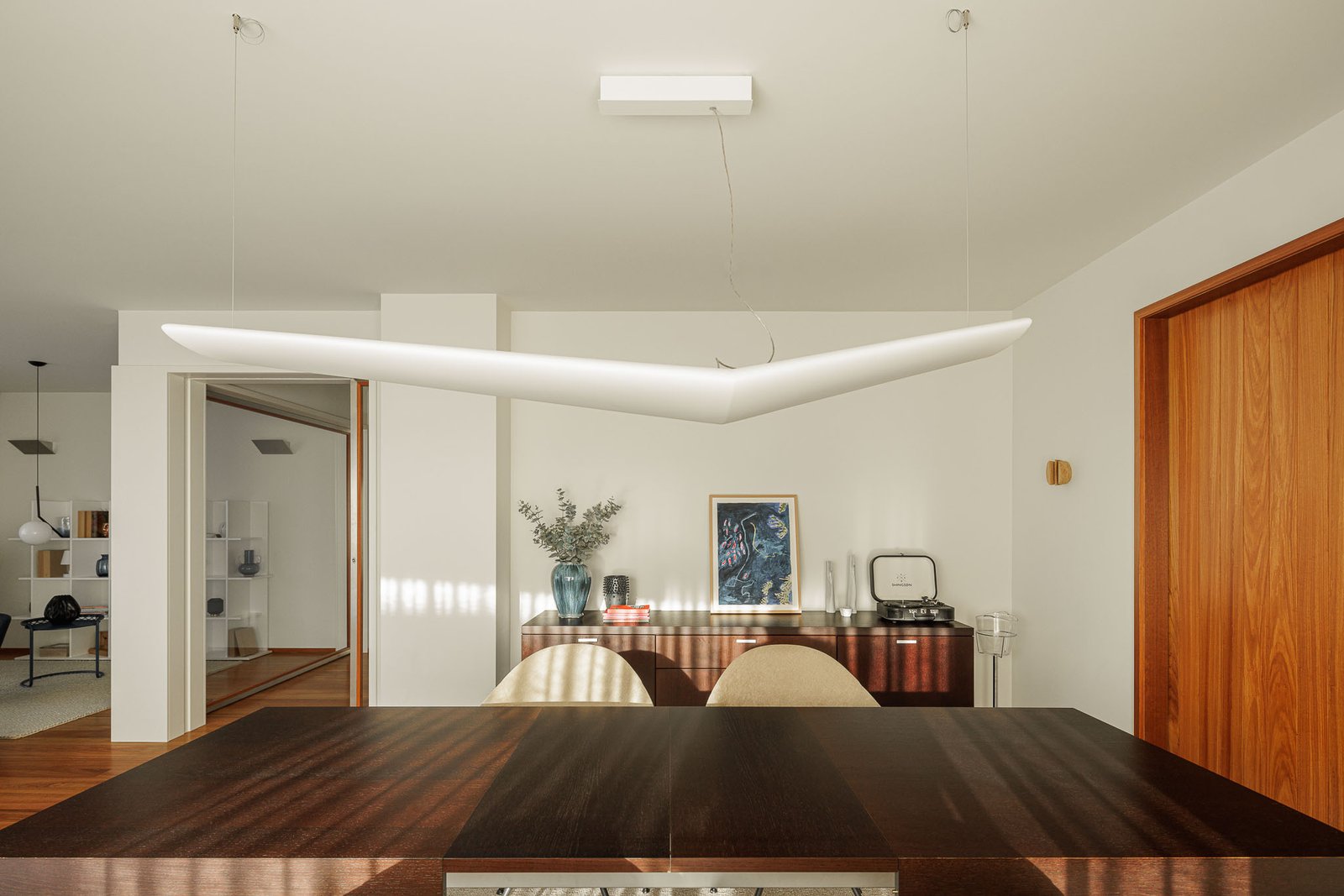 La casa se caracteriza por el uso de hormigón visto en el sótano, formando la base, y por el enlucido blanco contrastado con revestimientos de madera.