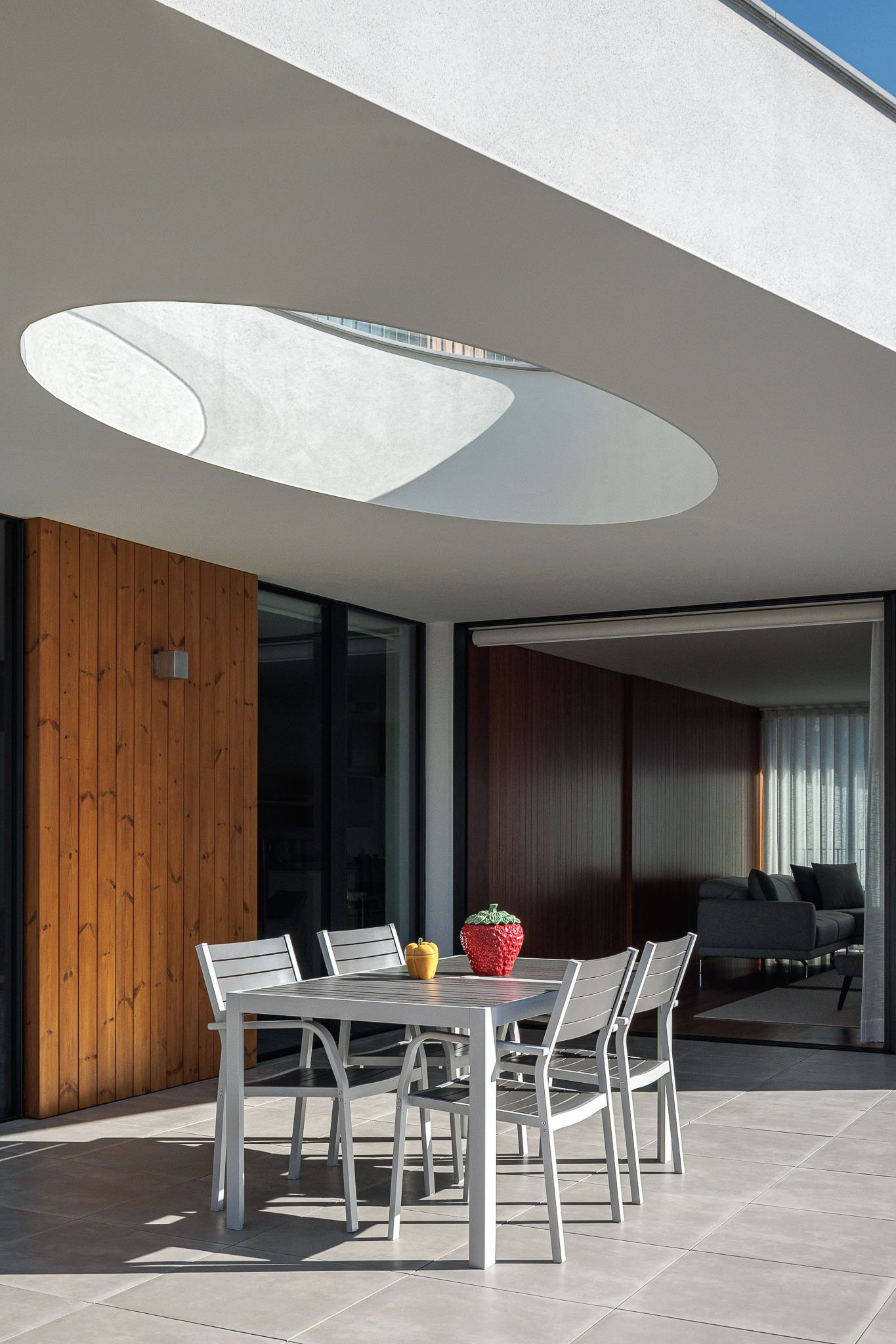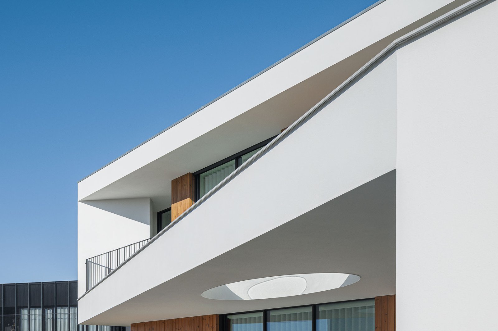 Las cubiertas acentúan la horizontalidad y aportan dinamismo al conjunto, rompiendo la rectangularidad de la construcción, impuesta por la geometría del terreno.