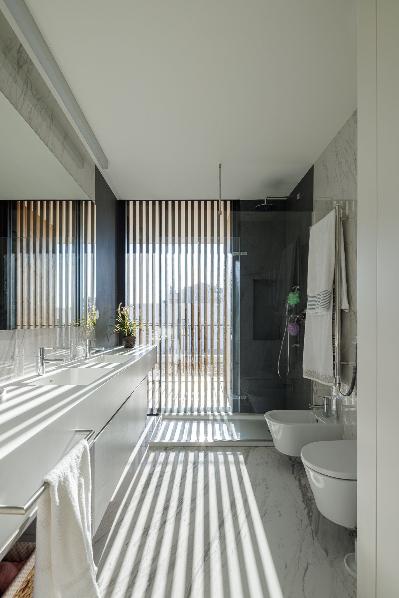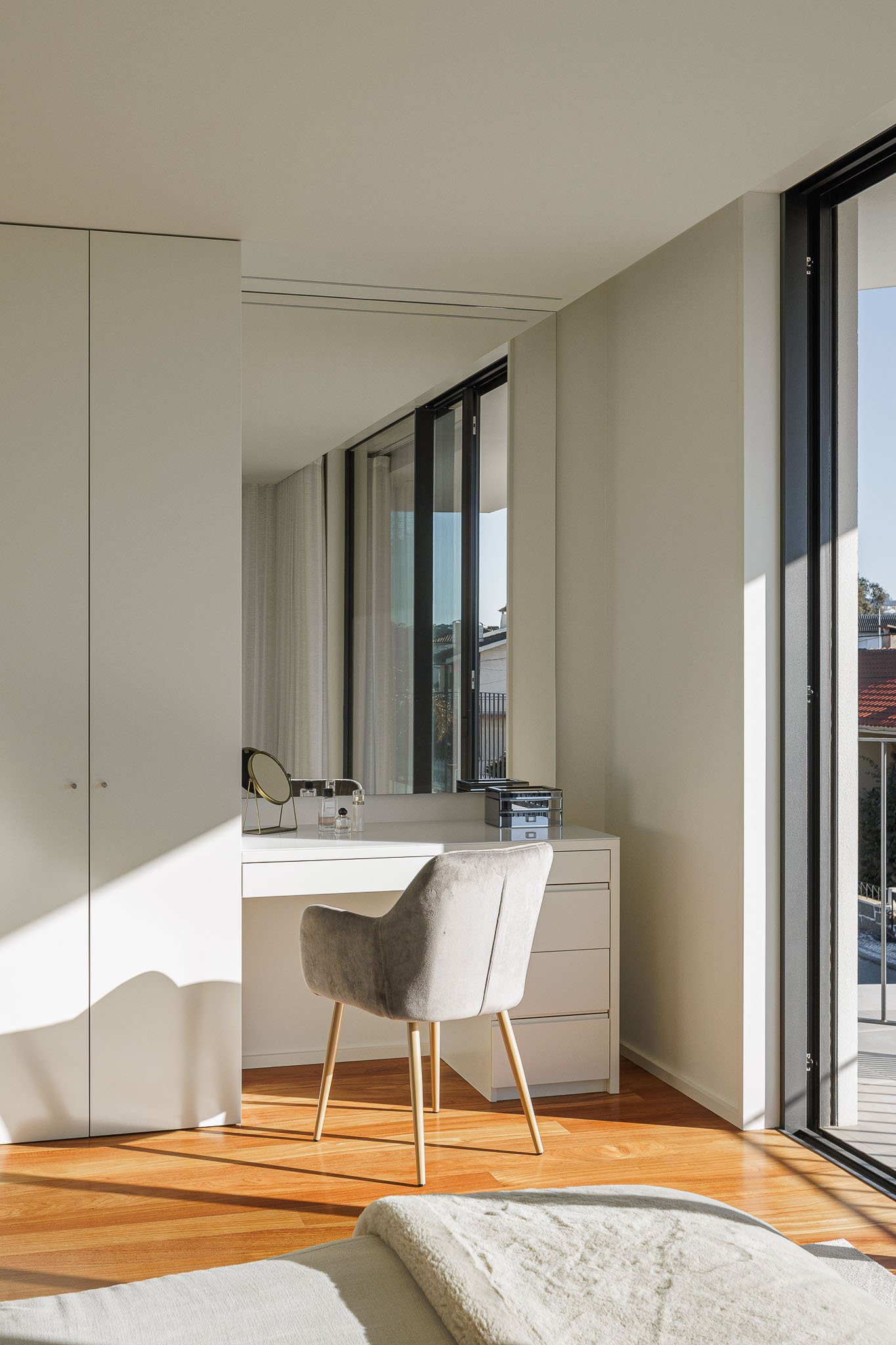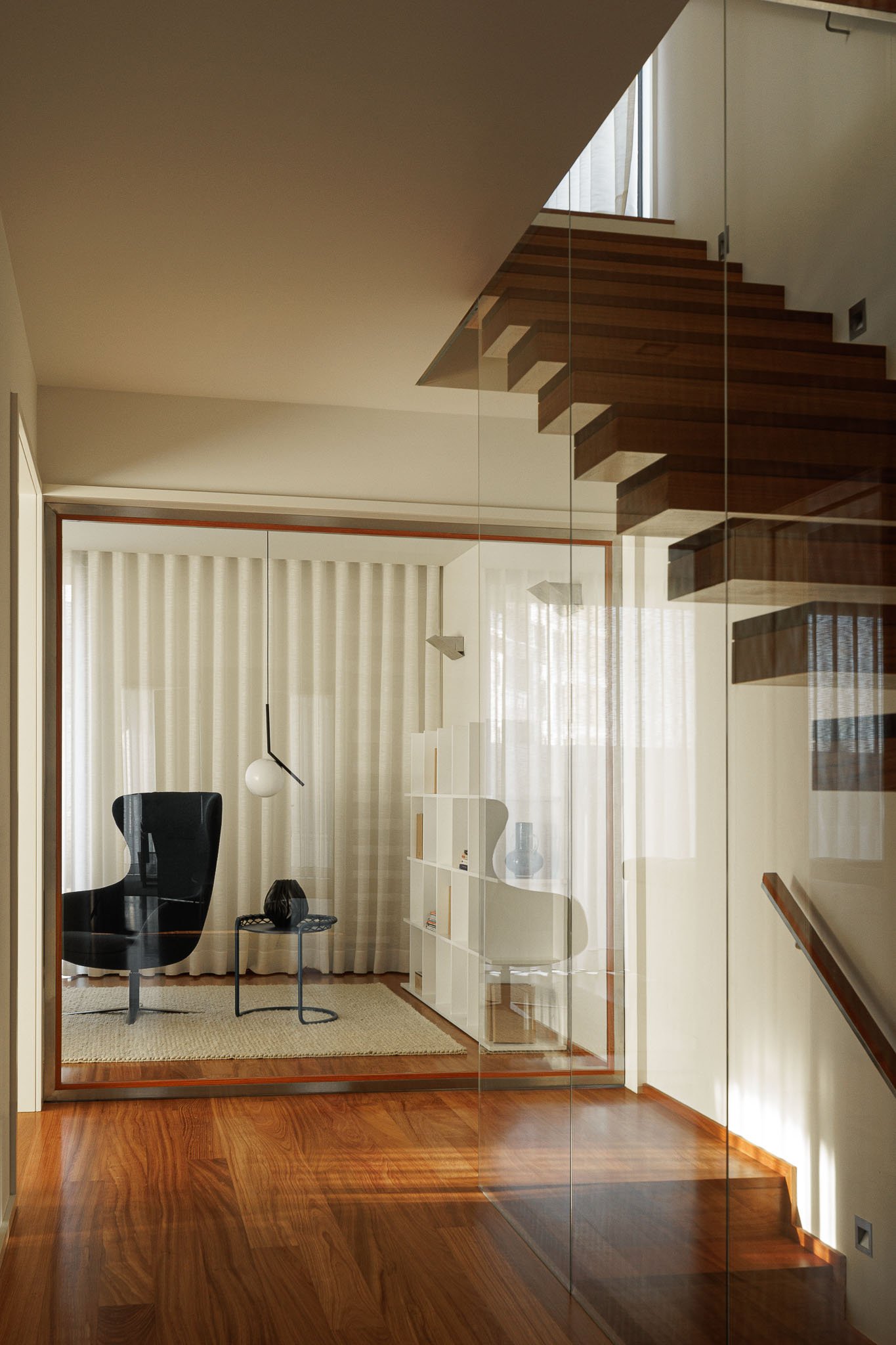 En el primer piso se encuentra la zona íntima, compuesta por dos habitaciones con baño compartido para los hijos de la pareja, la suite principal orientada al este y sur, y un despacho/sala de estudio orientado al sur y oeste.