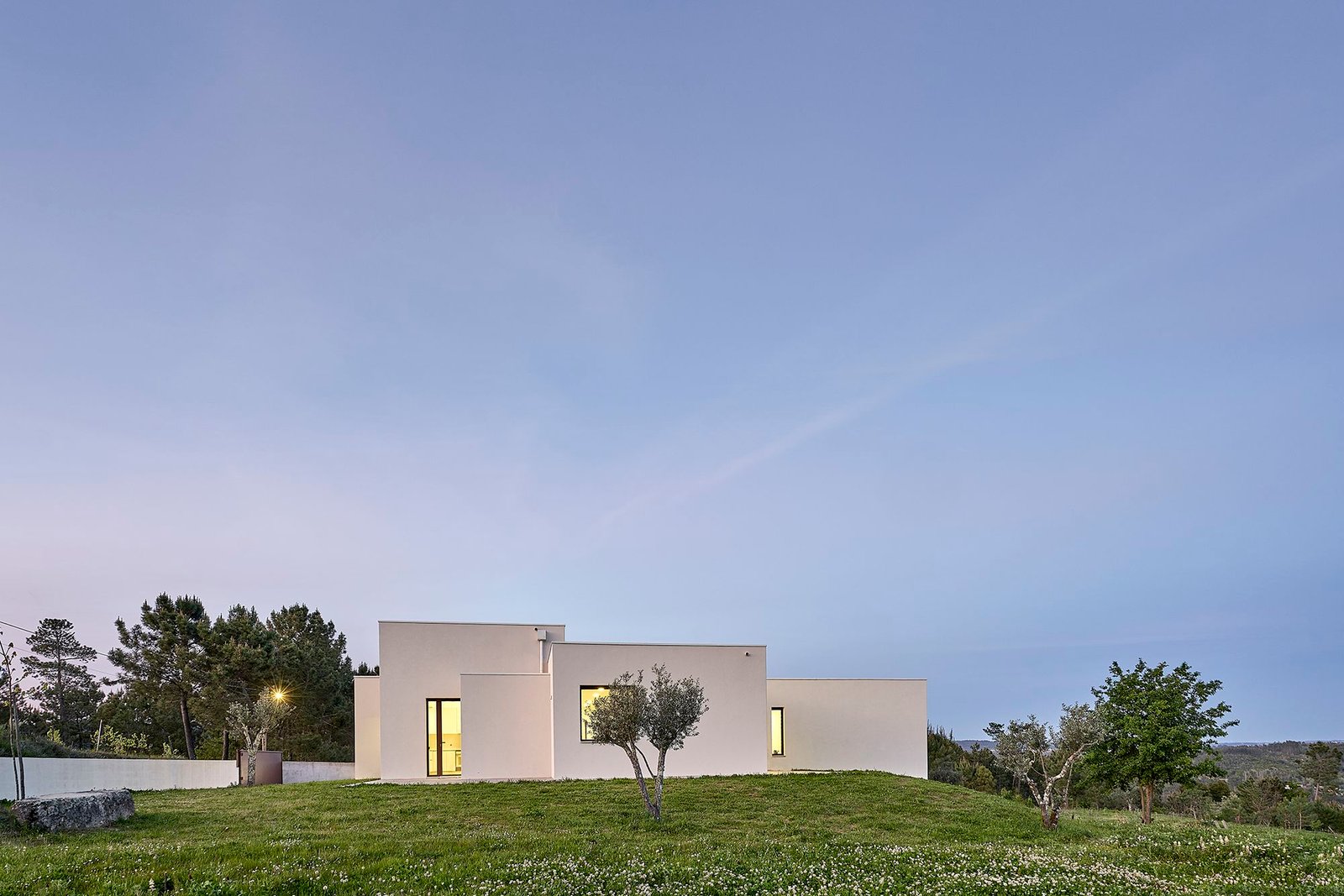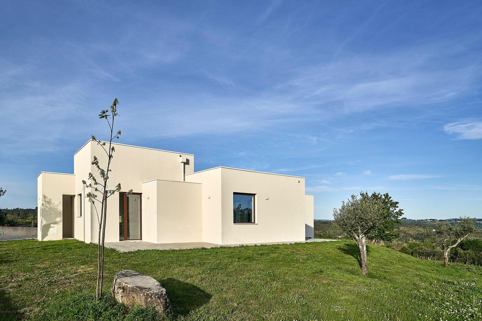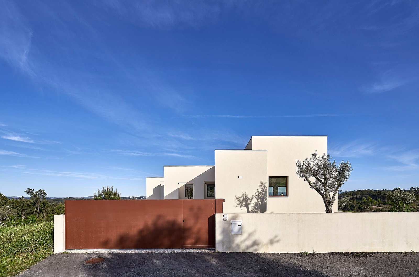 La topografía de la parcela desciende ligeramente hacia el este, lo que supone una importante limitación para la ubicación de la casa. El proyecto optó por situar el edificio cerca del límite noroeste de la parcela, junto a la calle, en la parte más alta del terreno, para aprovechar las vistas y la mejor orientación solar de las estancias.