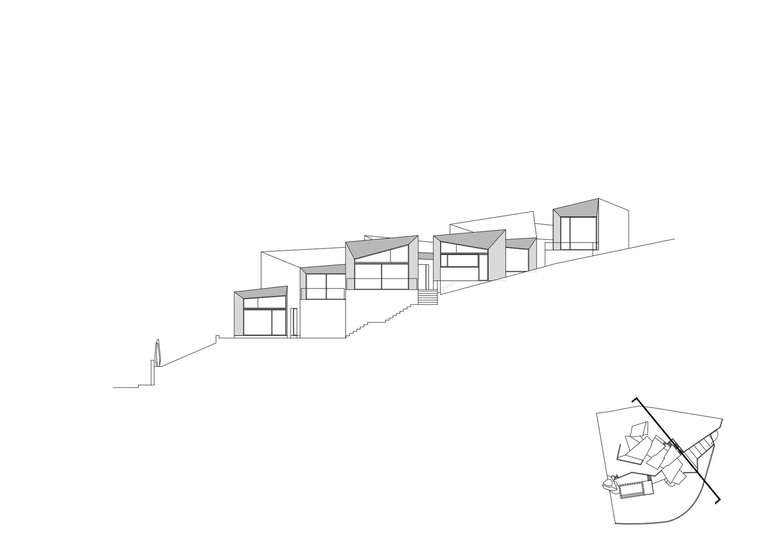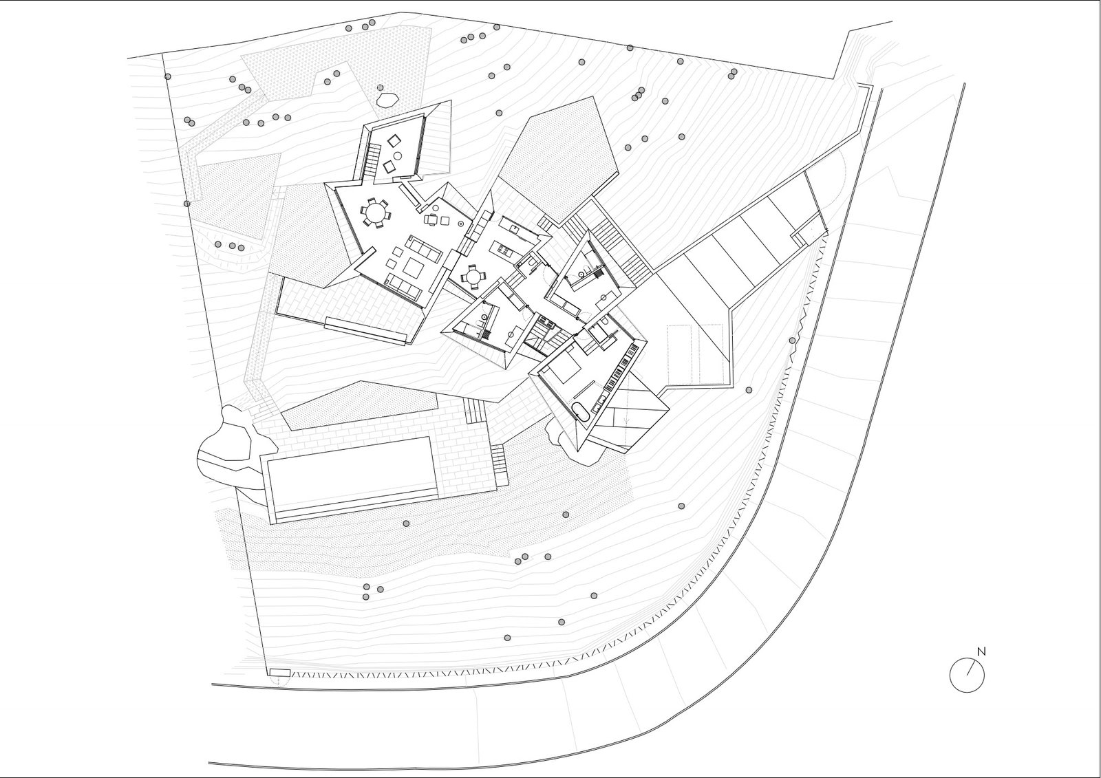 La edificación se posiciona según un eje longitudinal norte-sur en el centro de la parcela, siguiendo la línea de máxima pendiente. Mediante diferentes niveles en su interior va ascendiendo por el terreno acoplándose a las curvas de nivel, sorteando rocas y pinos, retorciéndose para asomarse a las mejores vistas.