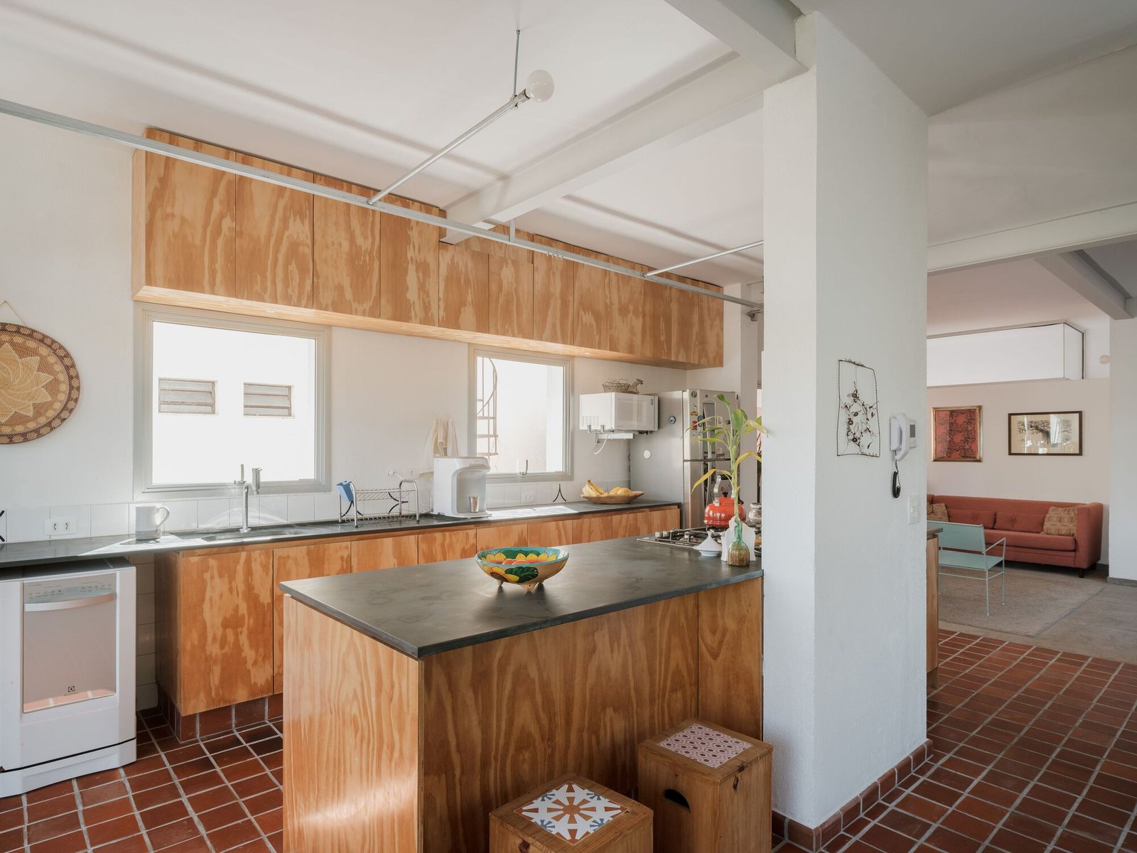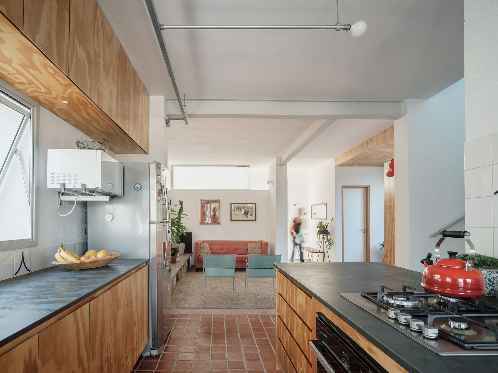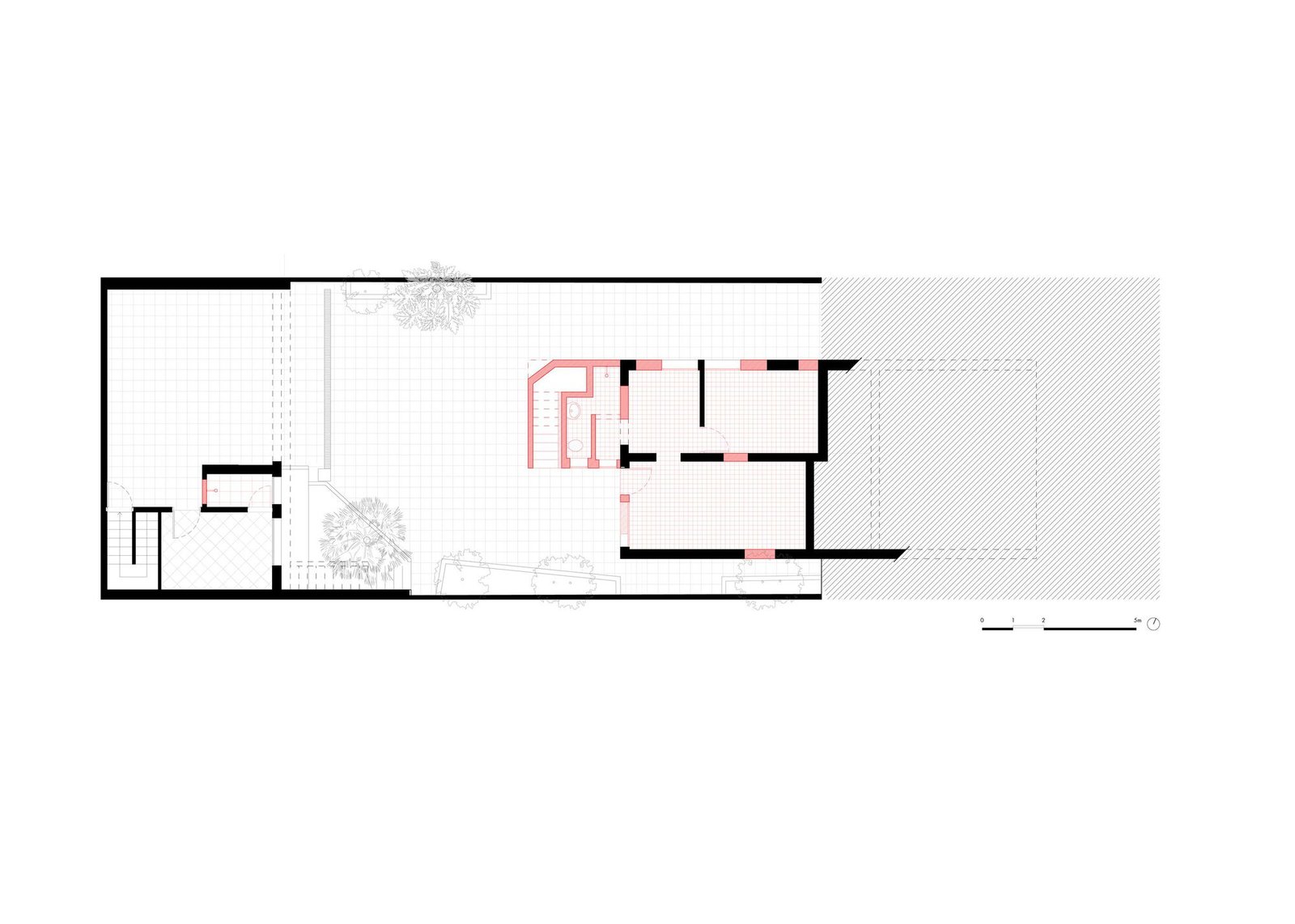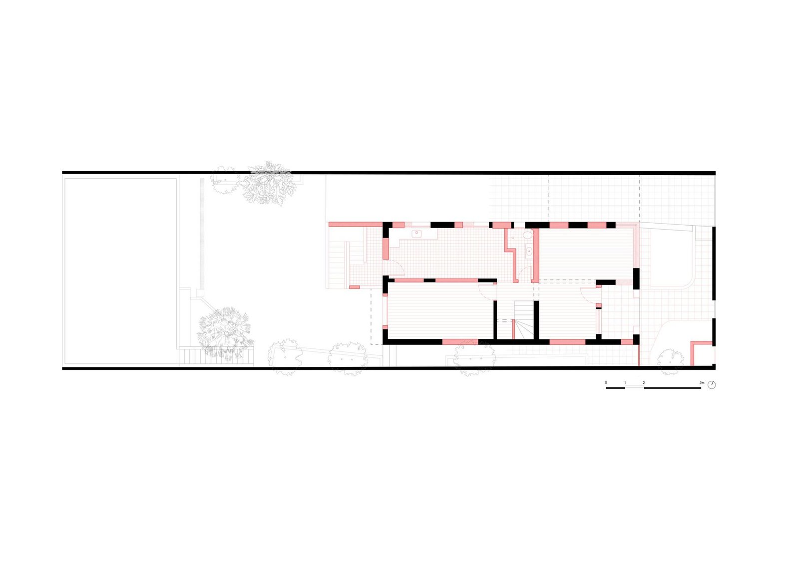 Estructura y redistribución del programa – Para que la estructura de la casa pudiera ser reutilizada y valorada, comprenderla fue fundamental, lo que reforzó la necesidad de la actividad proyectual hasta el final de la obra. Se trataba de una construcción de mampostería portante de ladrillos macizos y losas reticuladas con bovedillas cerámicas, en la cual la apertura de nuevos vanos tenía que hacerse con el máximo cuidado. La planta original estaba conformada por cuadrantes bien marcados, que determinaban el sentido de armado de las losas y estaban divididos por un septo central, correspondiente a la escalera y los baños. Intervenciones posteriores, sin embargo, desconfiguraron esta disposición.