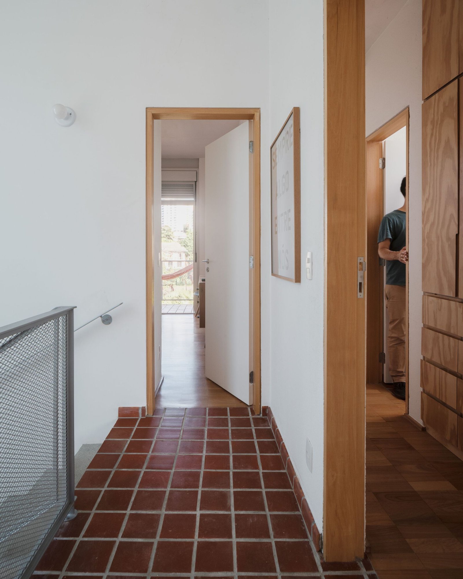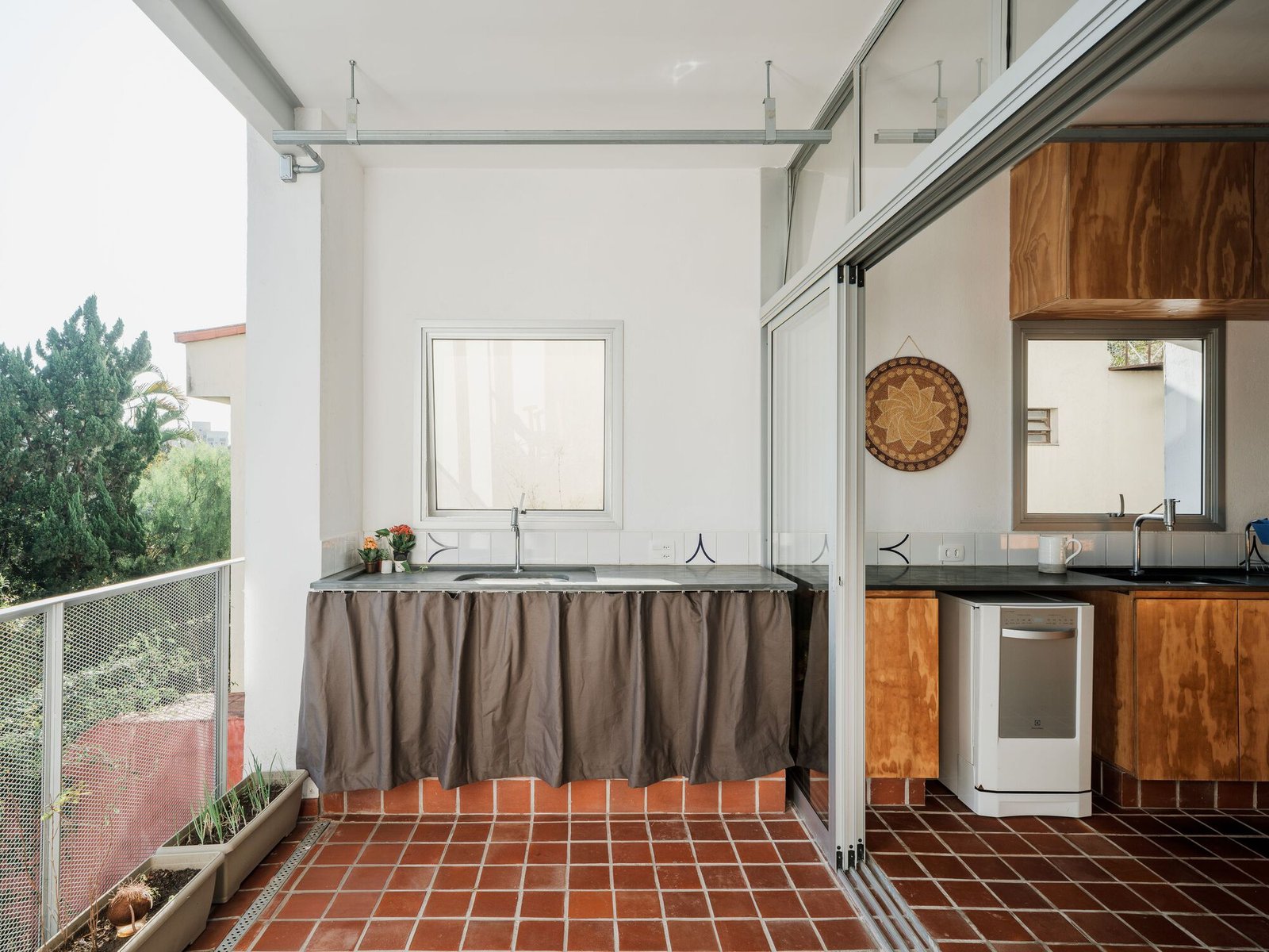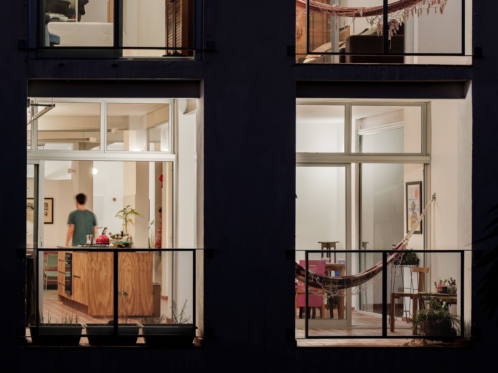 La creación de balcones en la fachada oeste contribuyó tanto al control solar como al disfrute del paisaje del valle. Como cierres, se utilizaron carpinterías de aluminio con hojas móviles de dimensiones convencionales y, para aberturas más grandes, vidrios fijos en perfiles simples.