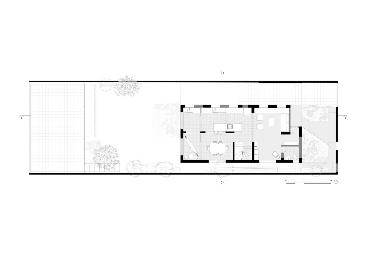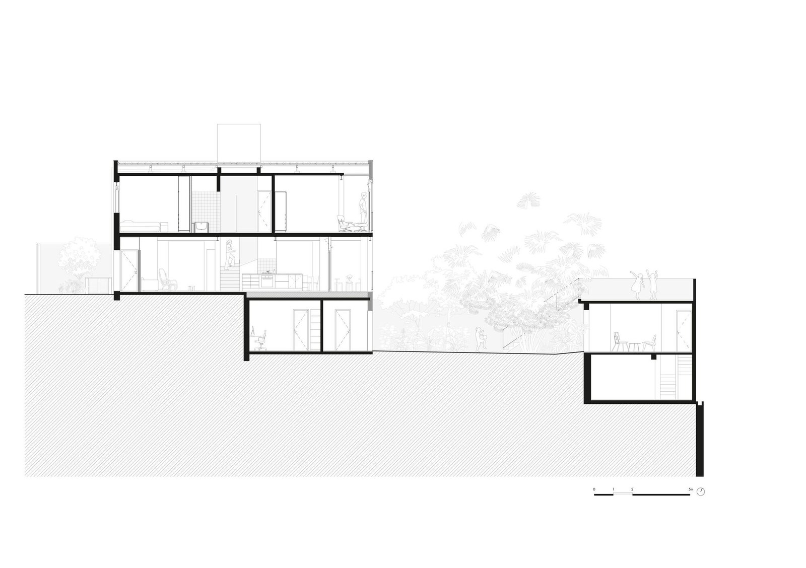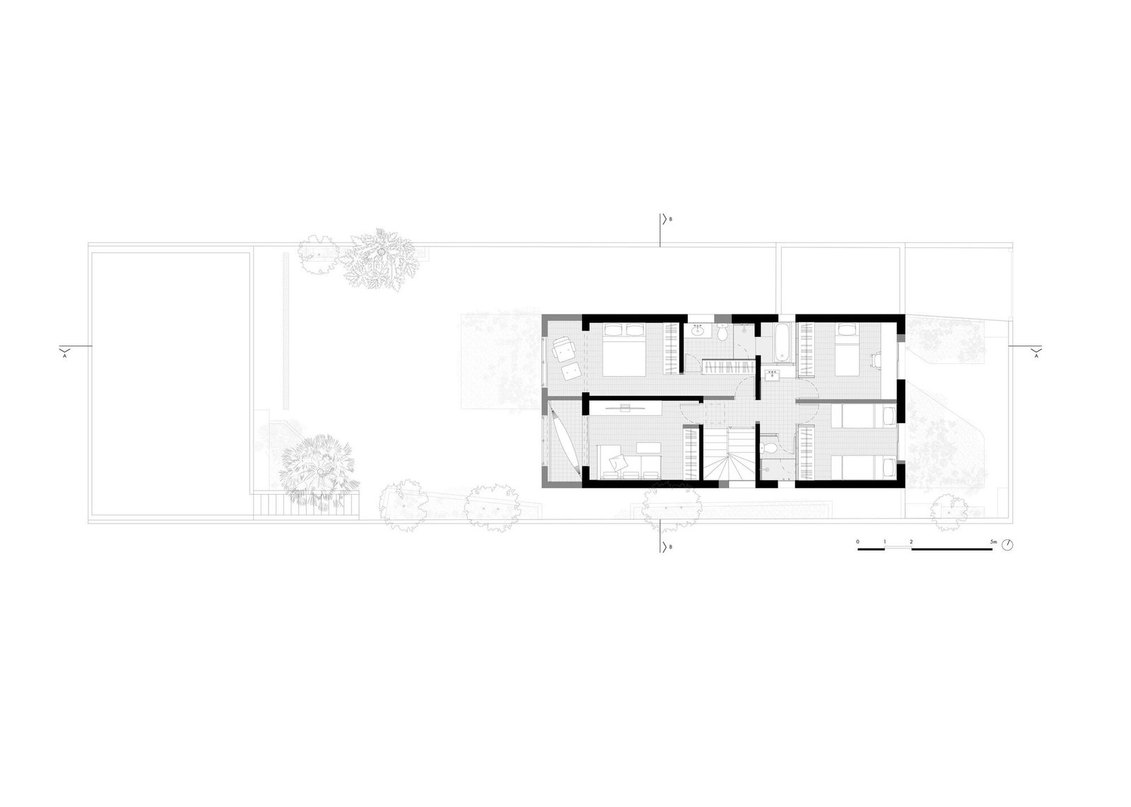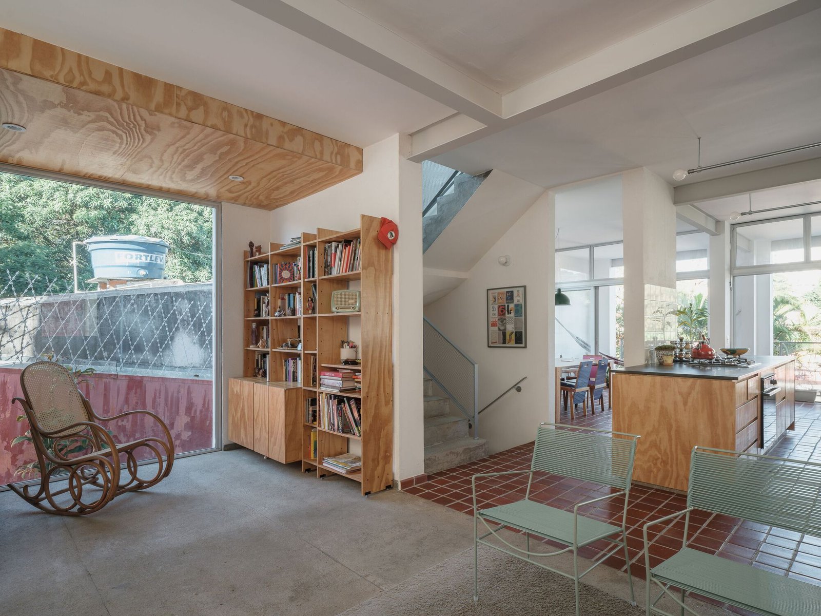 La asignación del programa partió de este entendimiento: en el piso superior, que albergaba las áreas íntimas, se acomodaron cuatro dormitorios, separados por una franja central de circulación y sanitarios. El piso térreo recibió las áreas de uso común y convivencia: sala de estar, biblioteca, cocina y comedor, donde se deseaba la máxima integración.