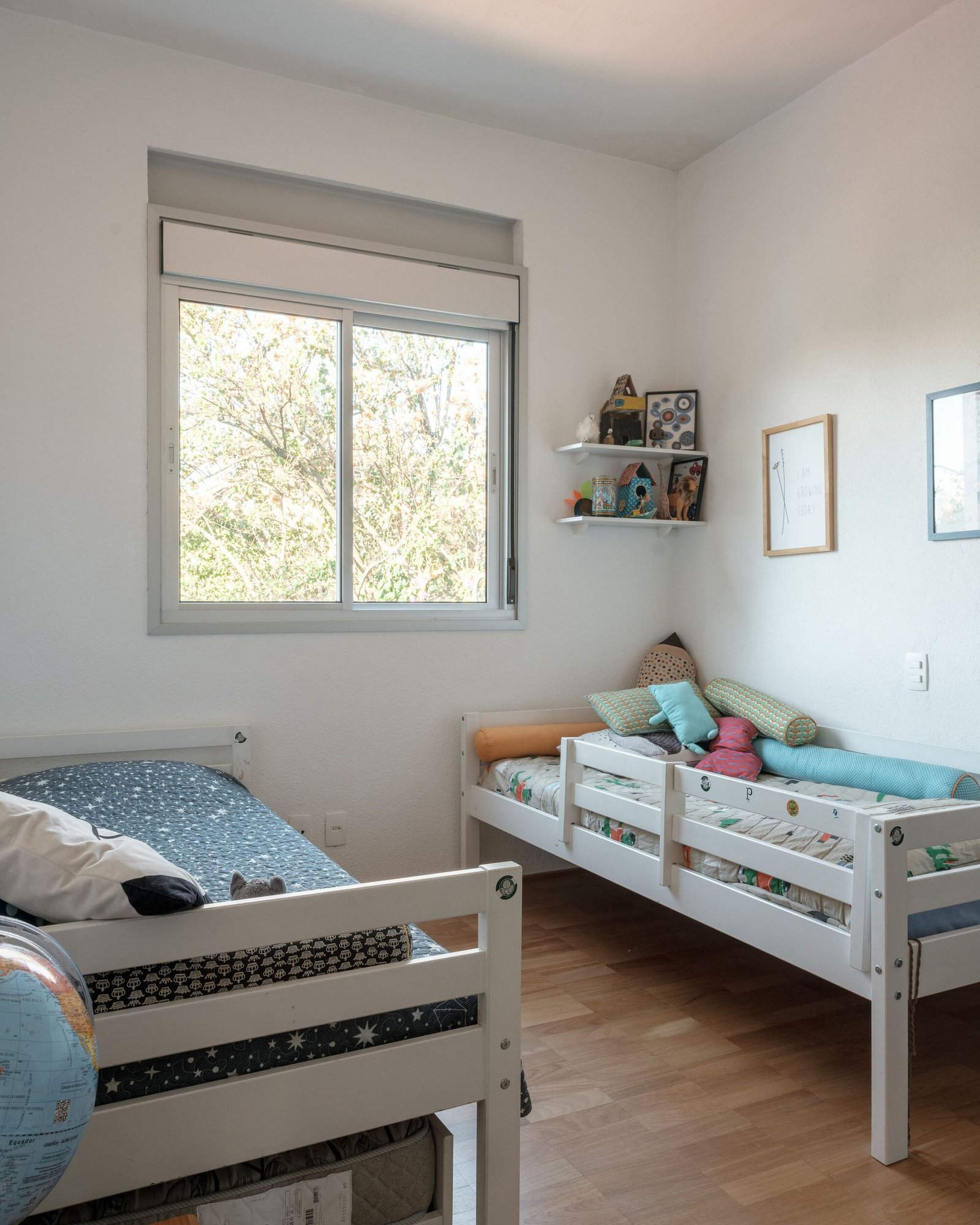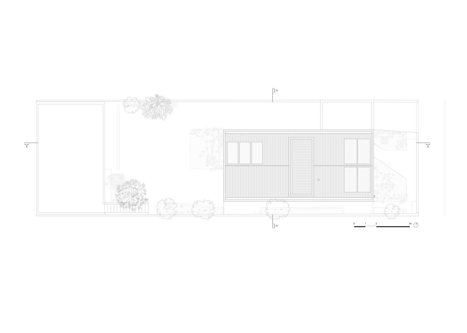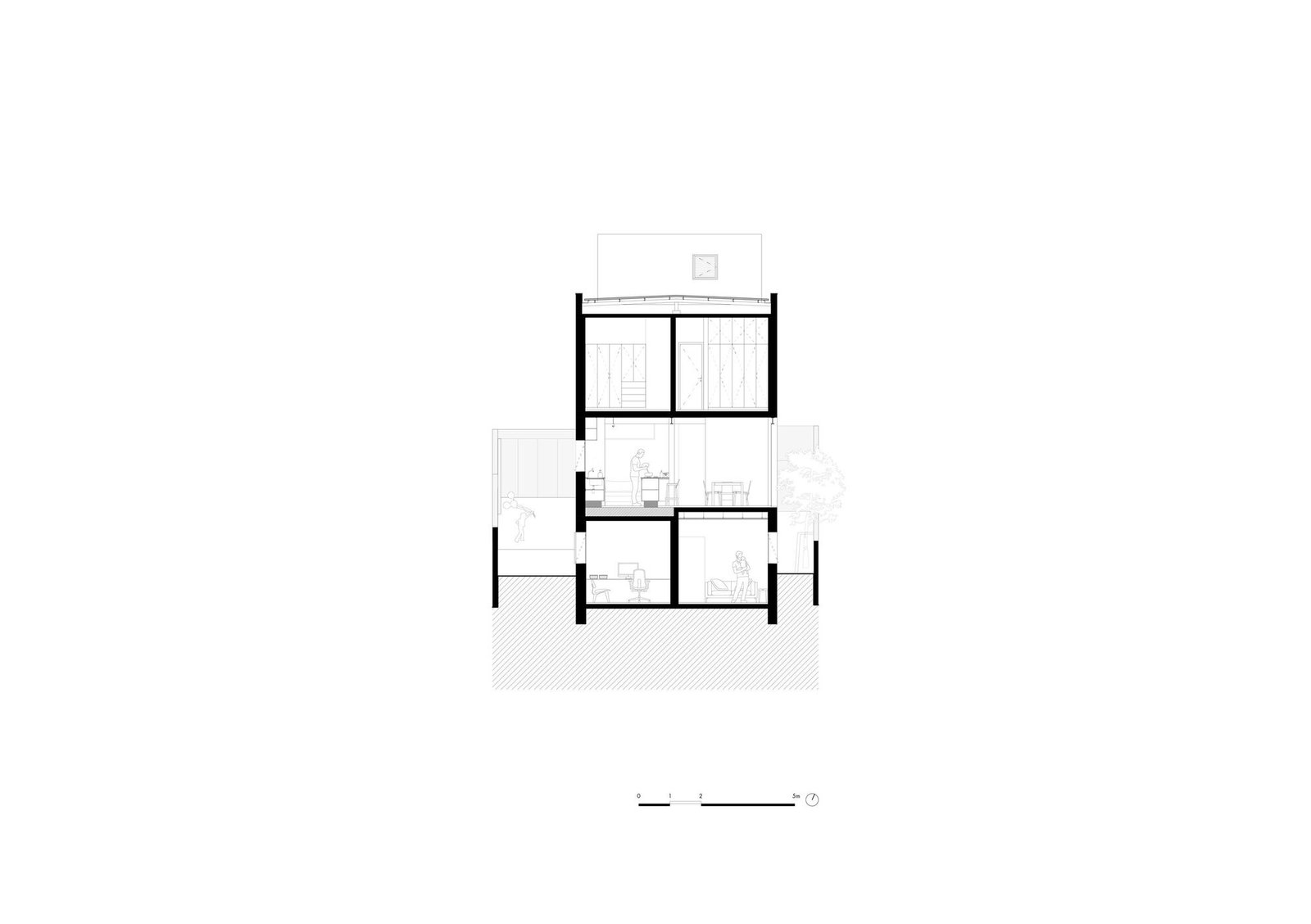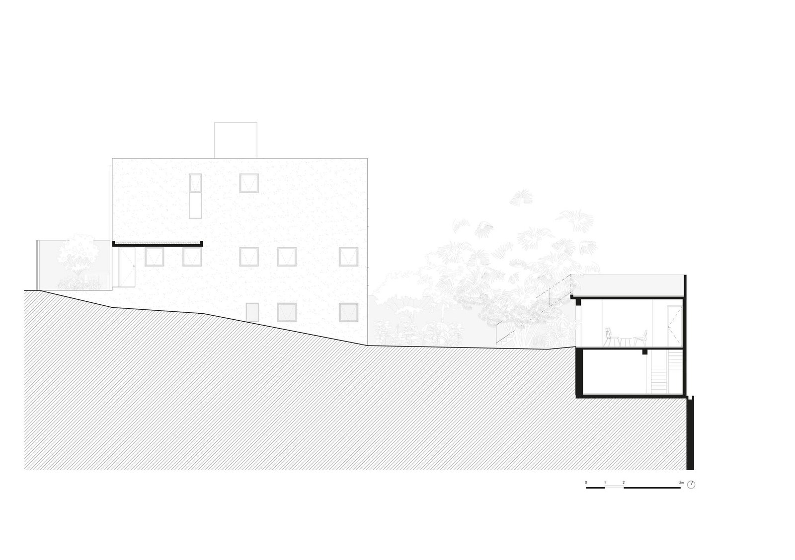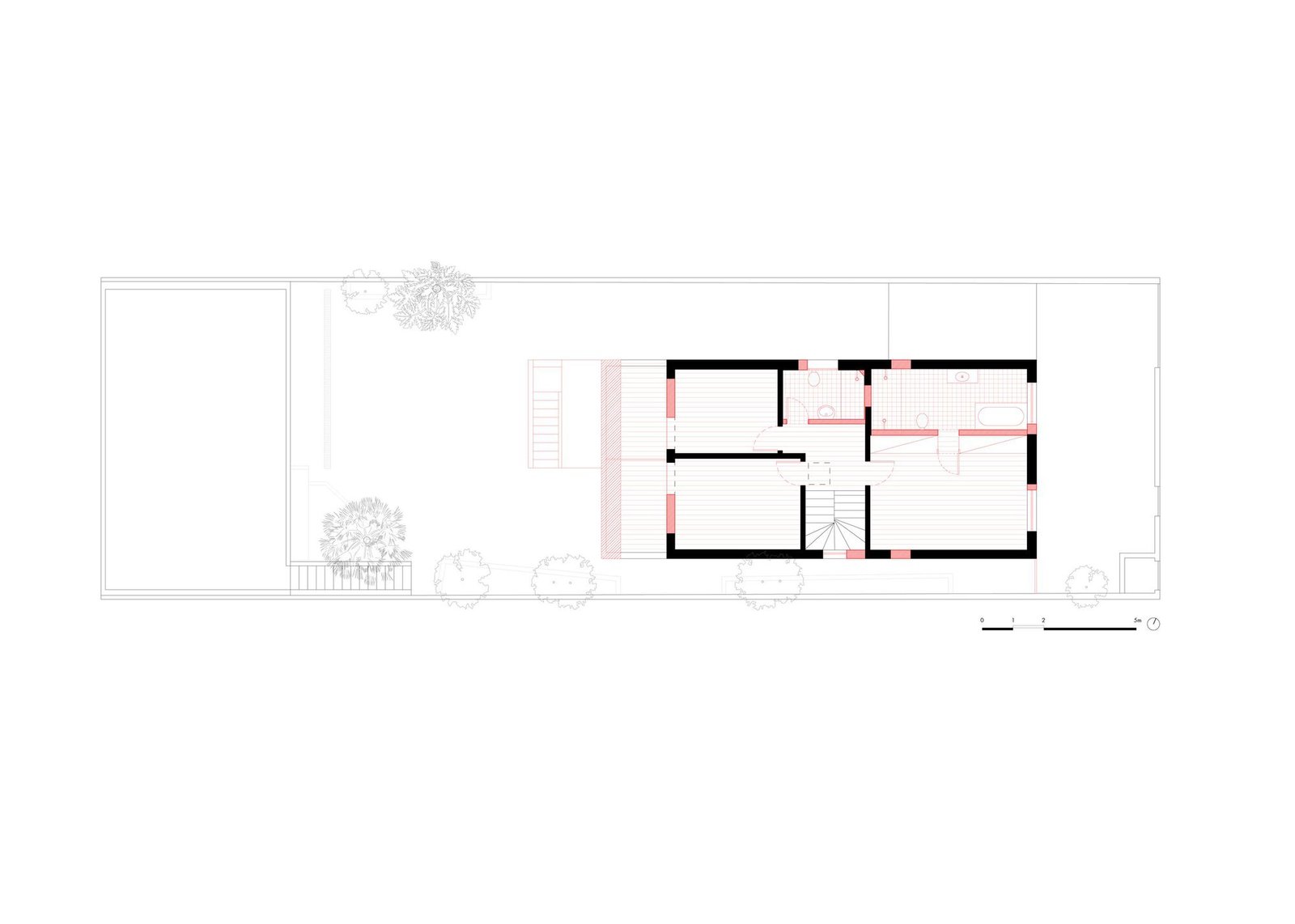 La asignación del programa partió de este entendimiento: en el piso superior, que albergaba las áreas íntimas, se acomodaron cuatro dormitorios, separados por una franja central de circulación y sanitarios. El piso térreo recibió las áreas de uso común y convivencia: sala de estar, biblioteca, cocina y comedor, donde se deseaba la máxima integración.