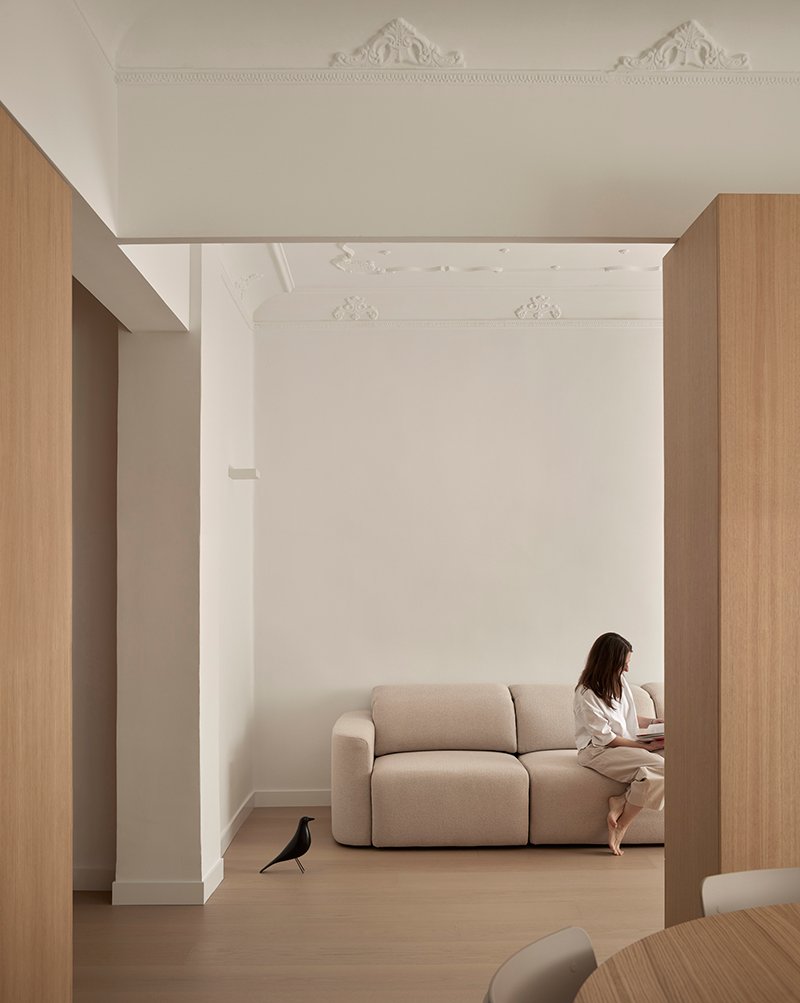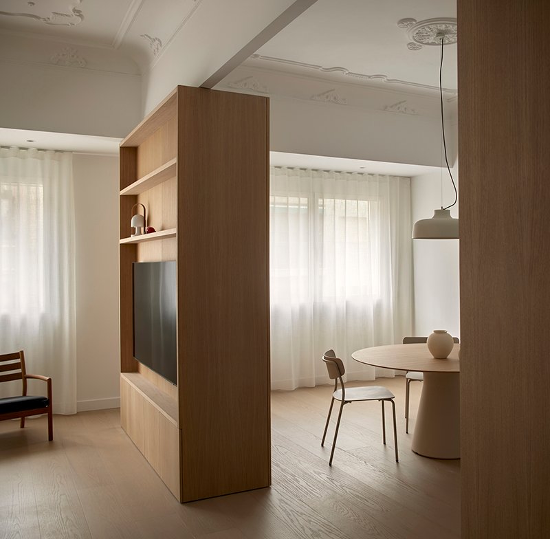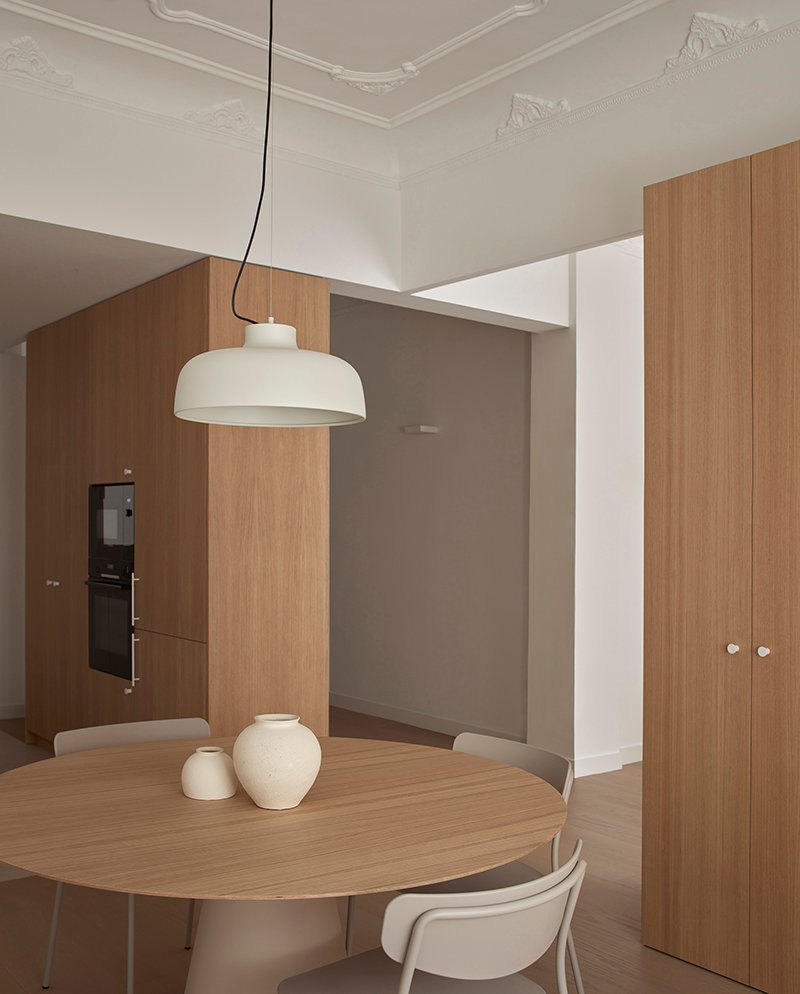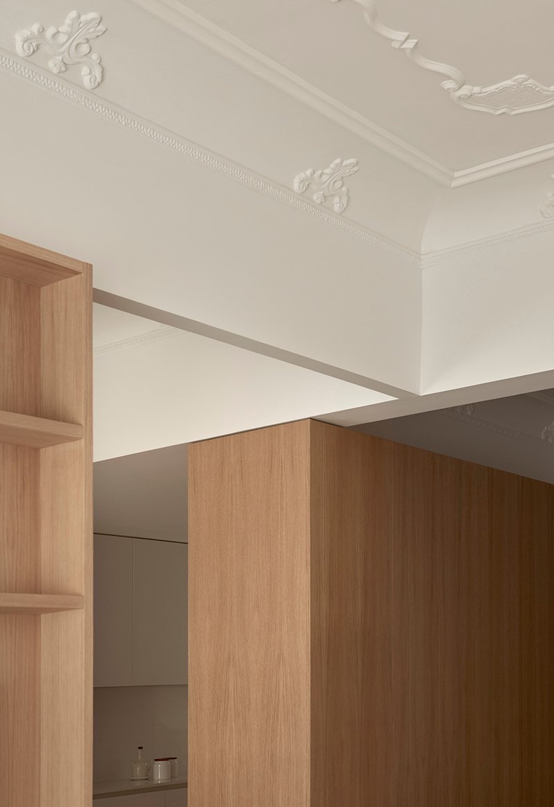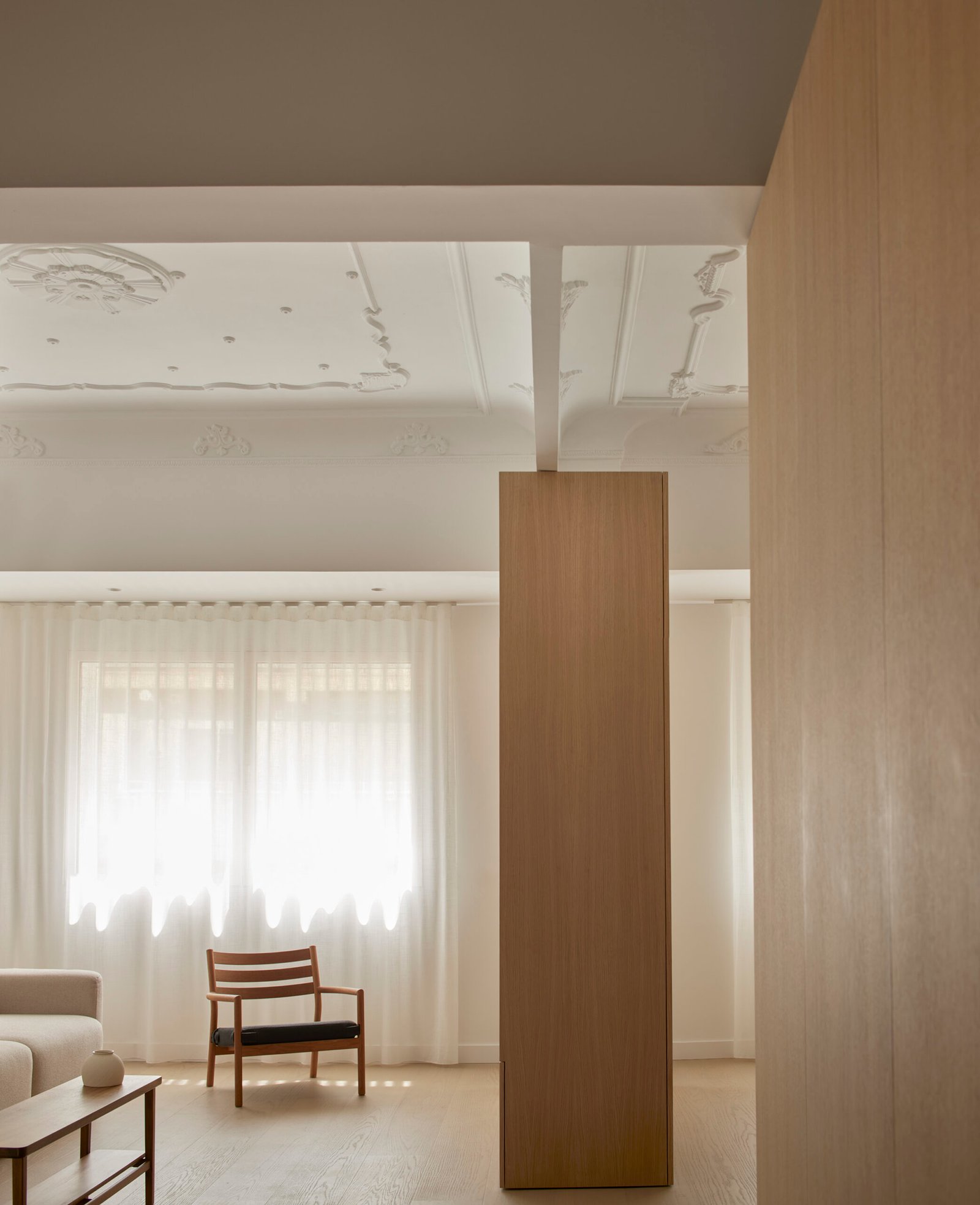 La organización espacial se articula mediante tres volúmenes de roble natural que estructuran la vivienda sin fragmentarla. Estos elementos, potentes pero contenidos, ordenan los distintos usos y aportan calidez al conjunto, reforzada por la continuidad del mismo material en el pavimento. Los volúmenes dialogan con las molduras originales del techo, mientras que los paramentos blancos potencian la luminosidad y subrayan el contraste entre lo existente y lo nuevo.