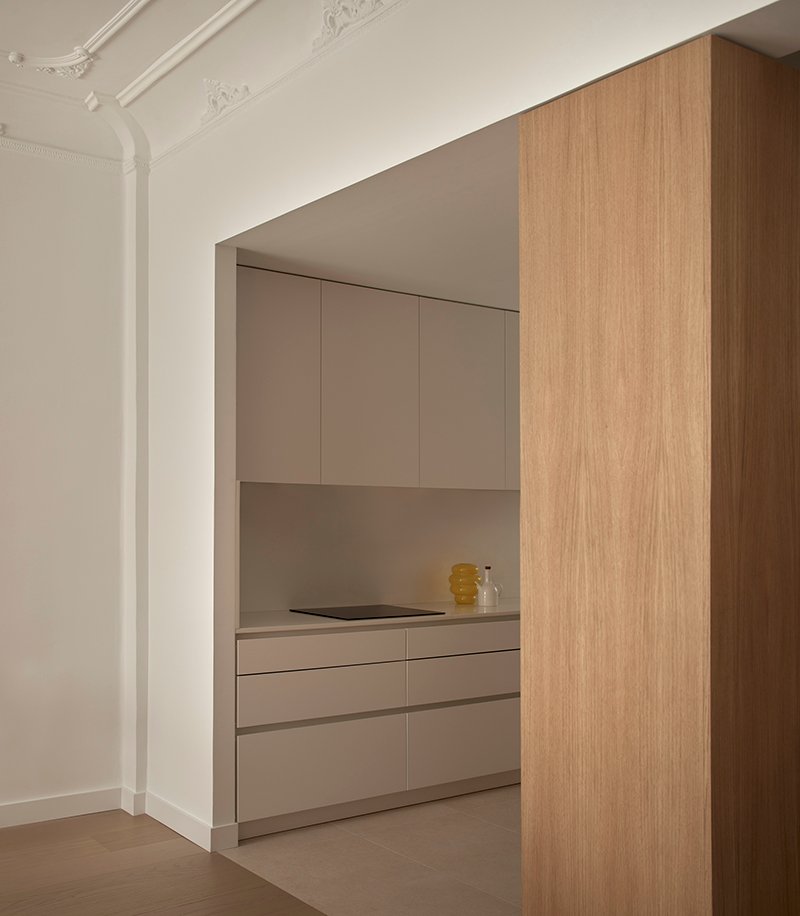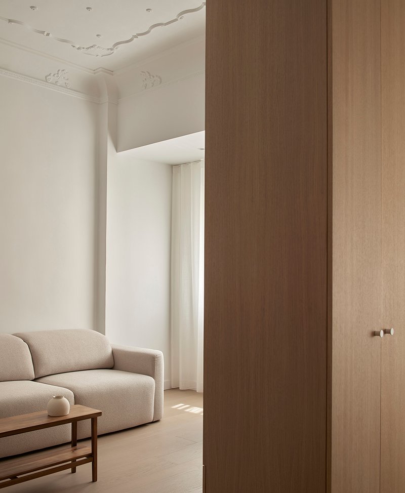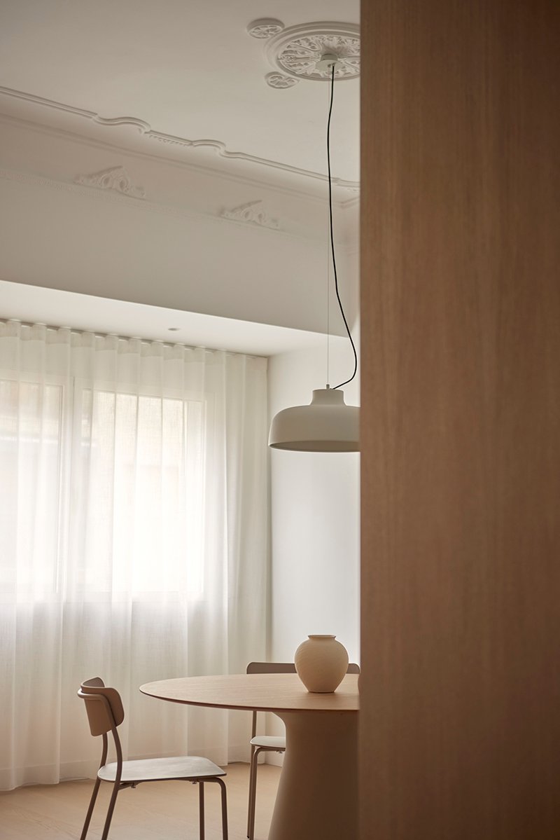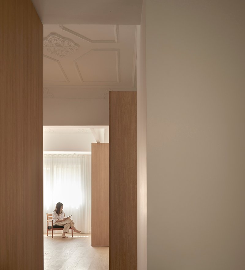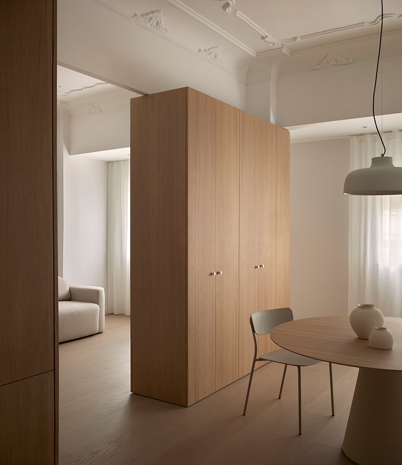 La organización espacial se articula mediante tres volúmenes de roble natural que estructuran la vivienda sin fragmentarla. Estos elementos, potentes pero contenidos, ordenan los distintos usos y aportan calidez al conjunto, reforzada por la continuidad del mismo material en el pavimento. Los volúmenes dialogan con las molduras originales del techo, mientras que los paramentos blancos potencian la luminosidad y subrayan el contraste entre lo existente y lo nuevo.