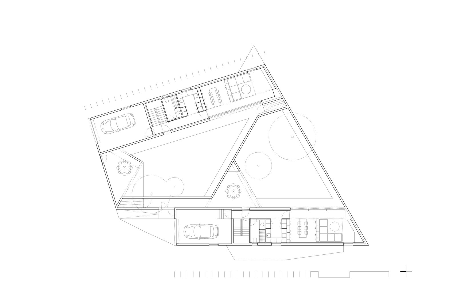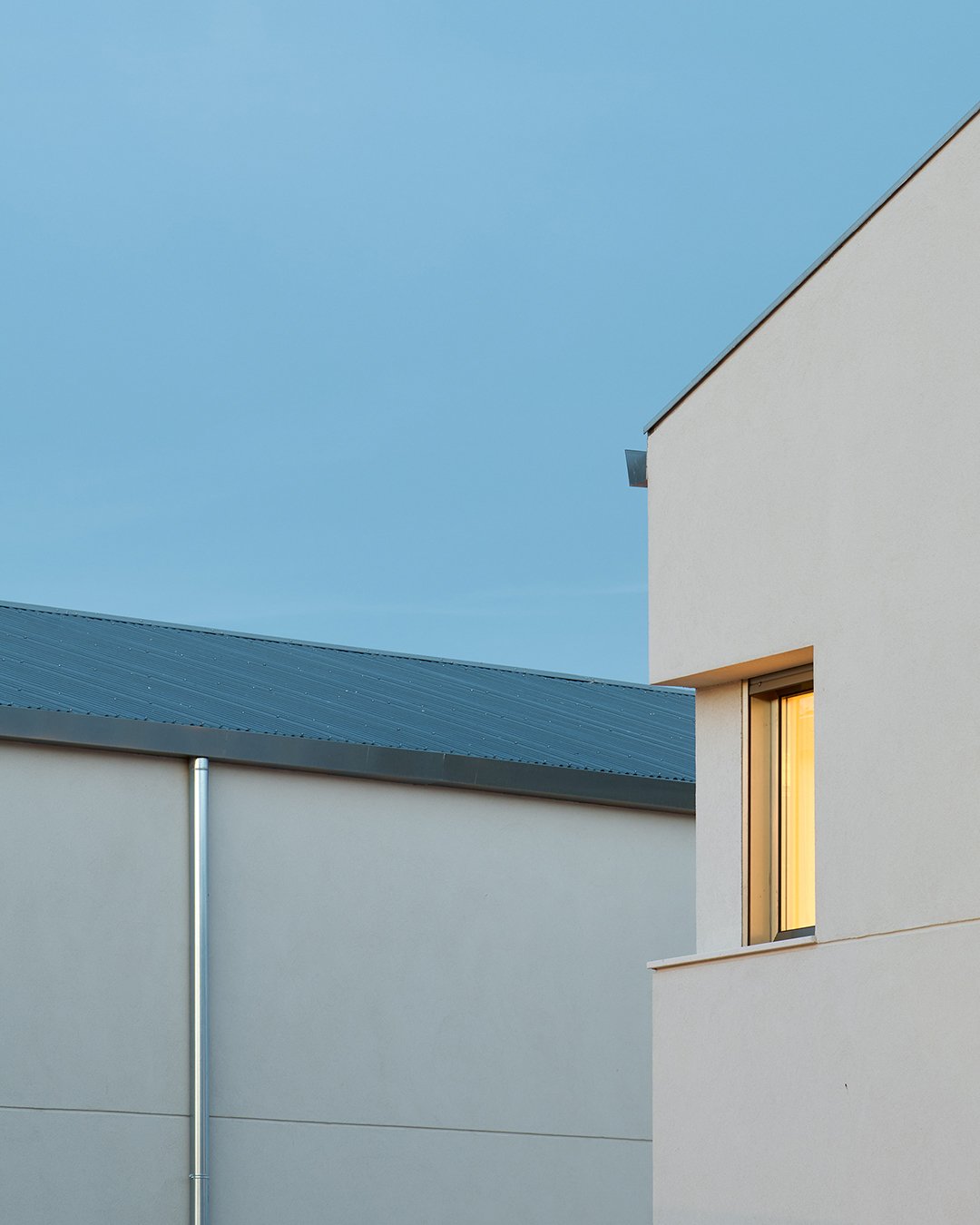 La idea central consiste en armonizar la compleja geometría del solar con una buena orientación y, al mismo tiempo, preservar la intimidad frente a las miradas del entorno. Ambas casas pactan una vecindad discreta: se apoyan en las calles que las bordean, ligeramente abiertas al mediodía, liberando entre ellas un espacio de luz y calma.