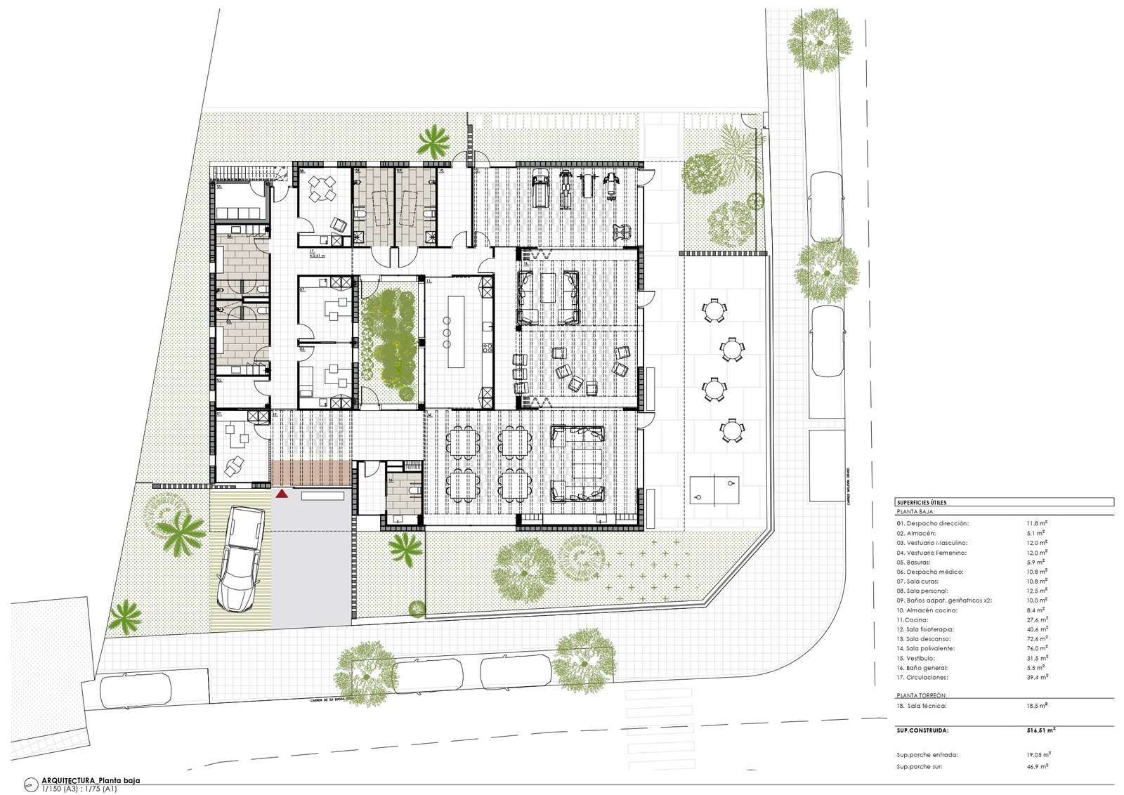 La propuesta arquitectónica para la construcción del nuevo centro de día en Alaior (Menorca) concebido para 30 usuarios, se materializa como un edificio de tipología compacta, de planta baja y geometría rectangular organizado en torno a un patio ajardinado central que actúa como eje vertebrador del proyecto.