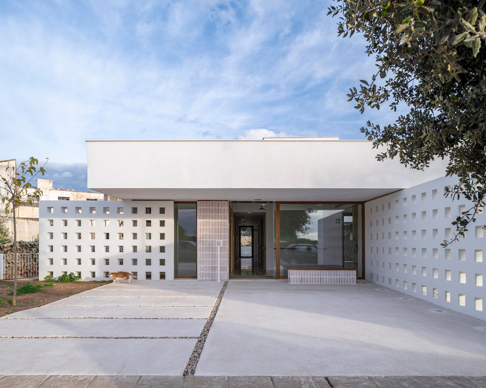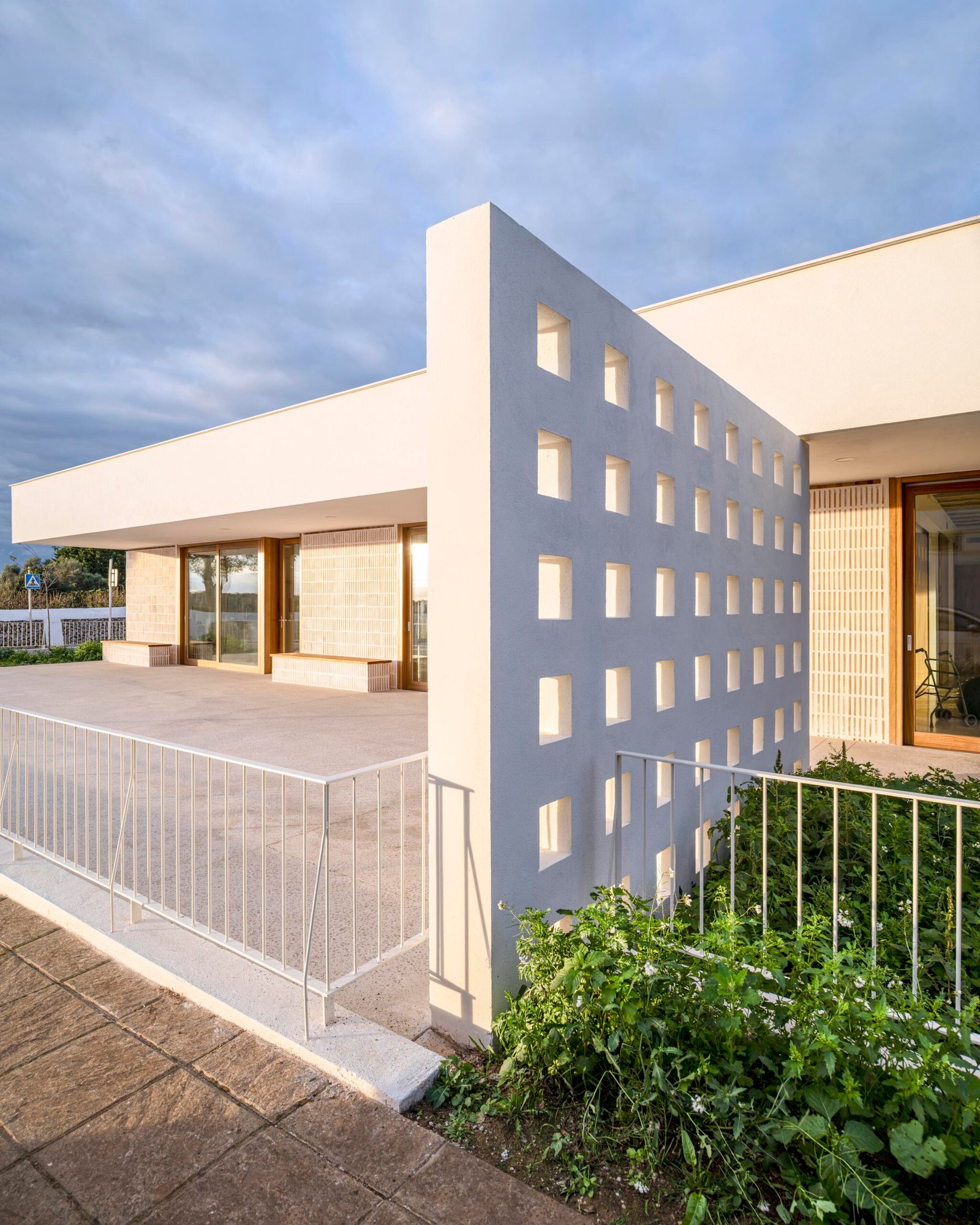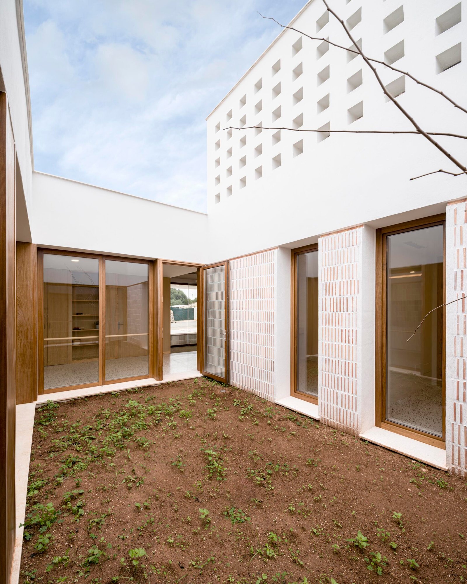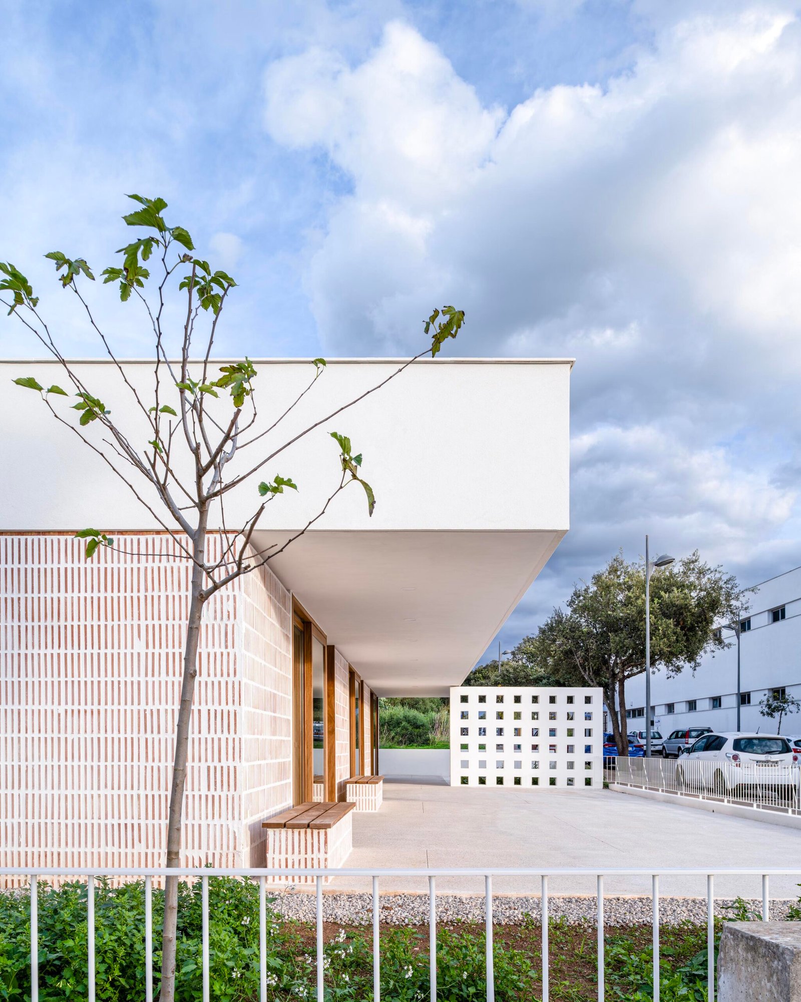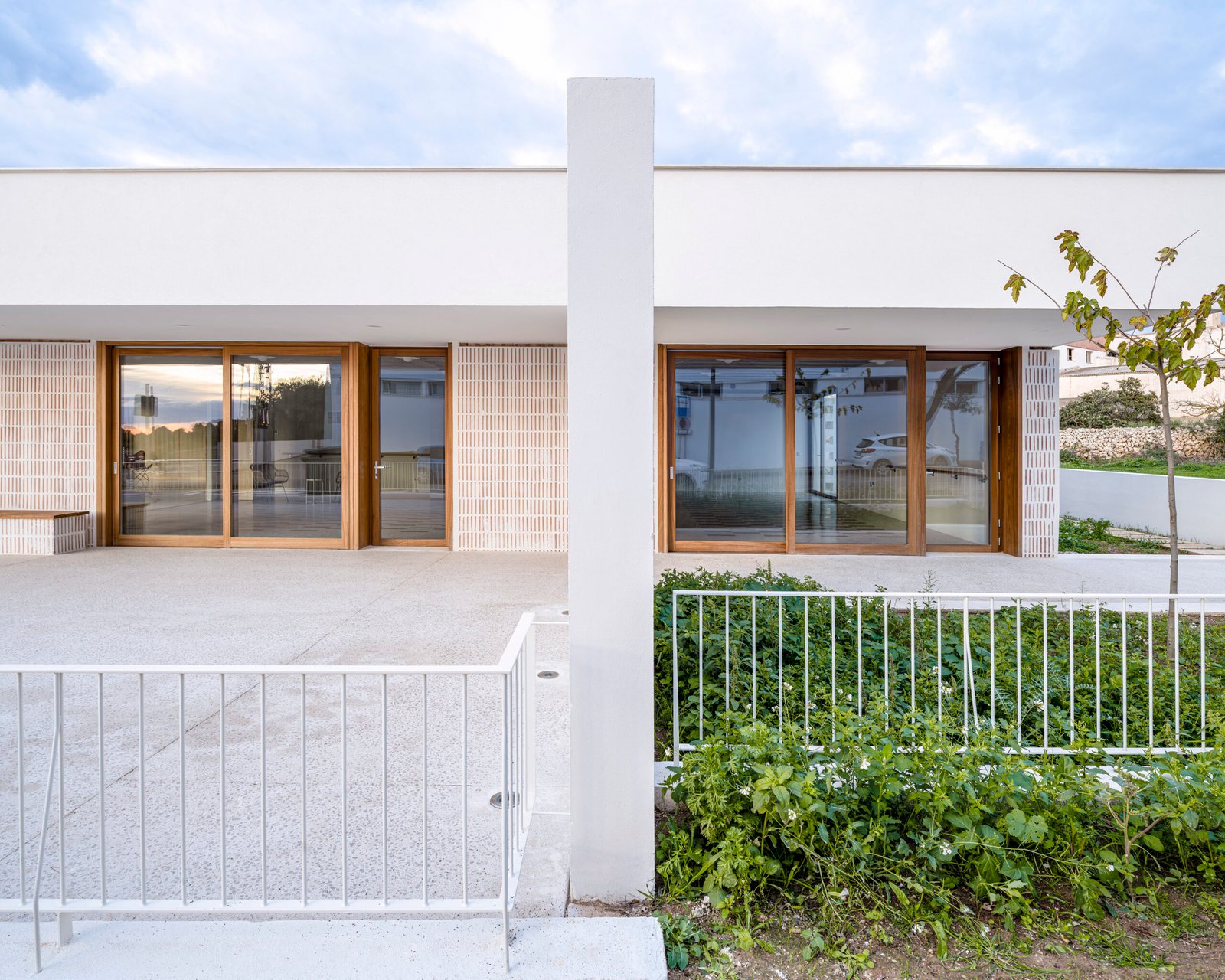 La fachada muraria, ejecutada con bloques de termoarcilla, recupera la tonalidad cerámica puntual tan presente en las edificaciones tradicionales de Alaior, sin renunciar a la arquitectura blanca característica de la isla. Este tratamiento material aporta un contrapunto sutil a la marcada horizontalidad del volumen y facilita su correcta inserción en el tejido construido, ajustando la escala del edificio al entorno inmediato. La carpintería de madera, refuerza este carácter popular de las edificaciones del municipio.