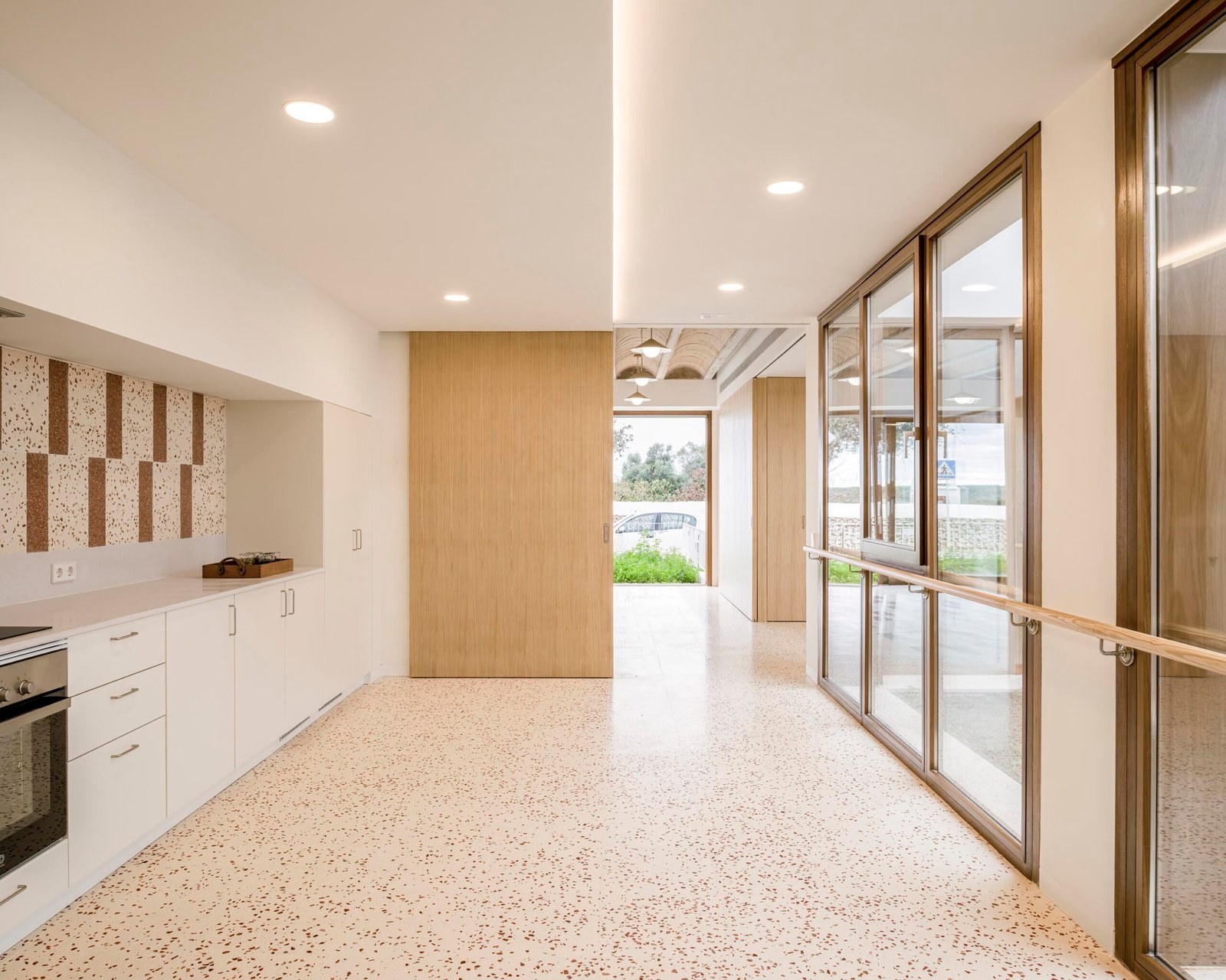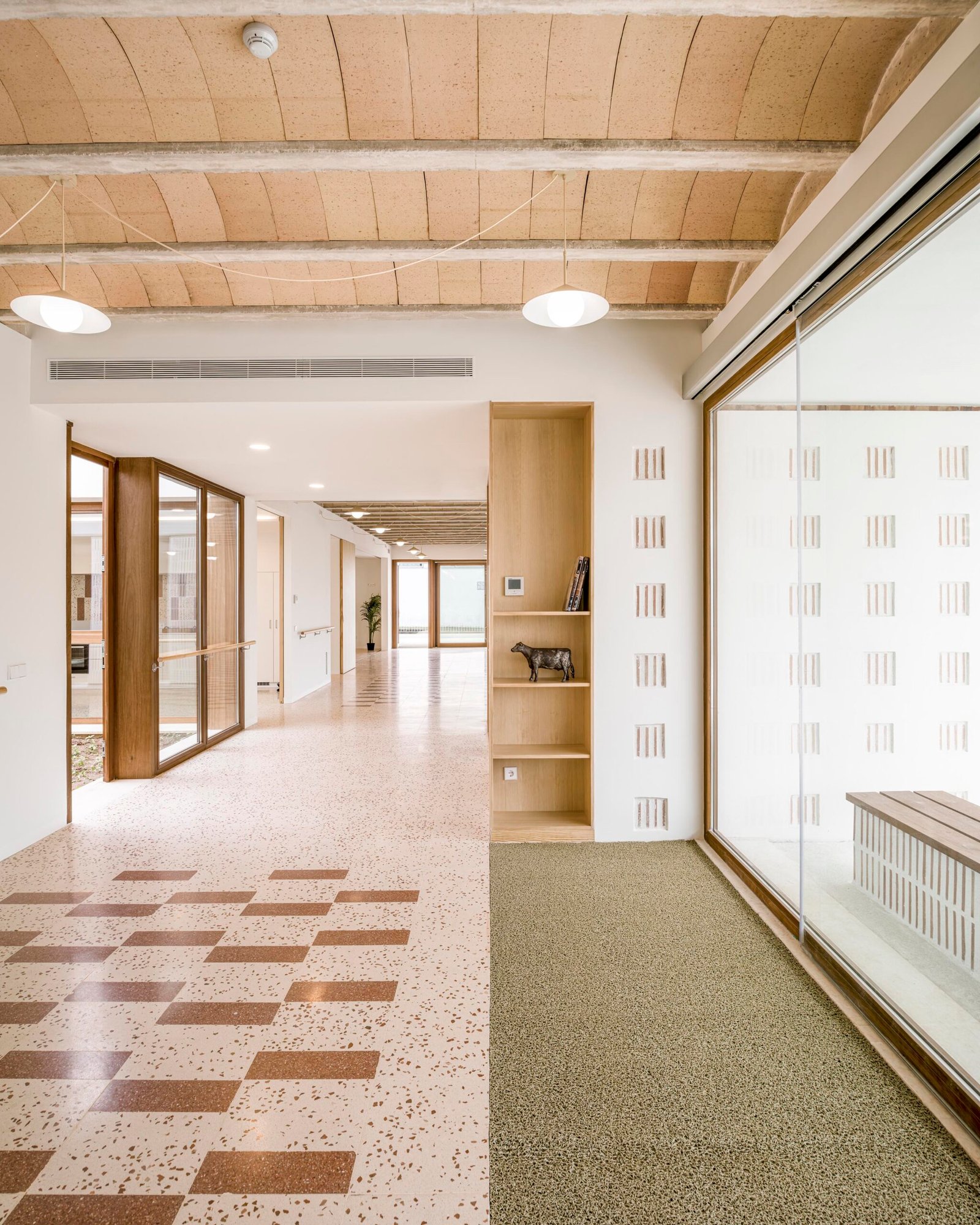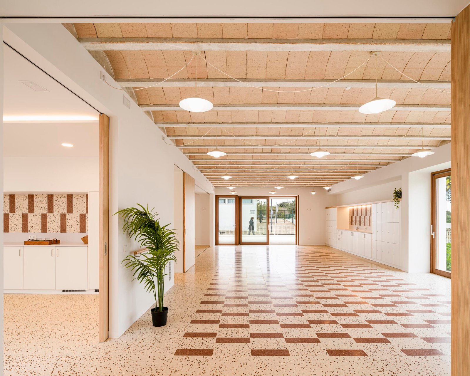 Los tres espacios principales, orientados a sur, poseen, además, la capacidad de unificarse en un único ámbito continuo, permitiendo acoger actividades de mayor escala y adaptarse con flexibilidad a las distintas necesidades del centro. Estos espacios, destacan en su interior, al dejar vista la estructura de bovedillas cerámicas y los suelos “alfombrados” de terrazo.