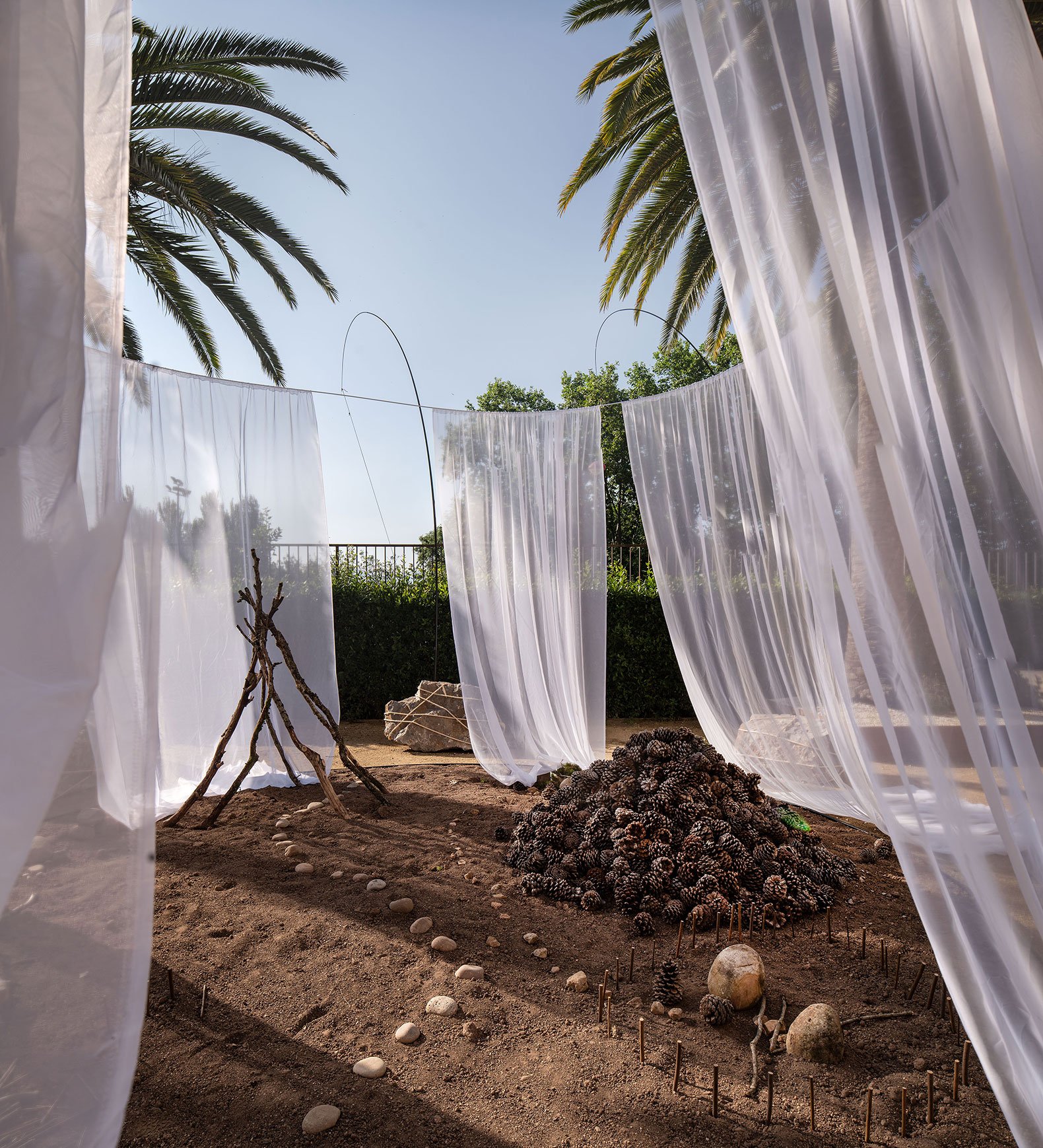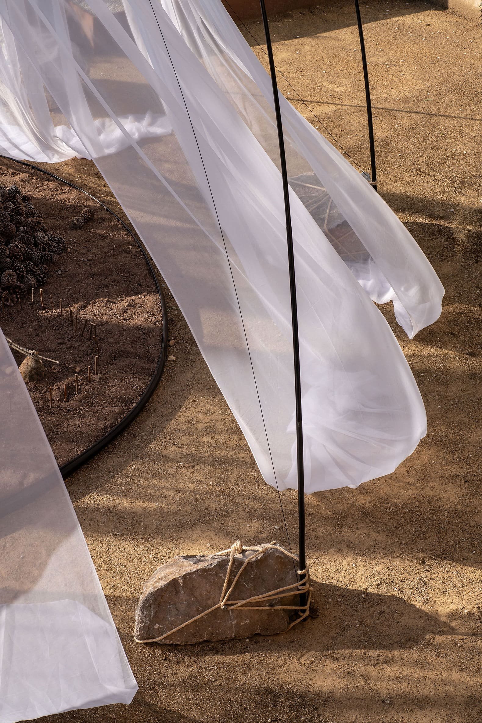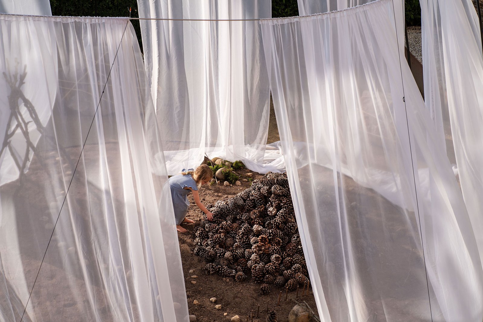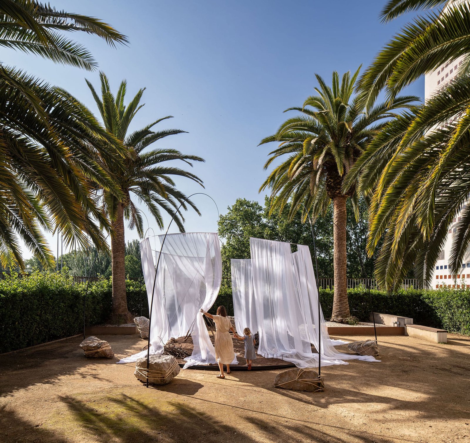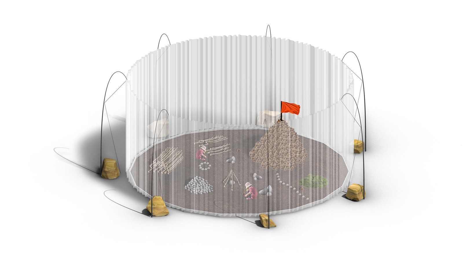 Trabajamos con piezas sueltas, elementos abstractos y abiertos, dentro de un paisaje fijo. Juntos crean una instalación visualmente rica que despierta alegría y curiosidad.