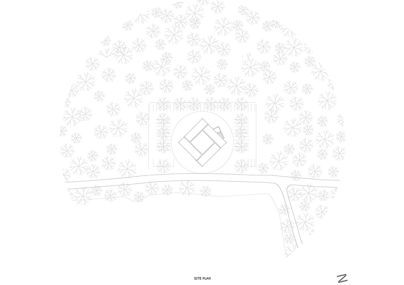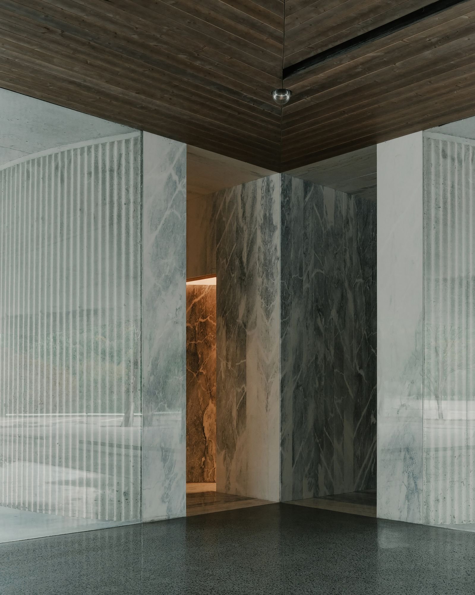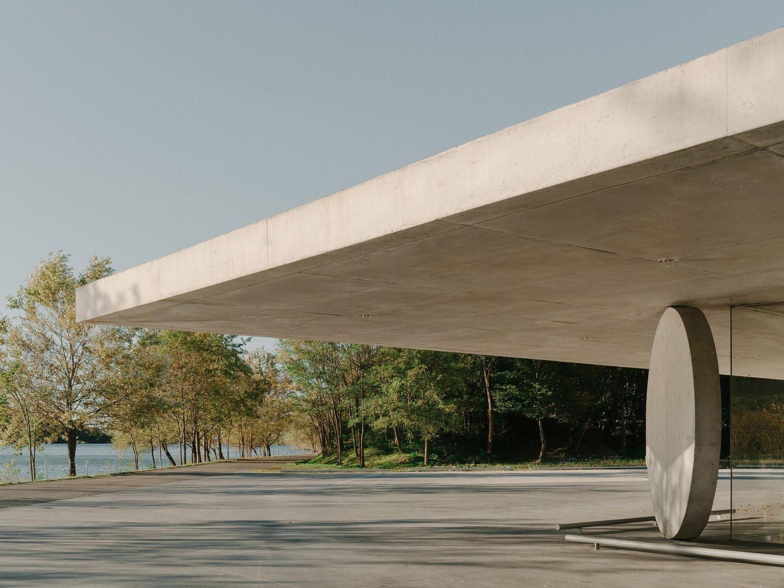 Los límites entre interior y exterior se diluyen; el pabellón respira con su paisaje. Bajo una cubierta de hormigón flotante, las zonas abiertas y cubiertas se fusionan en un sistema fluido que permite la ventilación natural. Bajo la cubierta se sitúan el área de recepción, los aseos para los huéspedes, los espacios de servicio y la oficina administrativa, esta última discretamente separada para garantizar tanto la eficiencia operativa como la tranquilidad de los visitantes.