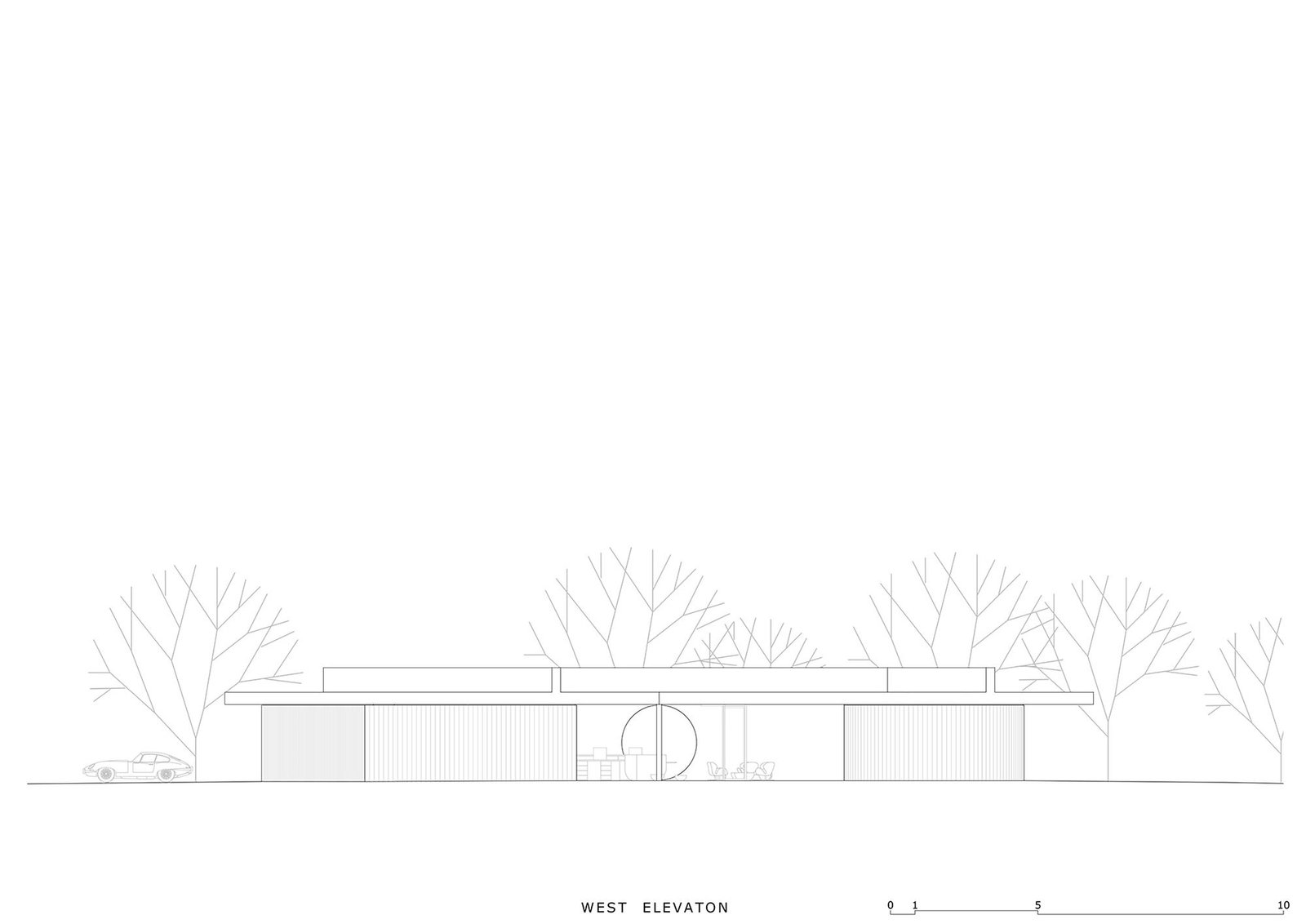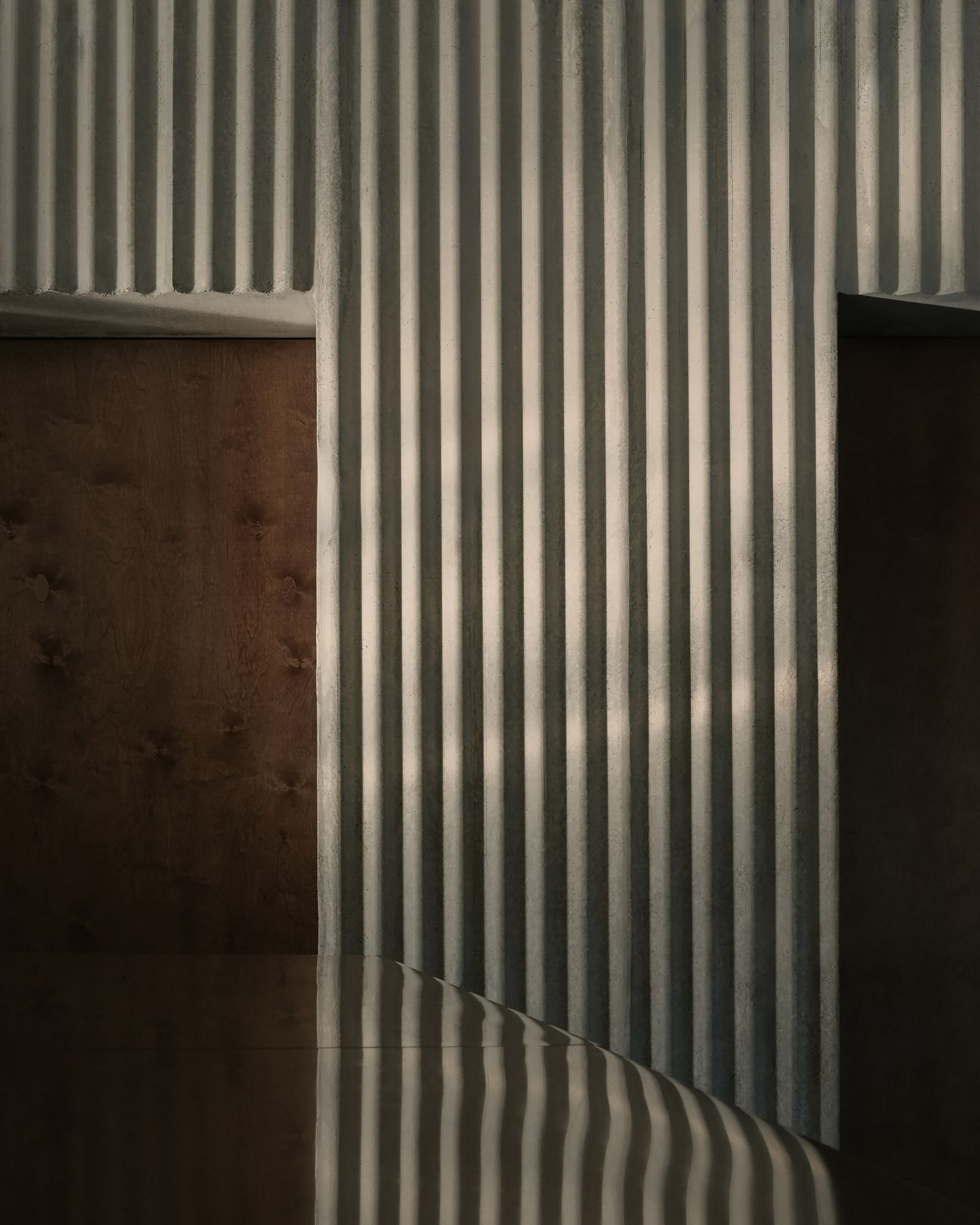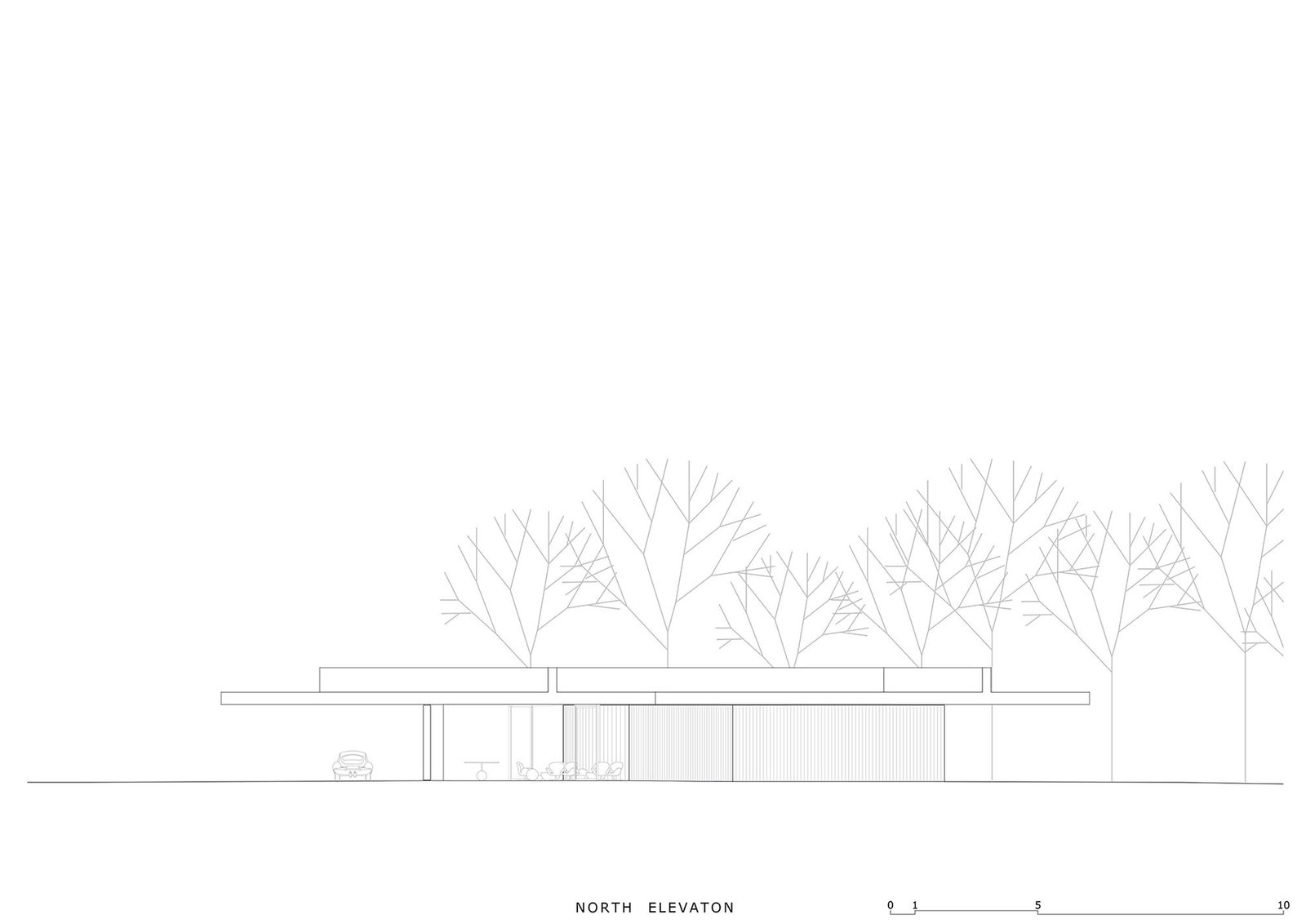 Los límites entre interior y exterior se diluyen; el pabellón respira con su paisaje. Bajo una cubierta de hormigón flotante, las zonas abiertas y cubiertas se fusionan en un sistema fluido que permite la ventilación natural. Bajo la cubierta se sitúan el área de recepción, los aseos para los huéspedes, los espacios de servicio y la oficina administrativa, esta última discretamente separada para garantizar tanto la eficiencia operativa como la tranquilidad de los visitantes.