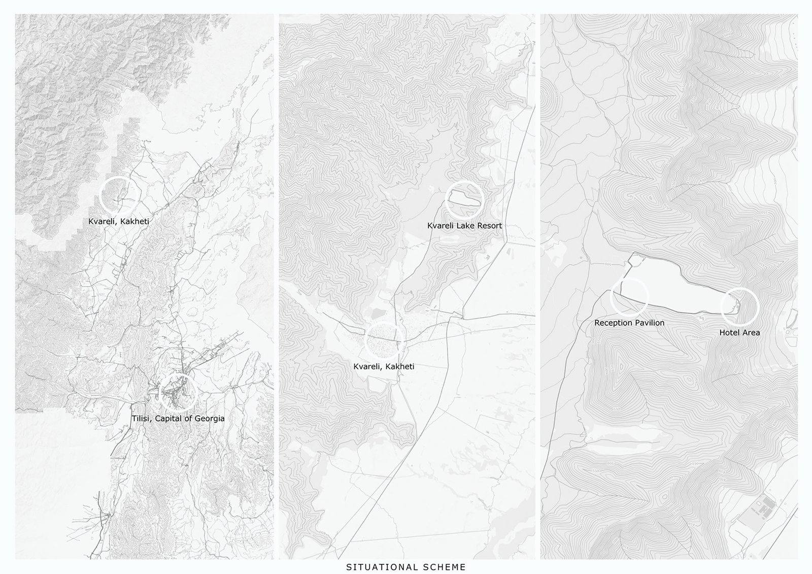 Ubicado en Kajetia, al este de Georgia, junto a la joya del lago Kvareli —una cuenca natural abrazada por montañas—, el pabellón marca la línea de encuentro entre el bosque y el agua. Funciona como edificio de recepción de un resort: los huéspedes llegan, dejan sus coches y realizan la transición hacia un transporte ecológico que los conduce al hotel. La arquitectura actúa como mediadora entre la serenidad del lago y la densidad del bosque.