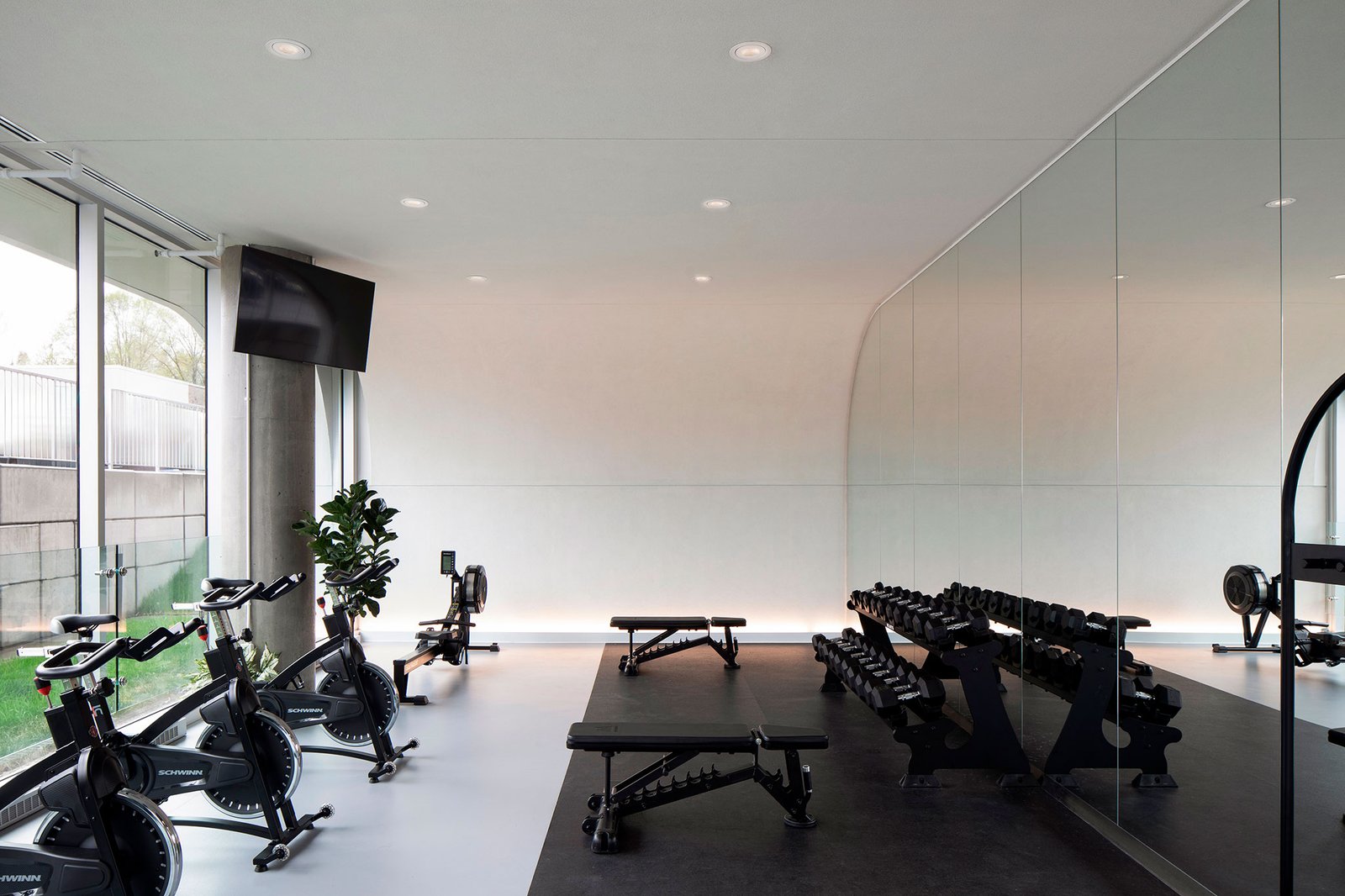 En el interior, ACDF diseñó las zonas comunes con el mismo equilibrio que define el proyecto en su conjunto. Los arcos se extienden hacia el interior, dando forma a zonas temáticas más íntimas, a la vez que marcan un paseo longitudinal que conecta, de extremo a extremo, el espacio de coworking y la cocina común con el gimnasio.