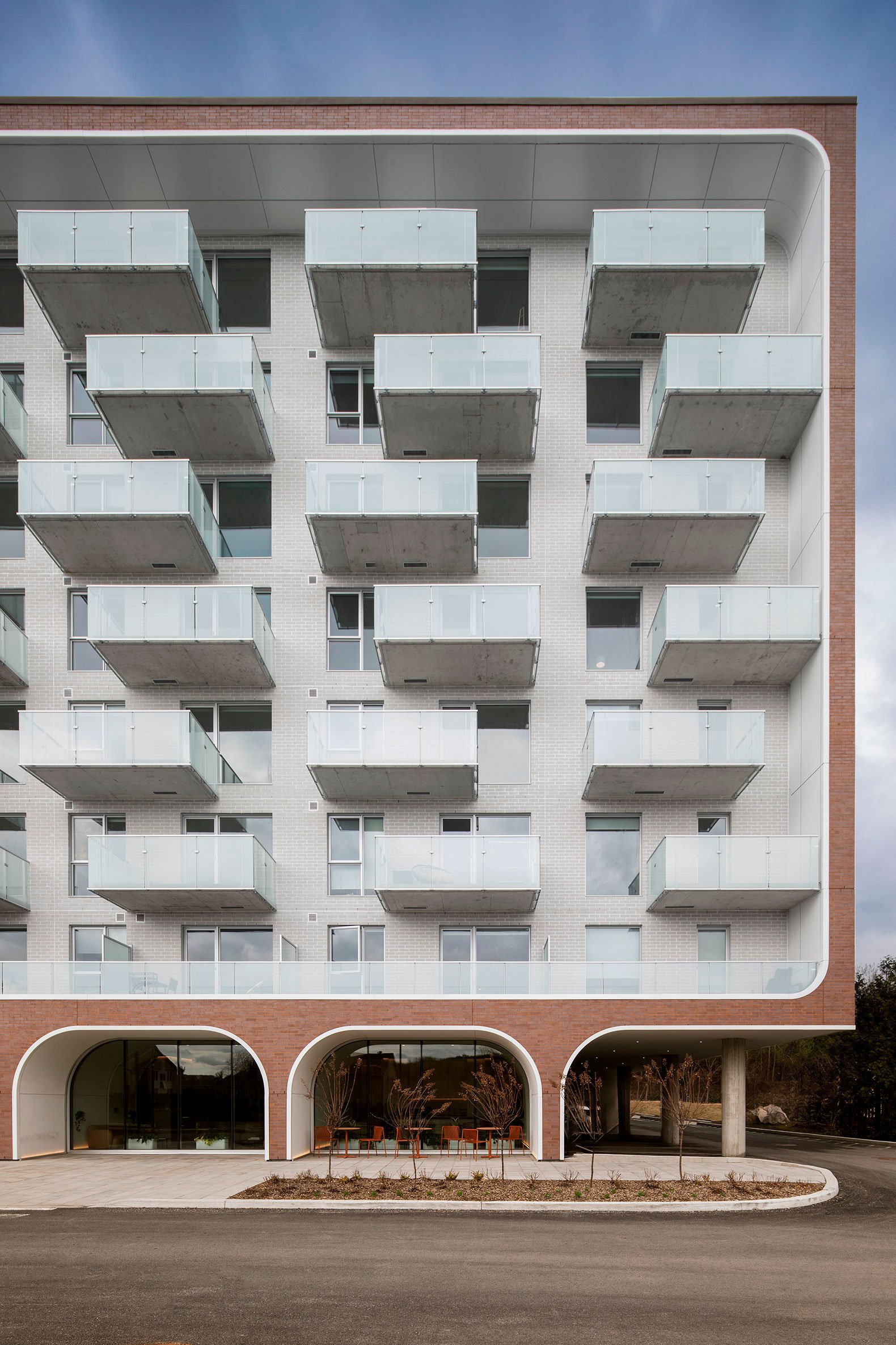 La geometría arqueada se extiende a través de una serie de curvas integradas en el volumen general del edificio. Estas líneas fluidas definen una silueta distintiva, donde las transiciones entre el ladrillo rojo y el blanco se leen como una fina costura de alta costura, uniendo los diversos componentes del proyecto. Este perfil distintivo afirma la presencia del edificio a escala de la ciudad, a la vez que mantiene una refinada intimidad humana a nivel de calle.