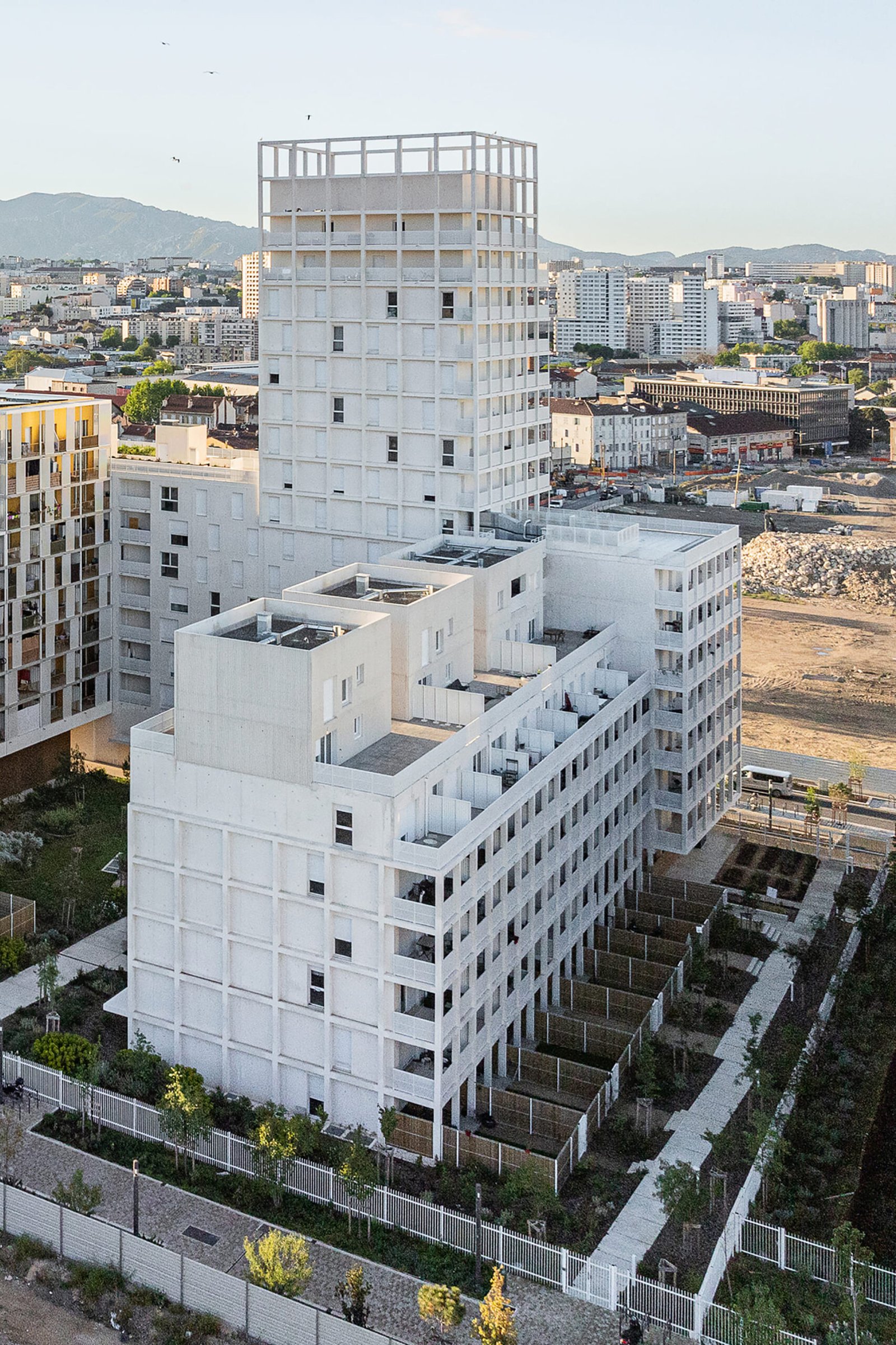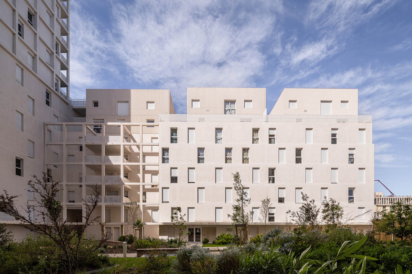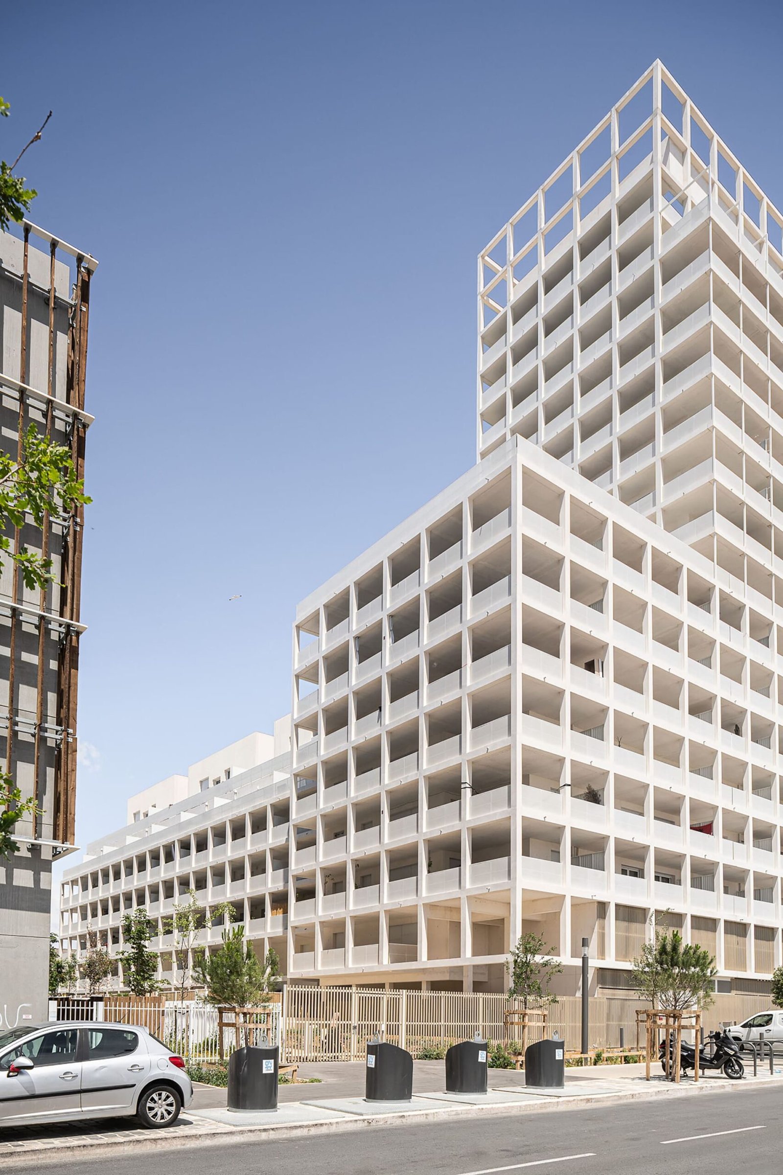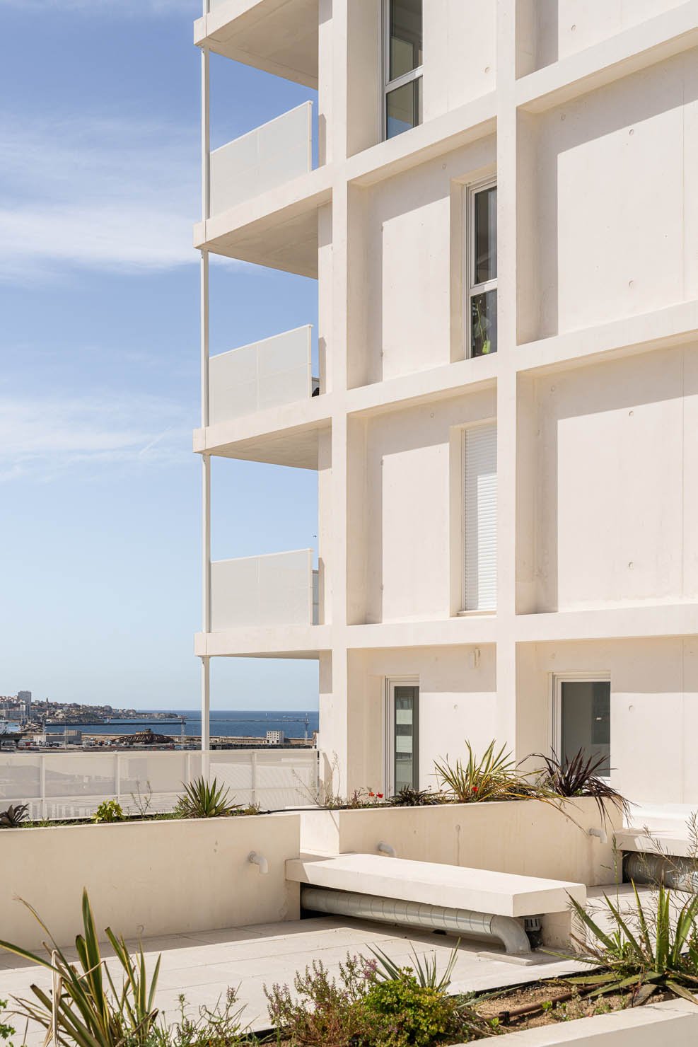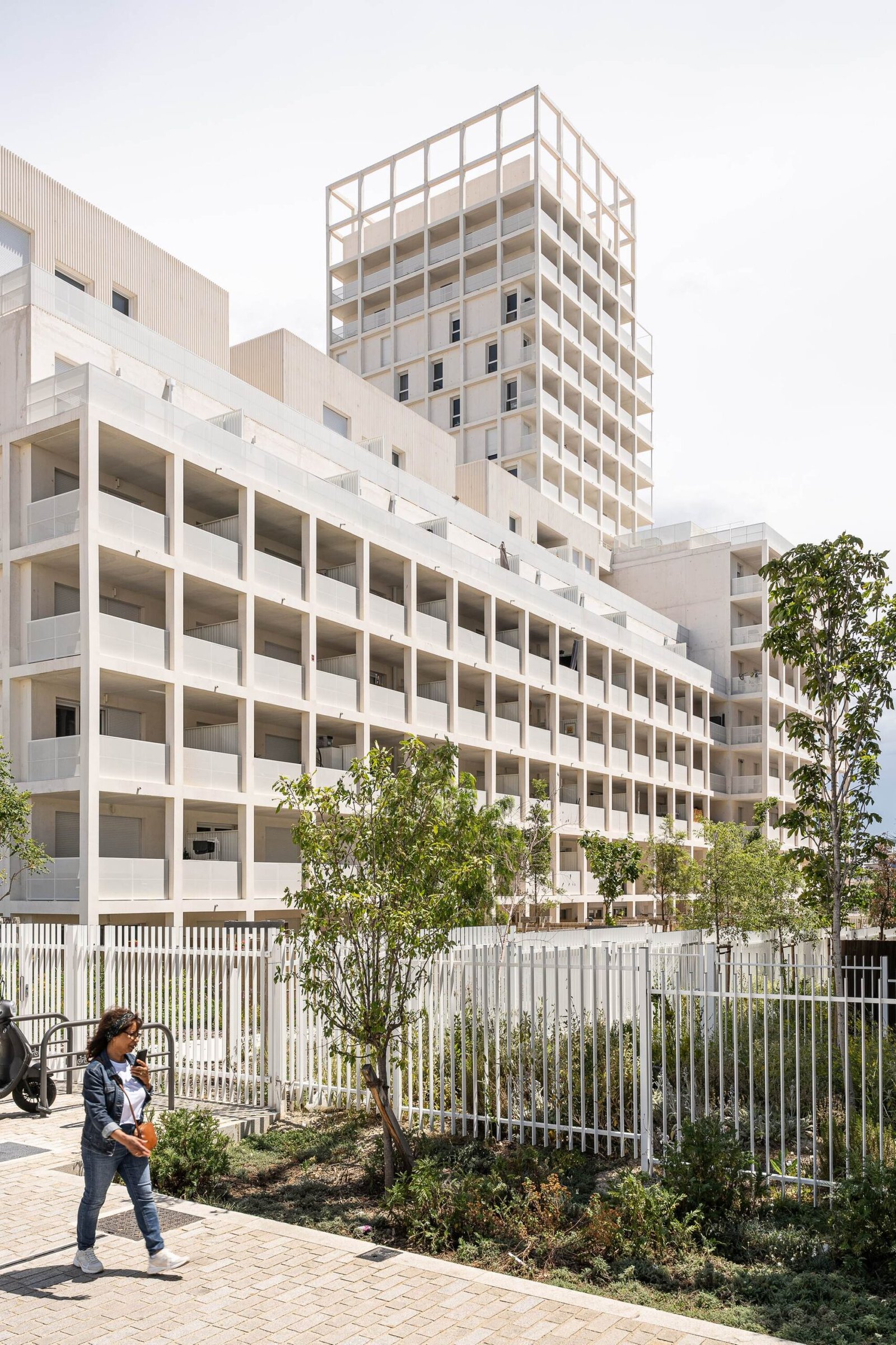 El proyecto también combina tres expresiones arquitectónicas que resuenan con los desafíos urbanos del barrio. La primera, una cuadrícula estructural en hormigón blanco, es una expresión de una identidad mediterránea, evocando espesor y sombra, porosidad, ritmos y enmarcando el gran paisaje.