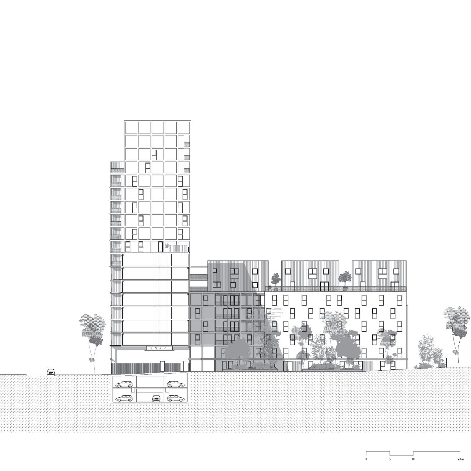 Alpha refleja las dos escalas del sitio: la escala urbana del nuevo barrio, conectado a las Crottes y la Rue de Lyon, y la escala del vasto paisaje mediterráneo, que la torre de 15 pisos enmarcará, ofreciendo vistas de 360 grados del área circundante.