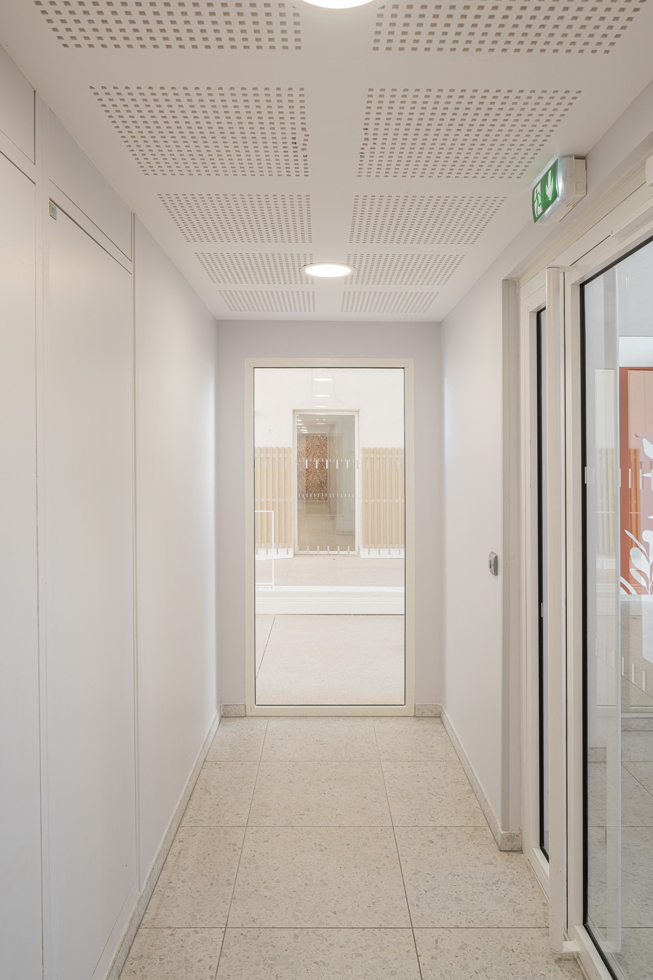 Los accesos se destacan a través de tres pasajes que distribuyen los salones y conectan con el jardín interior. El trabajo de paisajismo (huerto, terrazas verdes, jardín interior) permitió prestar especial atención a los espacios de circulación, los límites y la integración en el rico ecosistema holístico del área comercial. La envolvente de hormigón blanco de bajas emisiones de carbono nos permitió explorar diferentes secuencias y formas de habitar.