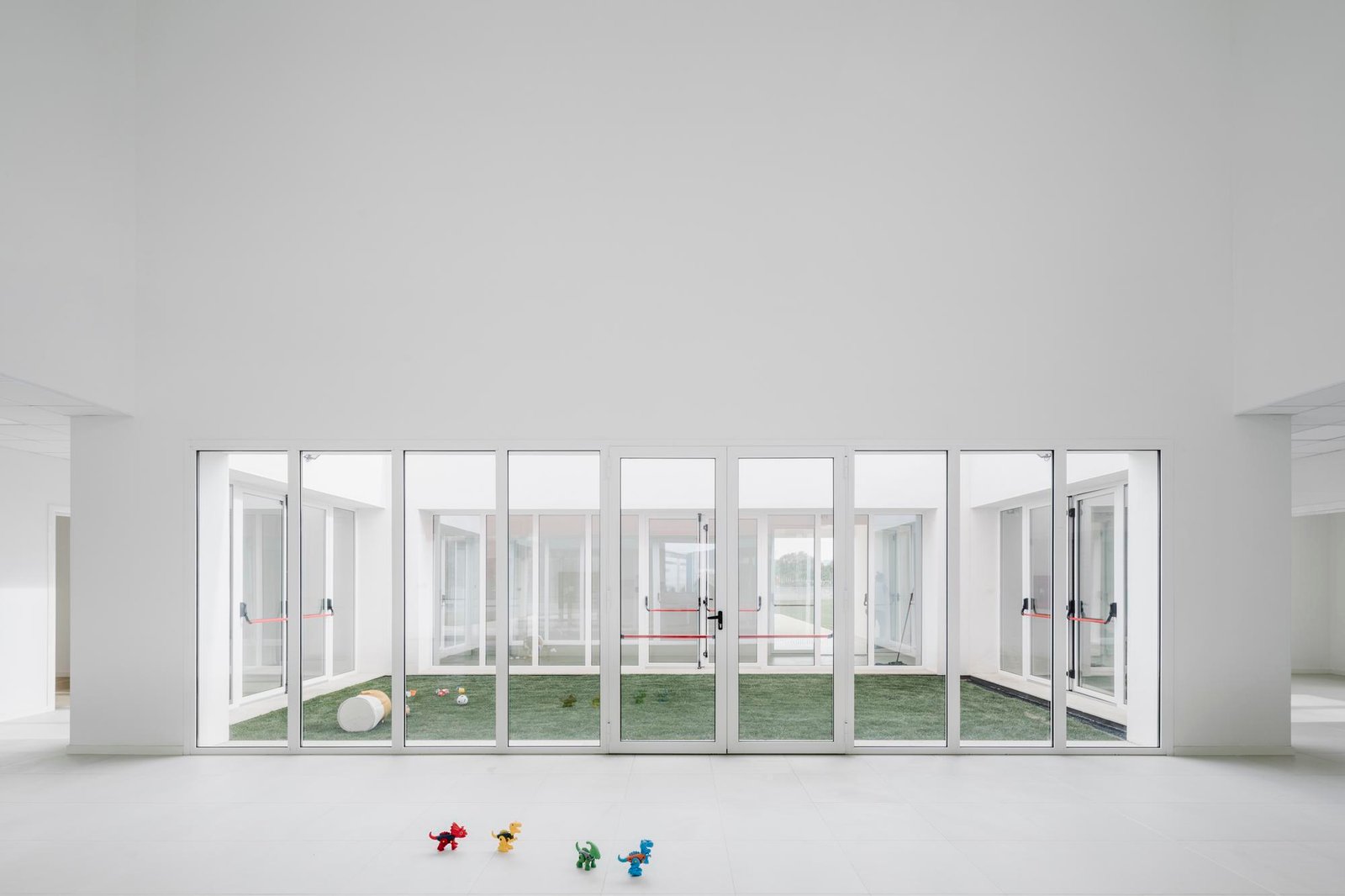 Desarrollado íntegramente en una sola planta, el edificio se estructura en torno a un patio central concebido como una auténtica plaza interior: un espacio identitario que ordena la distribución y se convierte en un lugar de interacción, encuentro y actividad colectiva. Este vacío central no es un mero elemento conector, sino el núcleo simbólico y funcional de la guardería, fomentando la socialización y reforzando el sentido de comunidad.