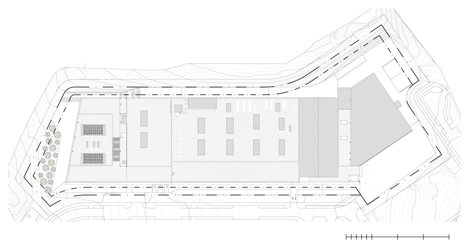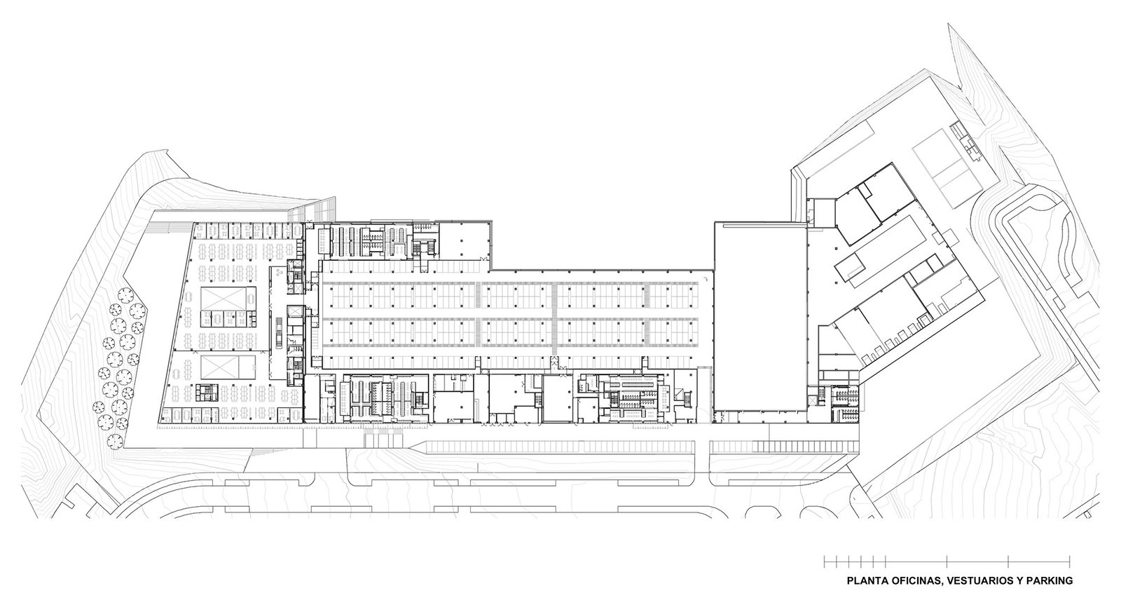 Se plantea una configuración del edificio ajustada a la parcela y a una compleja topografía con grandes desniveles, consiguiendo una importante carga simbólica, pero basada en la viabilidad y funcionalidad de la producción. Esto se traduce en un edificio compacto, escalonado, adaptado a la orografía de la parcela y a la servidumbre aeronáutica debido a la cercanía del aeropuerto.