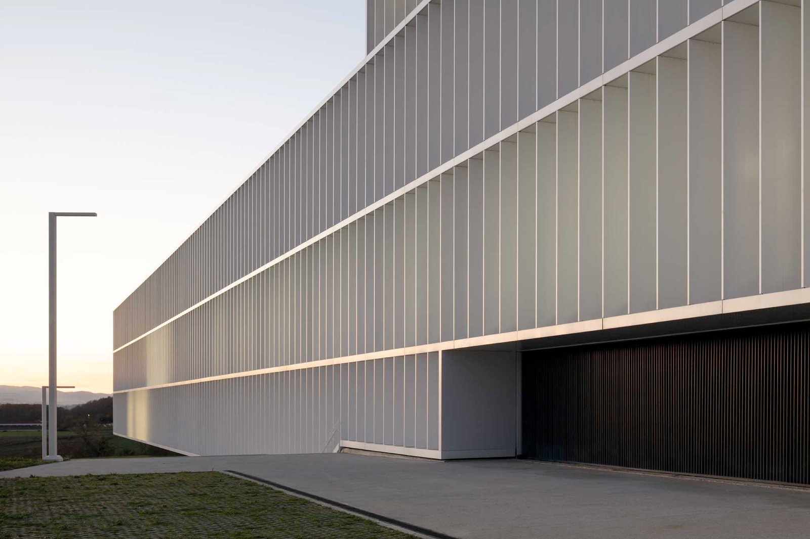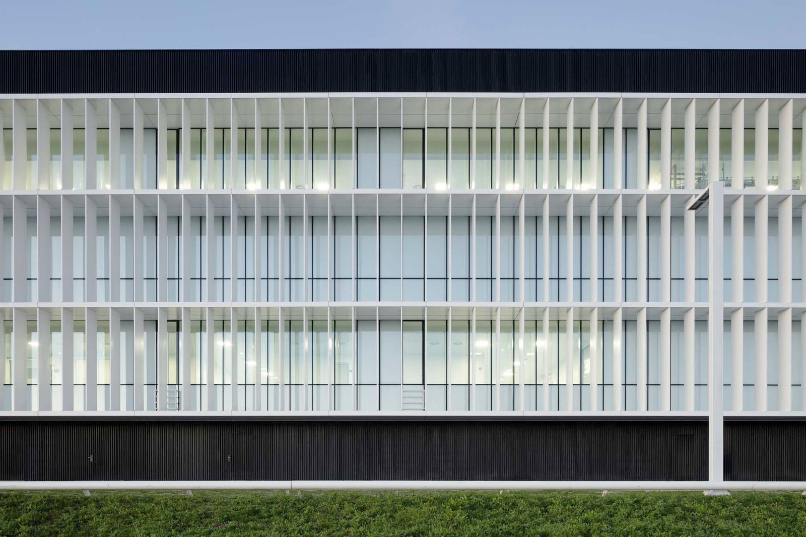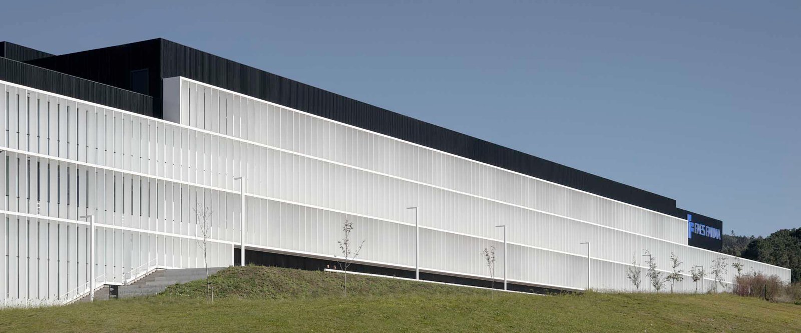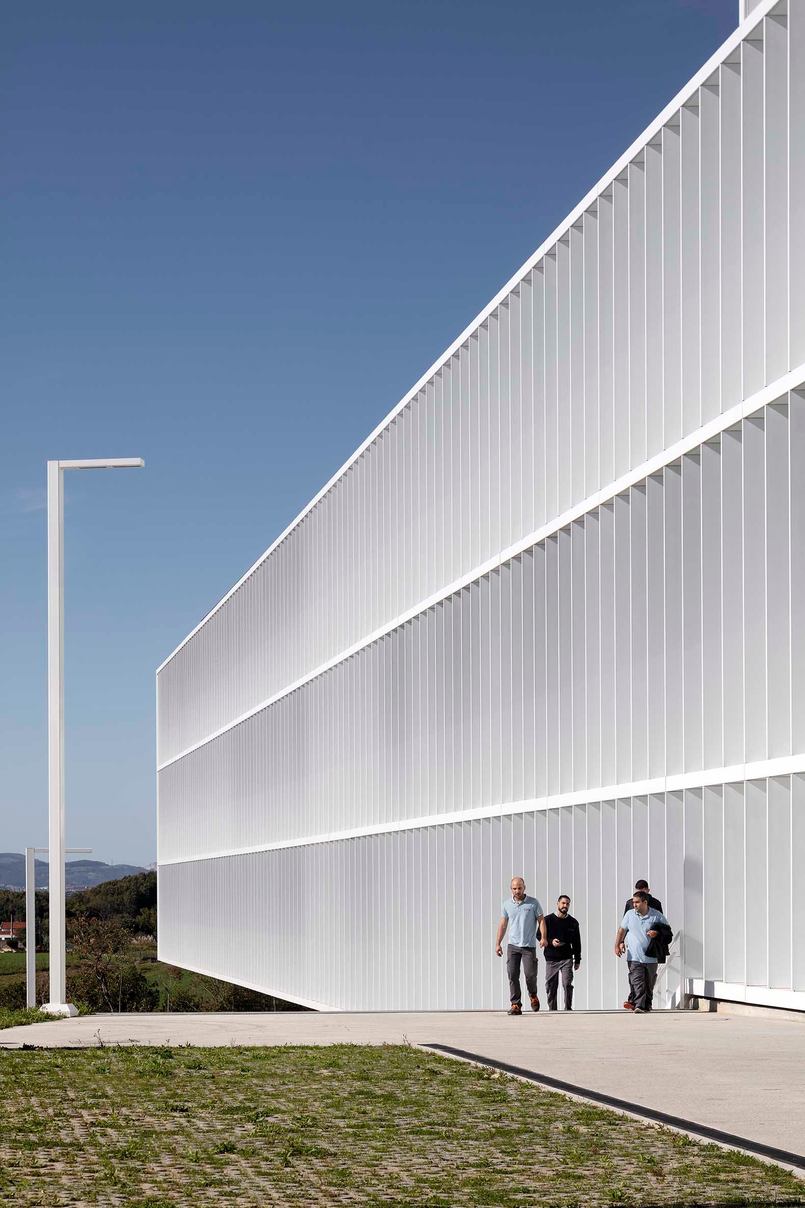 La imagen de la nueva planta de producción será también la nueva imagen de Faes Farma, y esto se verá reflejado en la fachada sur del edificio donde la fachada blanca obtiene su carácter abstracto gracias a los elementos de control solar que la configuran. La trama de lamas existentes en la fachada principal responde a las necesidades de control solar, buscando la protección de la radiación solar directa en verano y el control de la incidencia de los rayos solares a primera y última hora del día.