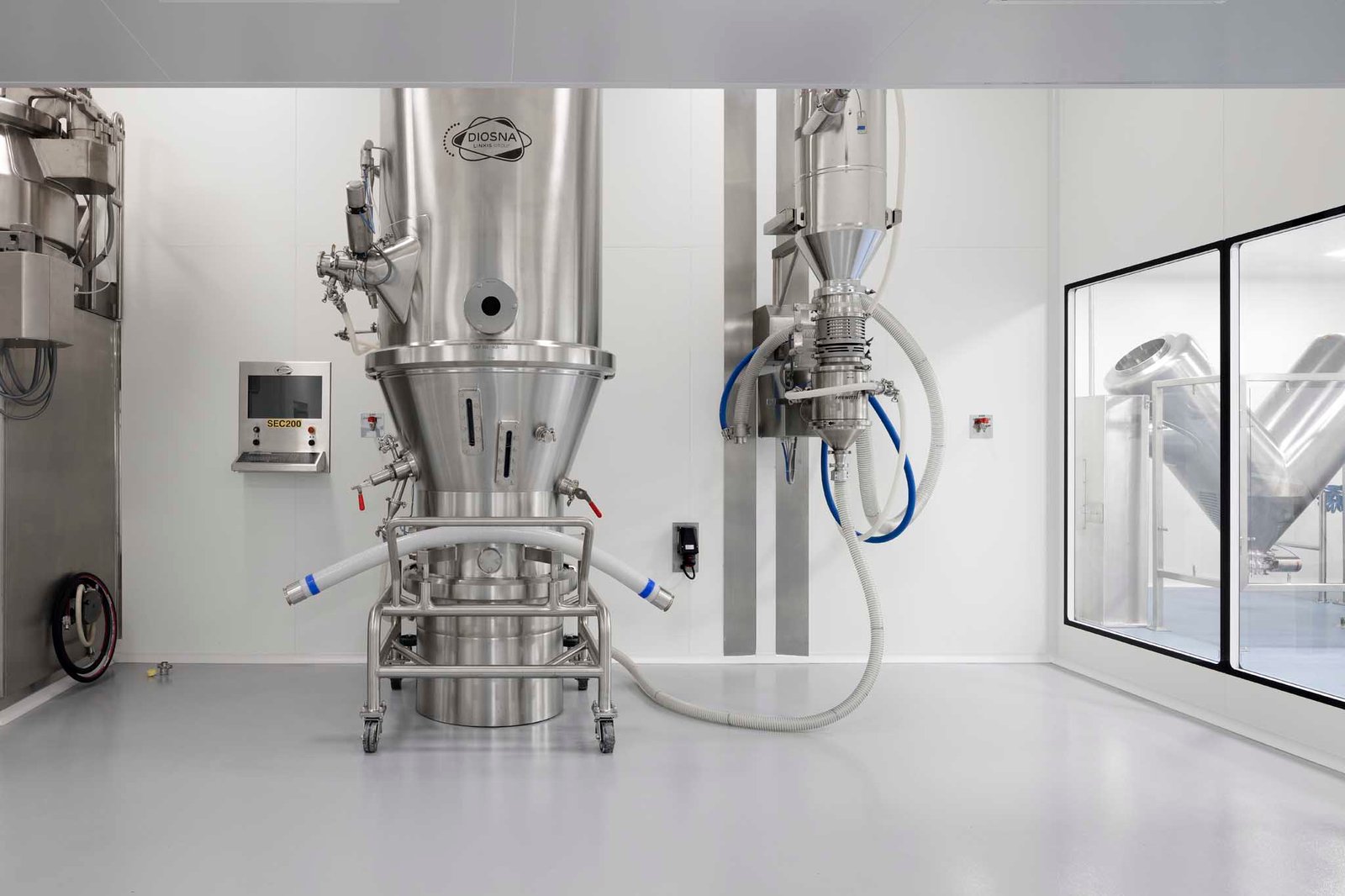 En la zona de producción también se incluye el aparcamiento cubierto y los distintos vestuarios en conexión directa con la planta de producción. El diseño de las salas blancas en las plantas de producción se ha hecho en base a las normas GMP (Good Manufacturing Practices), y se han incorporado amplias entreplantas técnicas para alojar todos los servicios necesarios. El edificio se completa con la zona logística, que incluye en almacén robotizado que consiste en un silo en el que se almacena tanto la materia prima como el producto acabado, y la zona de carga y descarga con 7 muelles de carga y descarga.
