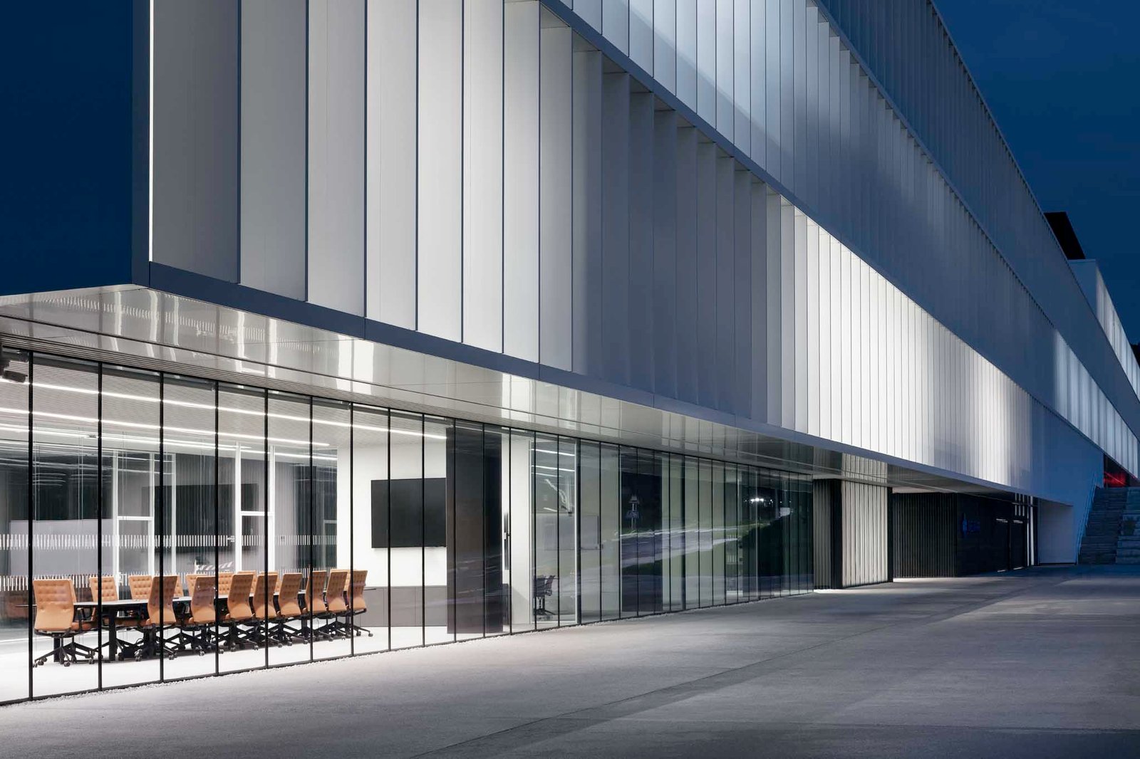 Esta implantación consigue que, desde la aproximación en un punto lejano del vial, aparezca la imagen del edificio administrativo, aparentemente flotando sobre la entrada principal. Esto se traduce en un incremento de la representatividad y singularidad el edificio. Esta primera parte del edificio alberga la parte representativa de la nueva planta, con usos de oficinas, una planta de dirección, y más de 3000 metros cuadrados de laboratorio. Los diferentes espacios se configuran entorno a dos grandes patios que a su vez se conectan con el paisaje que rodea el edificio.