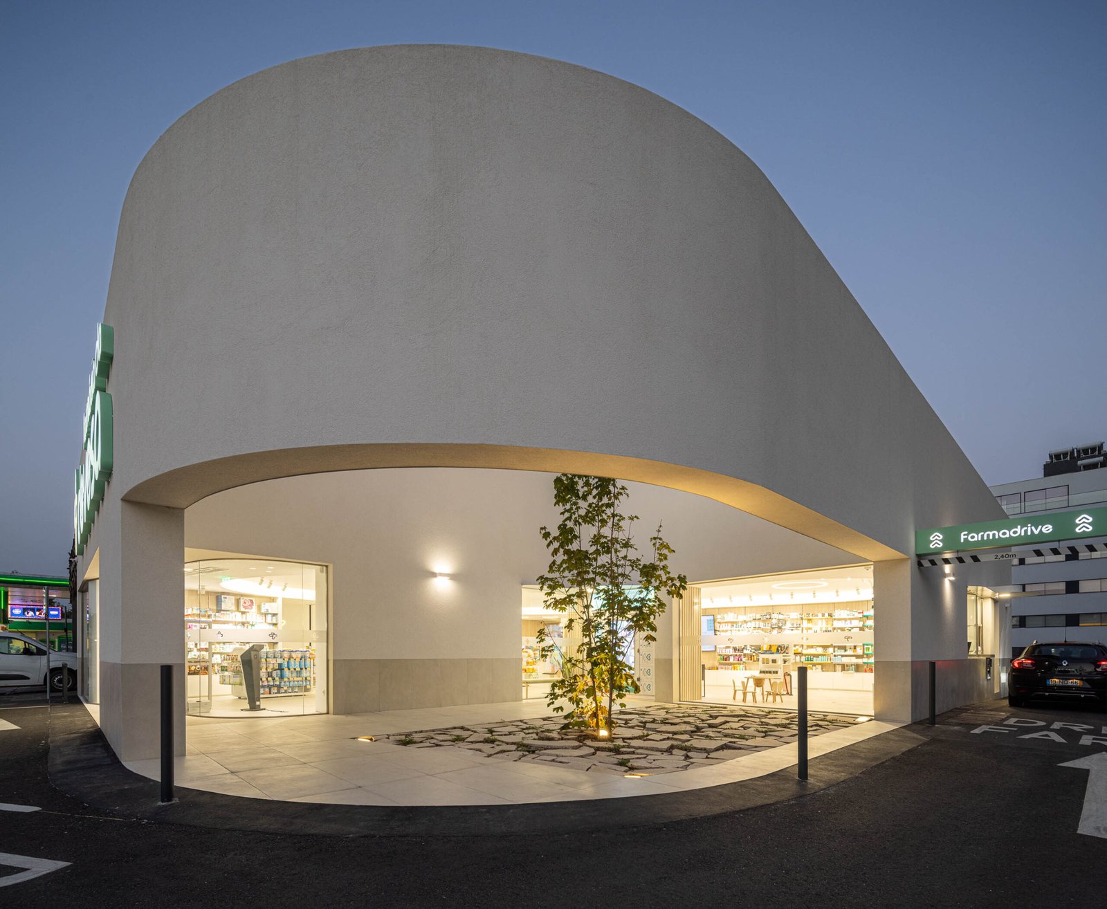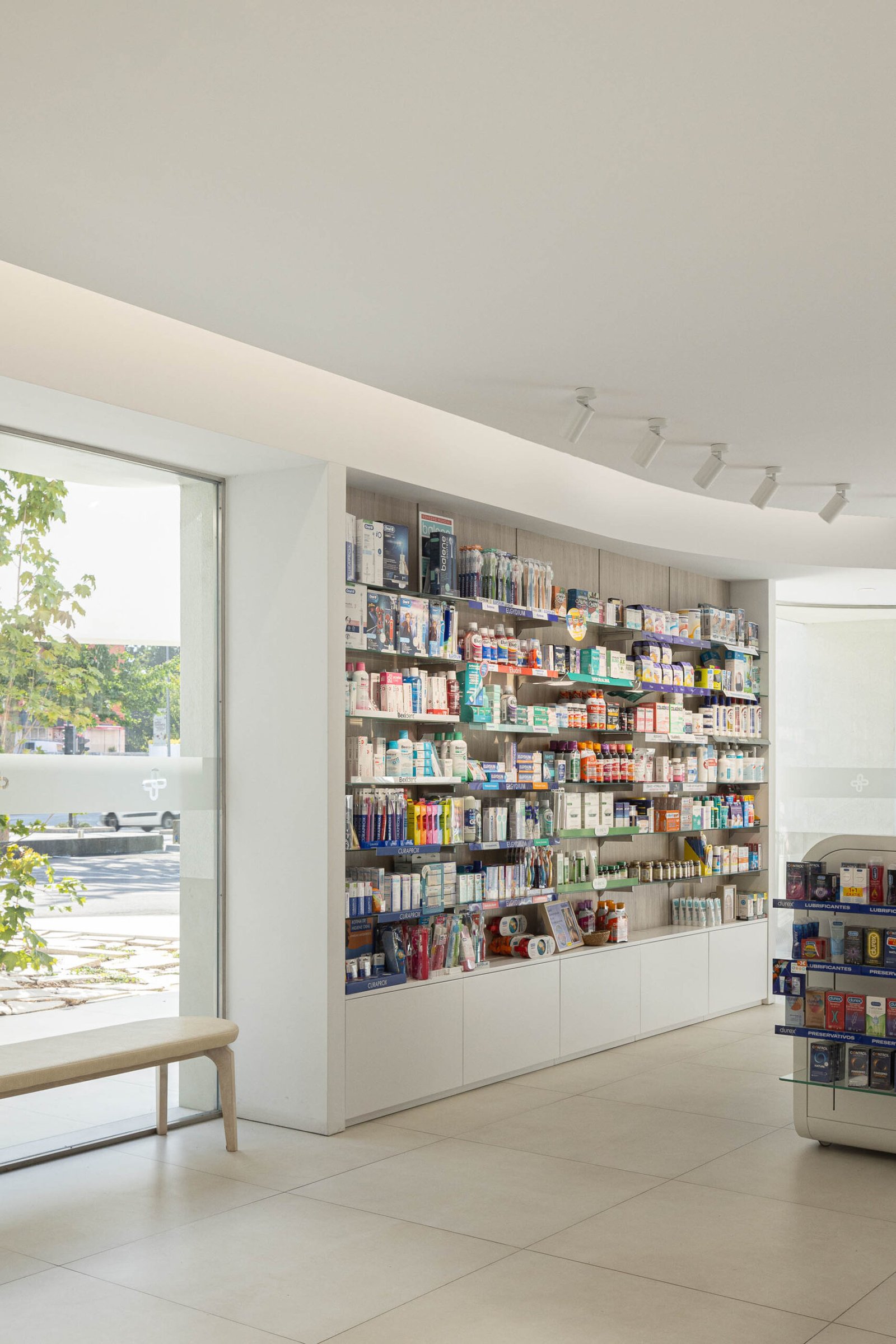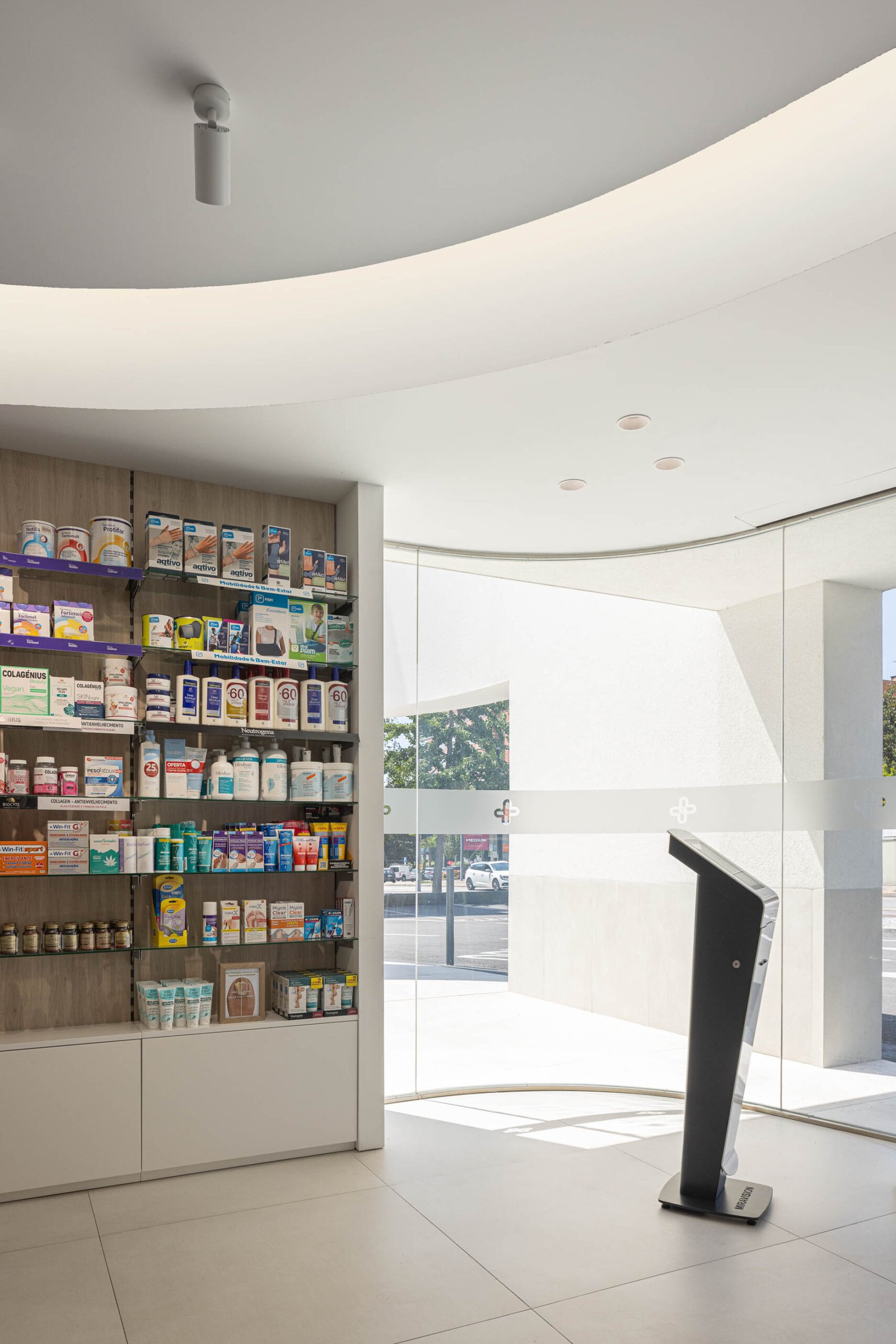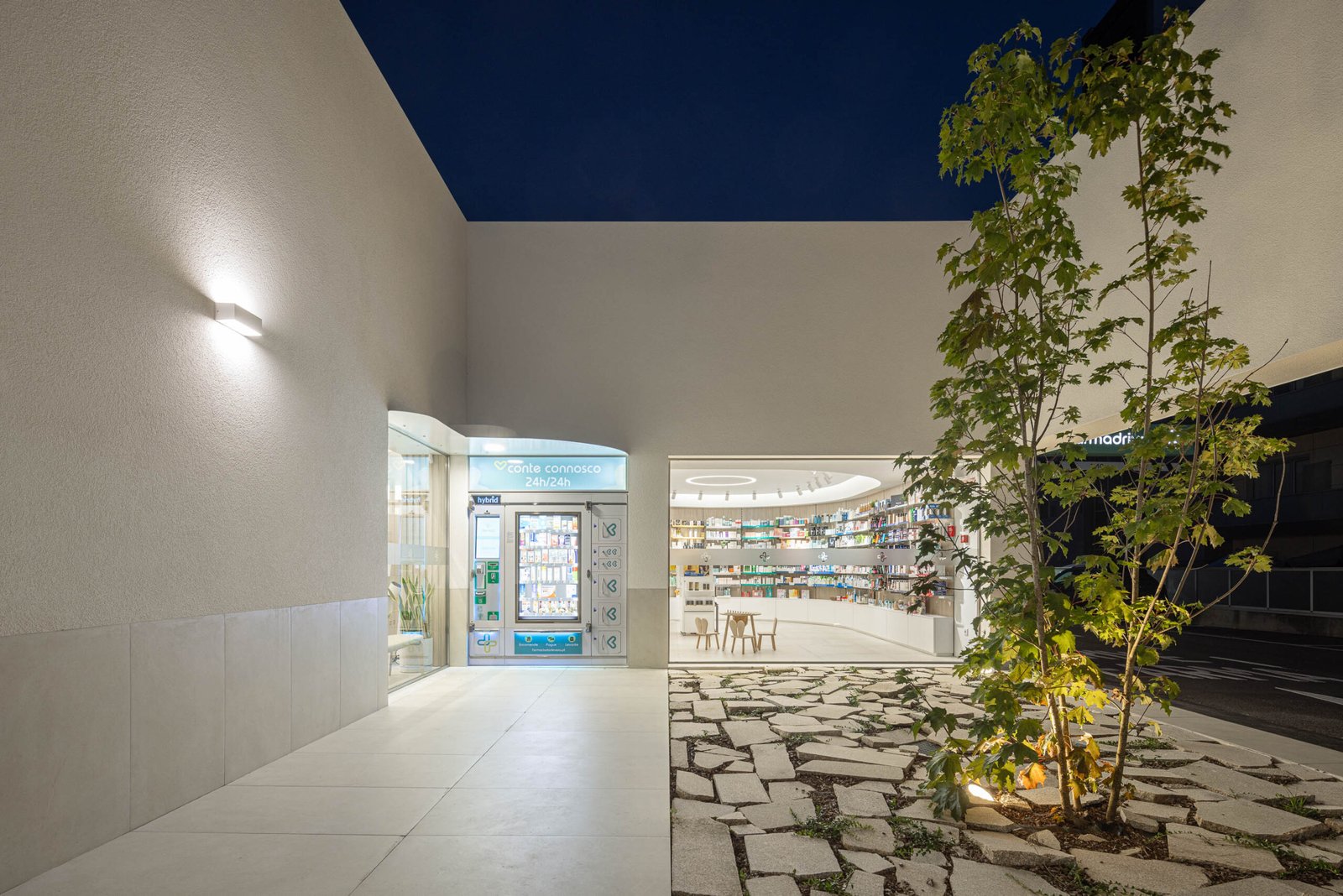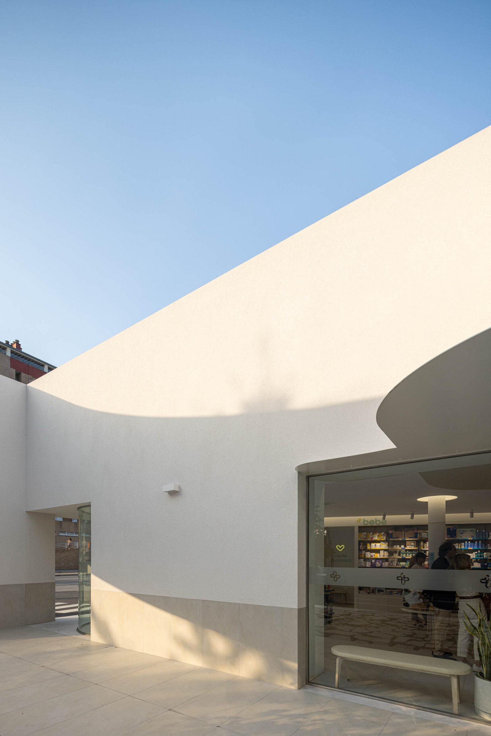 En el exterior, los paneles blancos de las paredes terminan con un arrimadero que se une al pavimento con la misma materialidad, incluido el patio que rodea la zona premium, la máquina expendedora de productos sanitarios y el punto de servicio Farmadrive. El proyecto pretende fomentar la visibilidad y el contacto visual entre el interior y el exterior, creando proximidad tanto para quienes circulan por la vía pública como para los peatones.