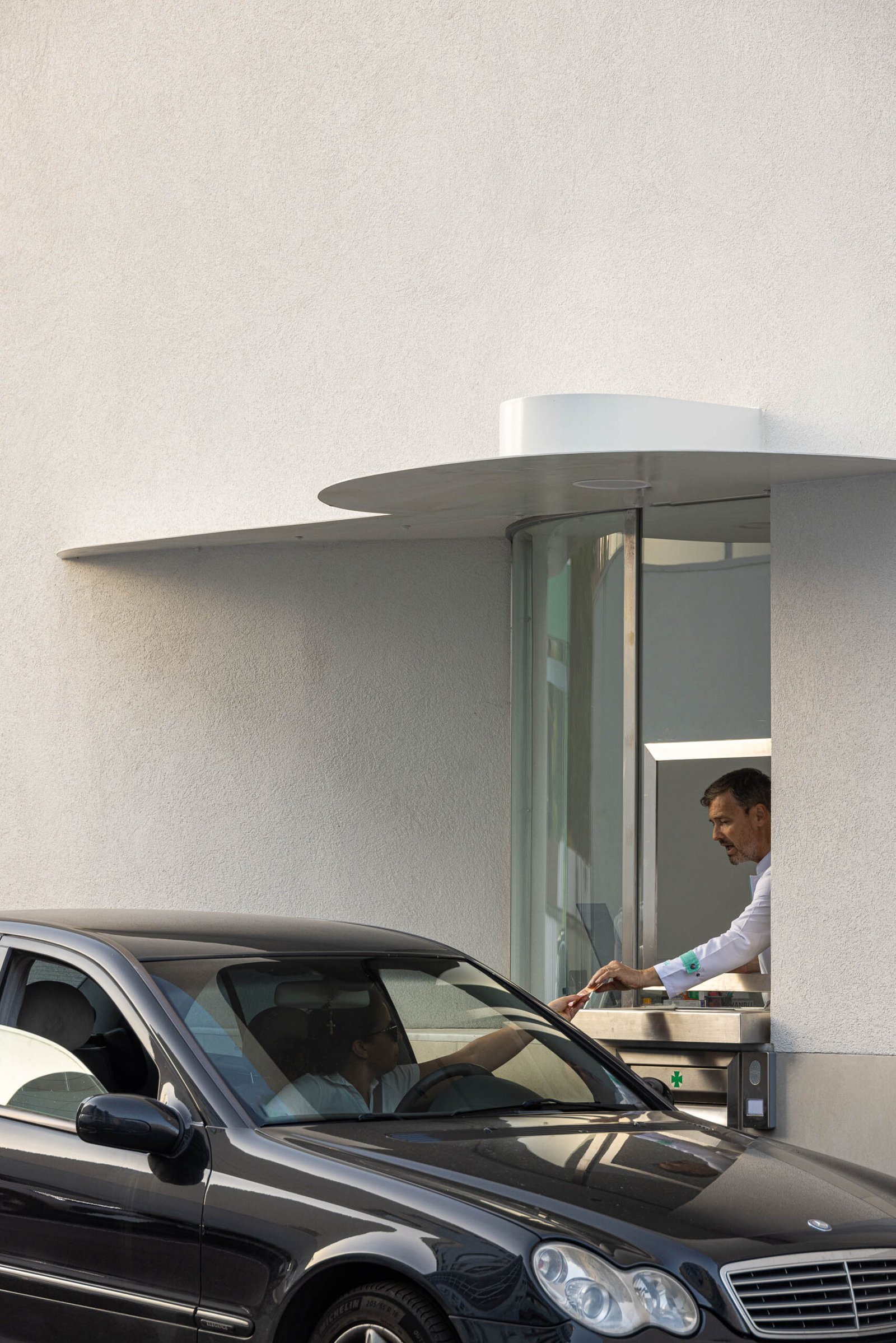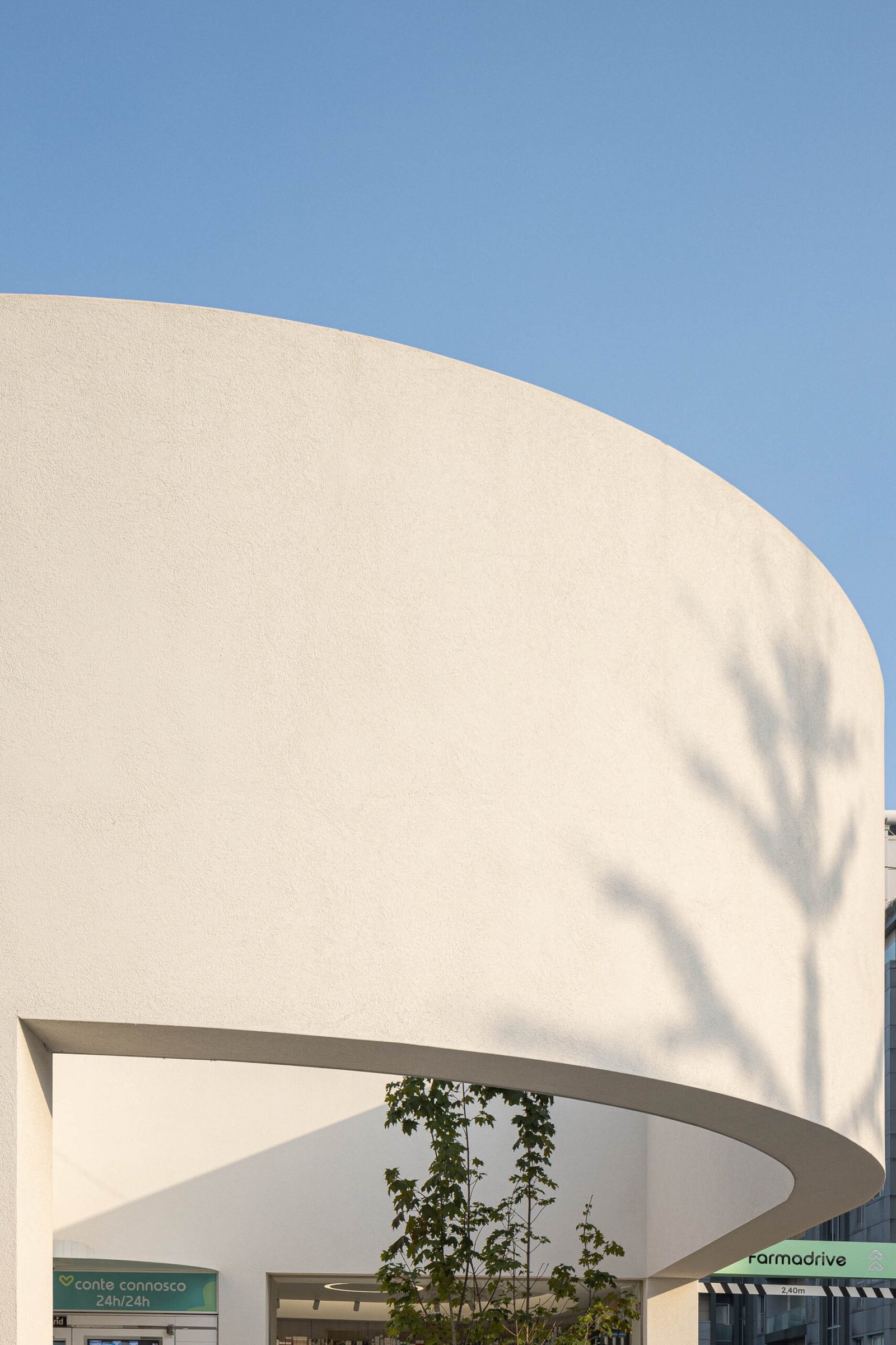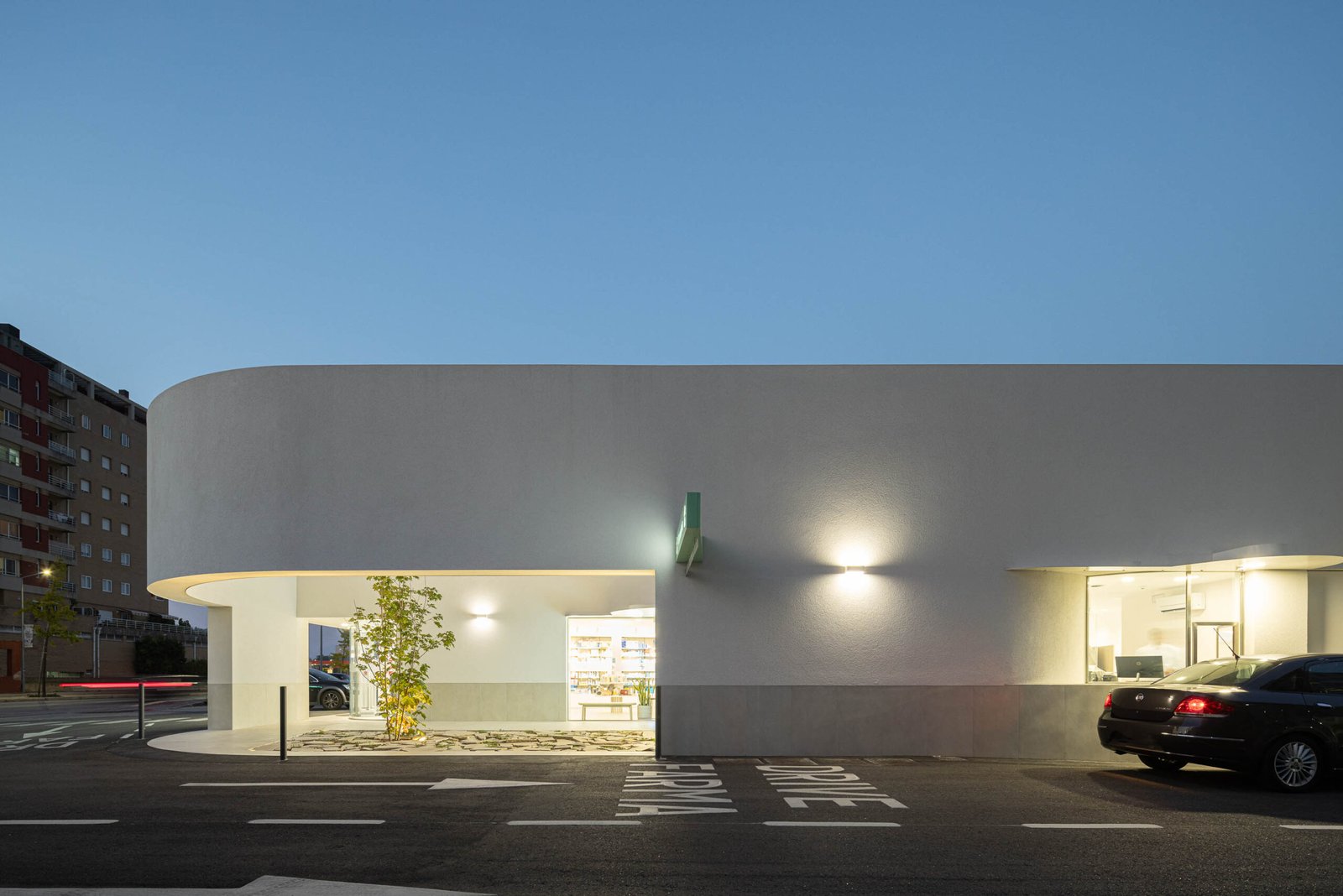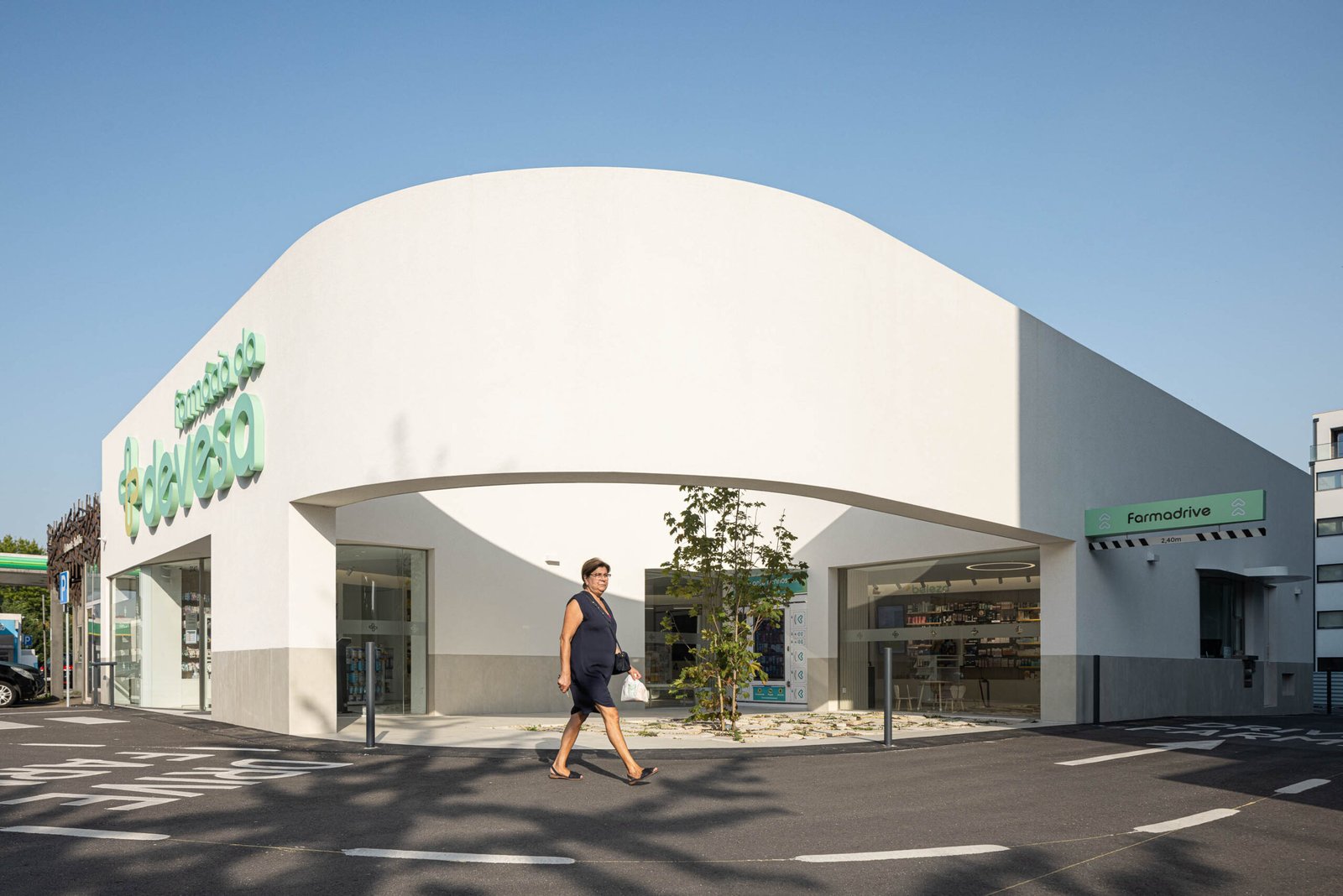 En el exterior, los paneles blancos de las paredes terminan con un arrimadero que se une al pavimento con la misma materialidad, incluido el patio que rodea la zona premium, la máquina expendedora de productos sanitarios y el punto de servicio Farmadrive. El proyecto pretende fomentar la visibilidad y el contacto visual entre el interior y el exterior, creando proximidad tanto para quienes circulan por la vía pública como para los peatones.
