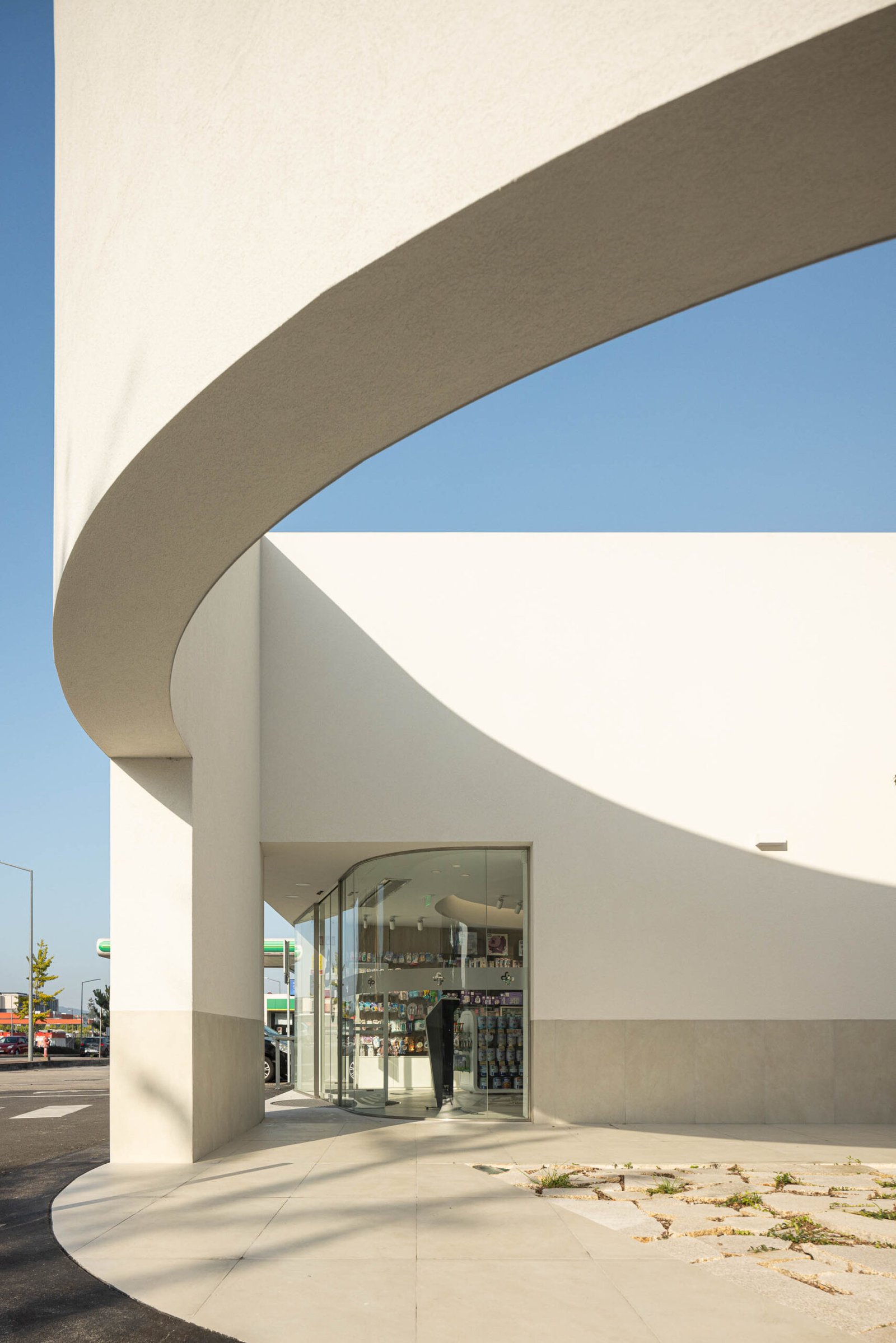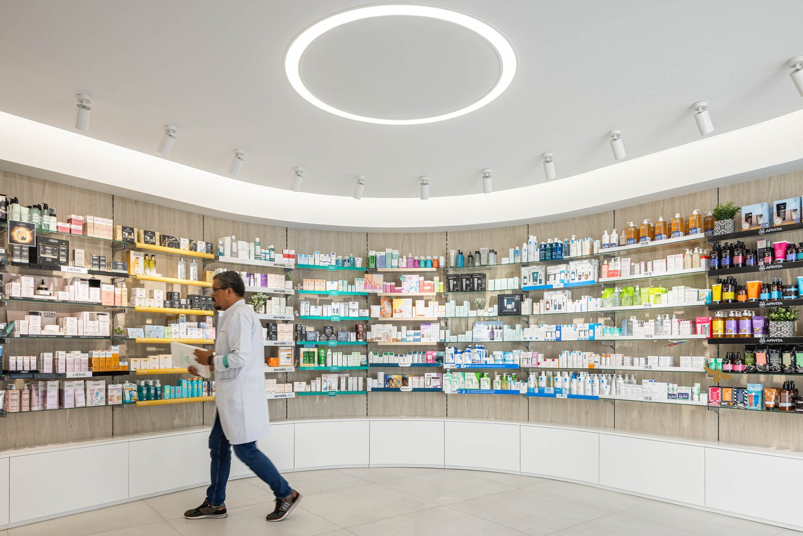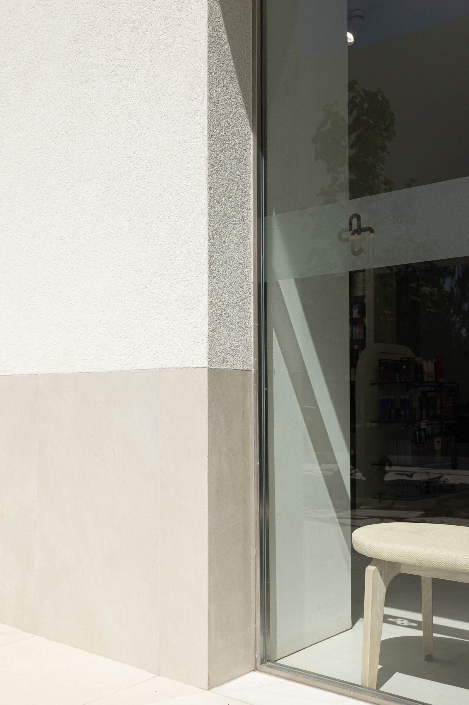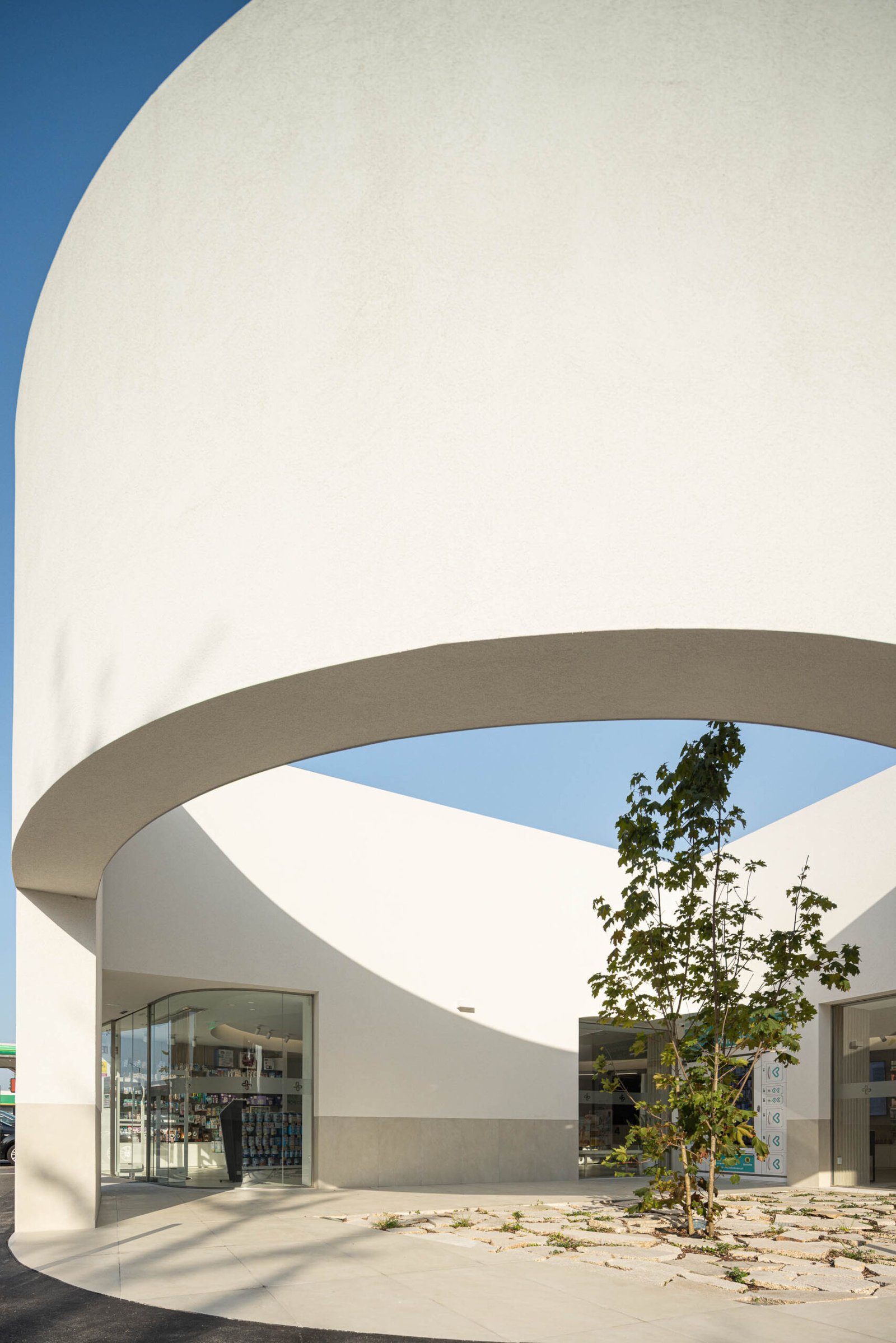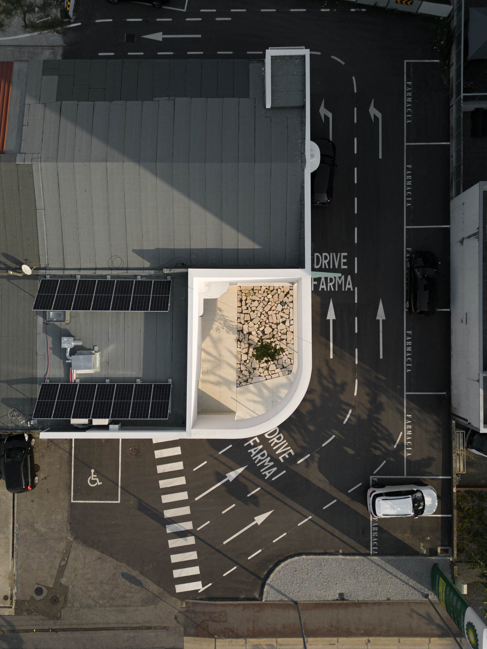 En el exterior, los paneles blancos de las paredes terminan con un arrimadero que se une al pavimento con la misma materialidad, incluido el patio que rodea la zona premium, la máquina expendedora de productos sanitarios y el punto de servicio Farmadrive. El proyecto pretende fomentar la visibilidad y el contacto visual entre el interior y el exterior, creando proximidad tanto para quienes circulan por la vía pública como para los peatones.