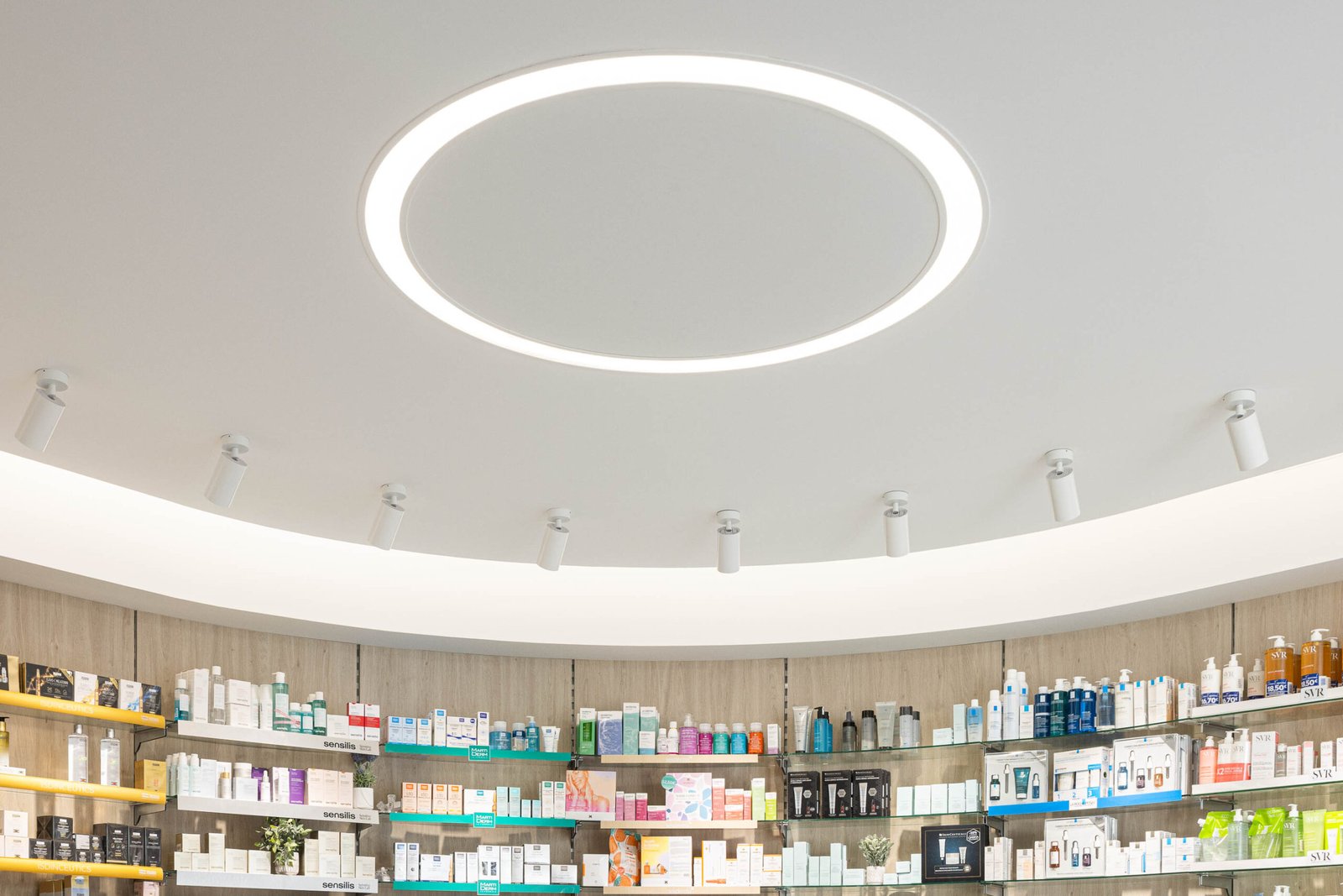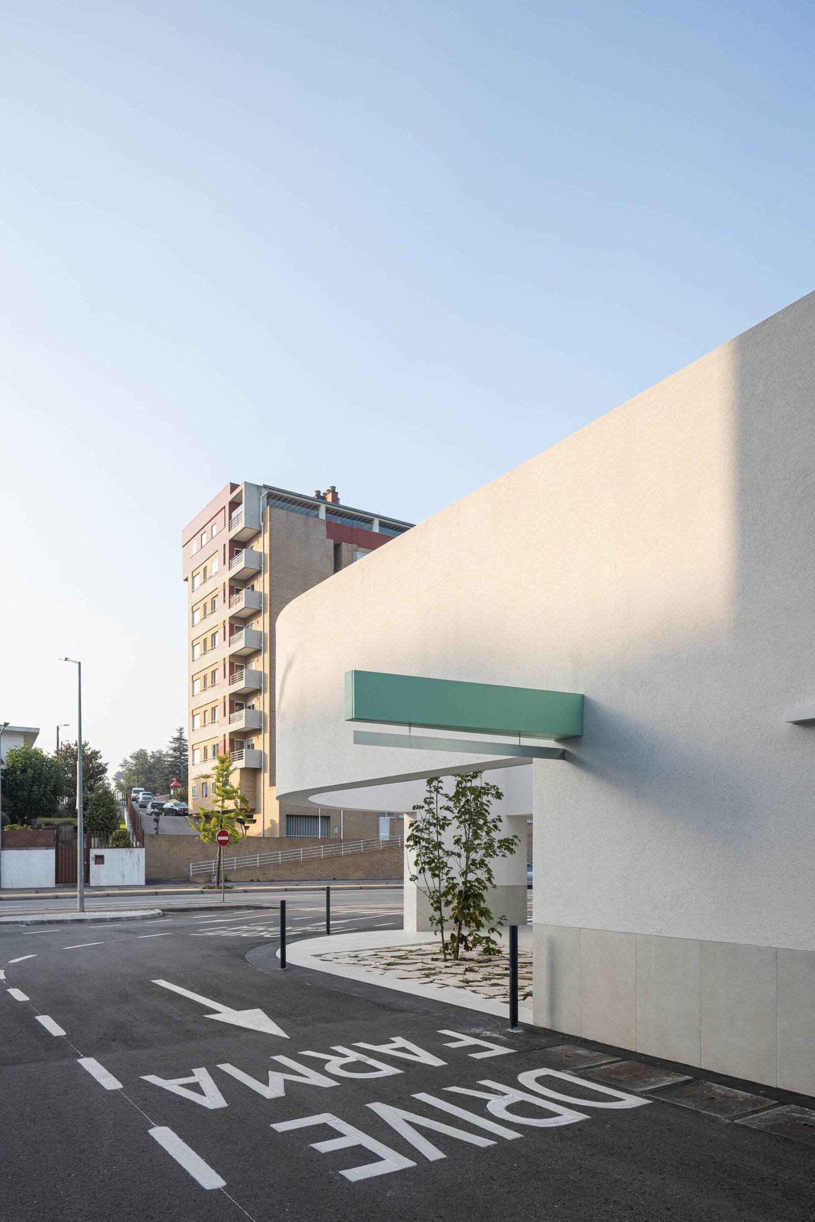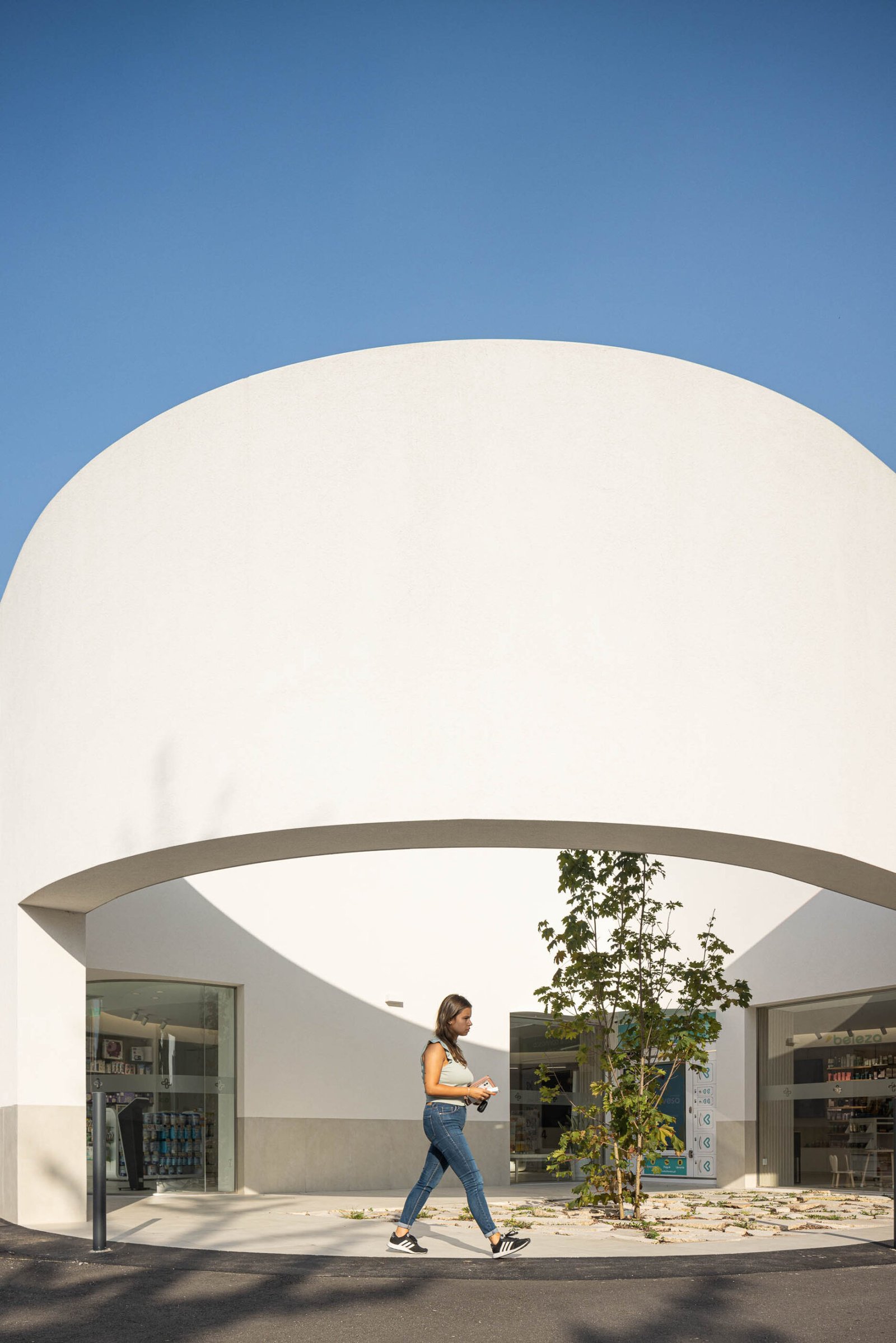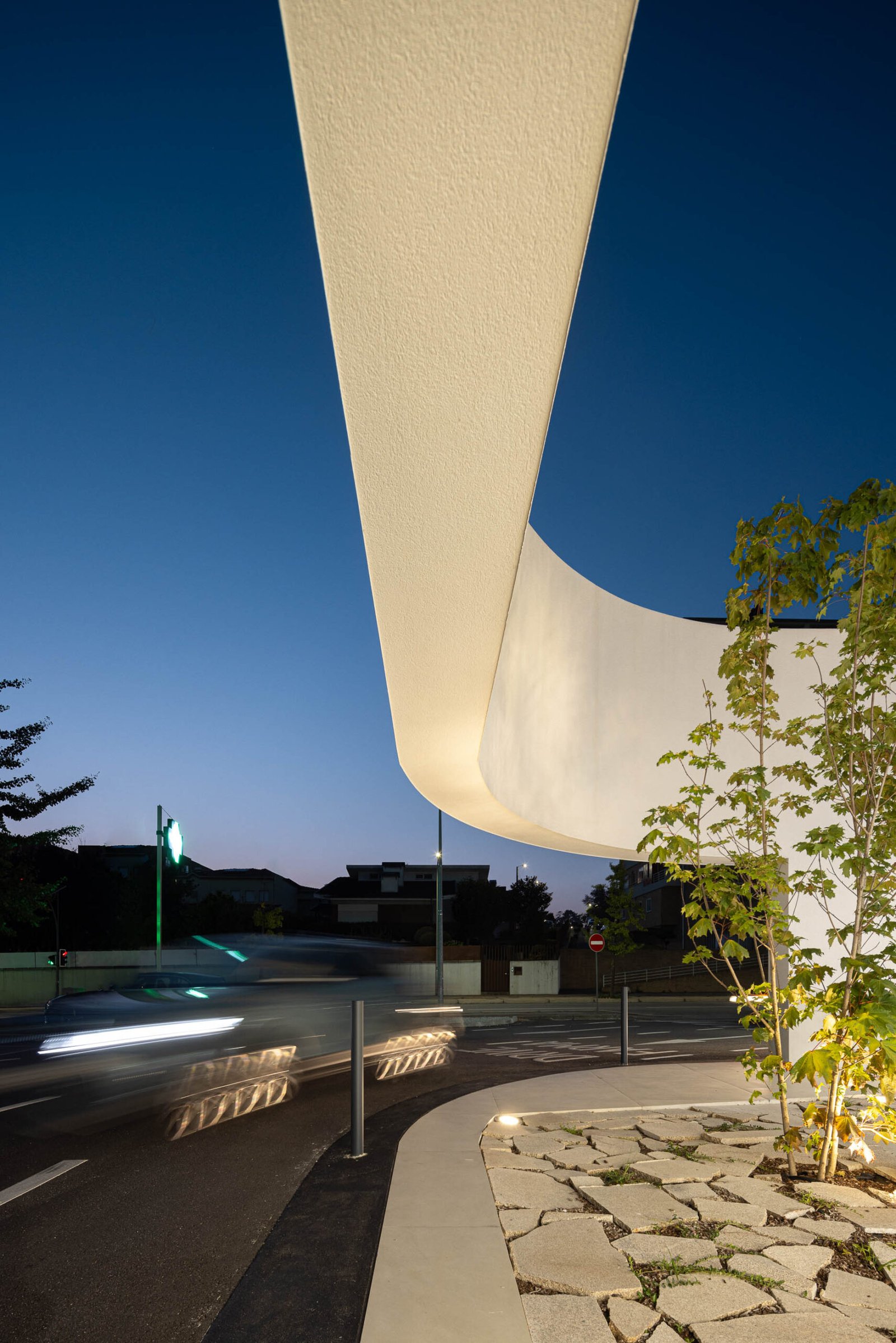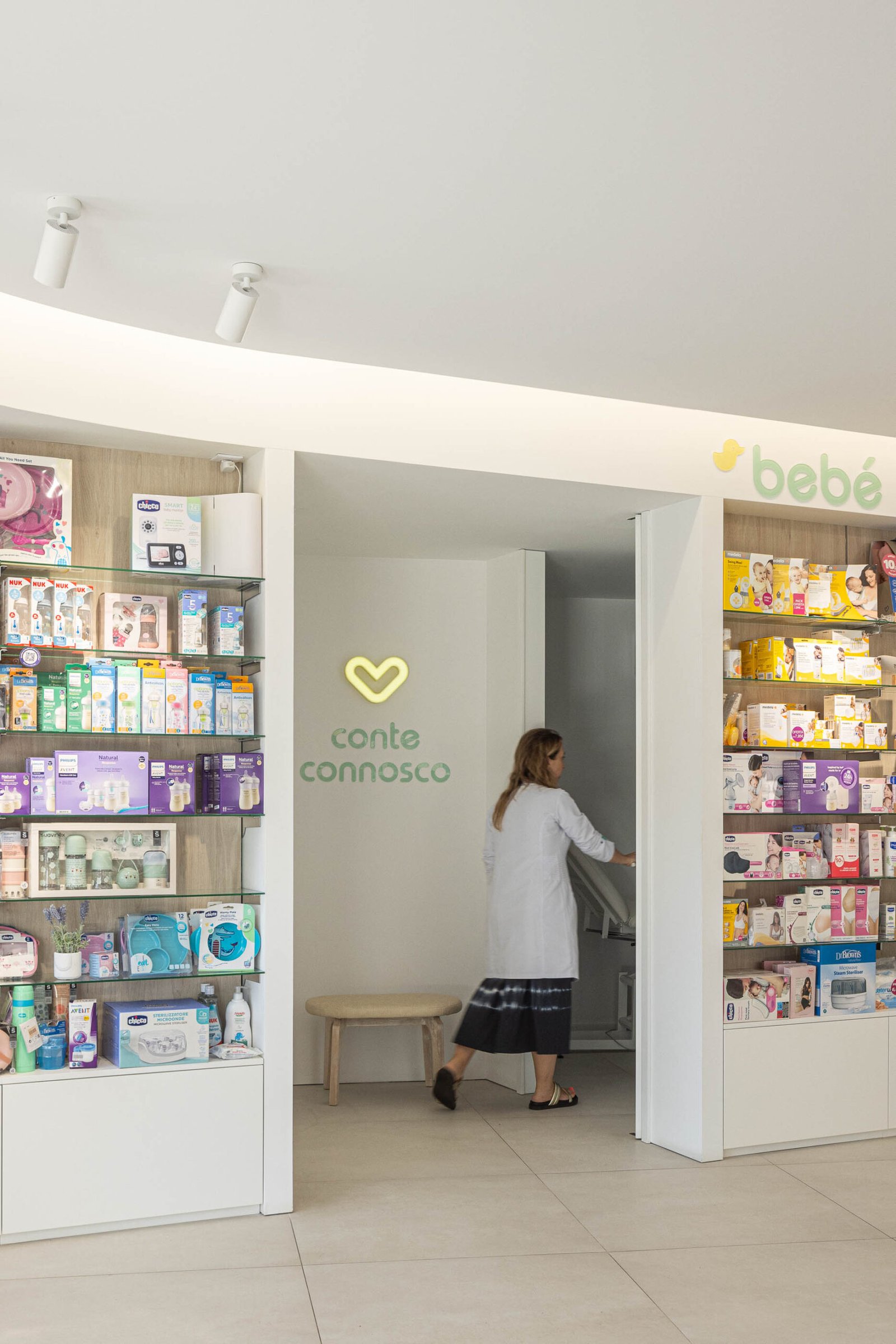 En el exterior, los paneles blancos de las paredes terminan con un arrimadero que se une al pavimento con la misma materialidad, incluido el patio que rodea la zona premium, la máquina expendedora de productos sanitarios y el punto de servicio Farmadrive. El proyecto pretende fomentar la visibilidad y el contacto visual entre el interior y el exterior, creando proximidad tanto para quienes circulan por la vía pública como para los peatones.