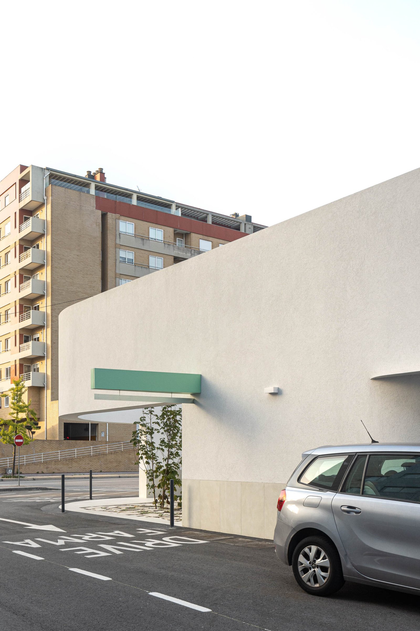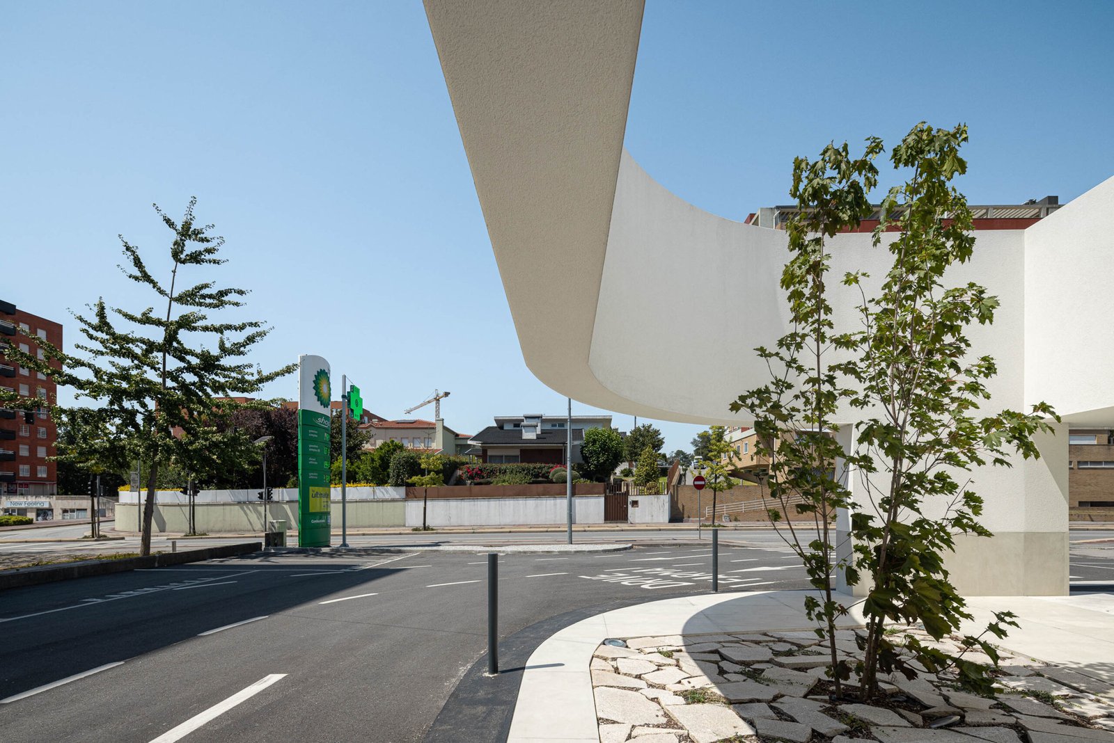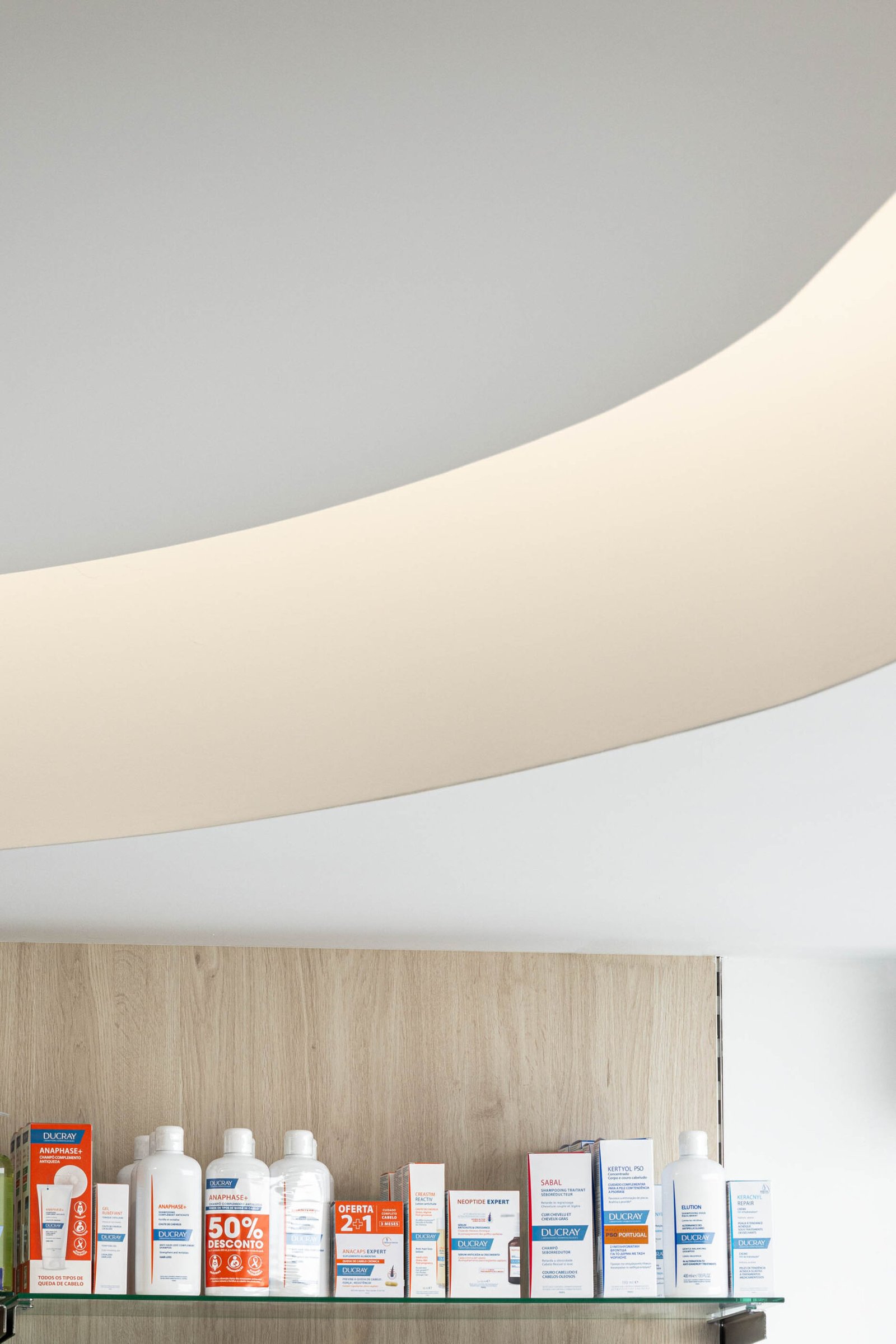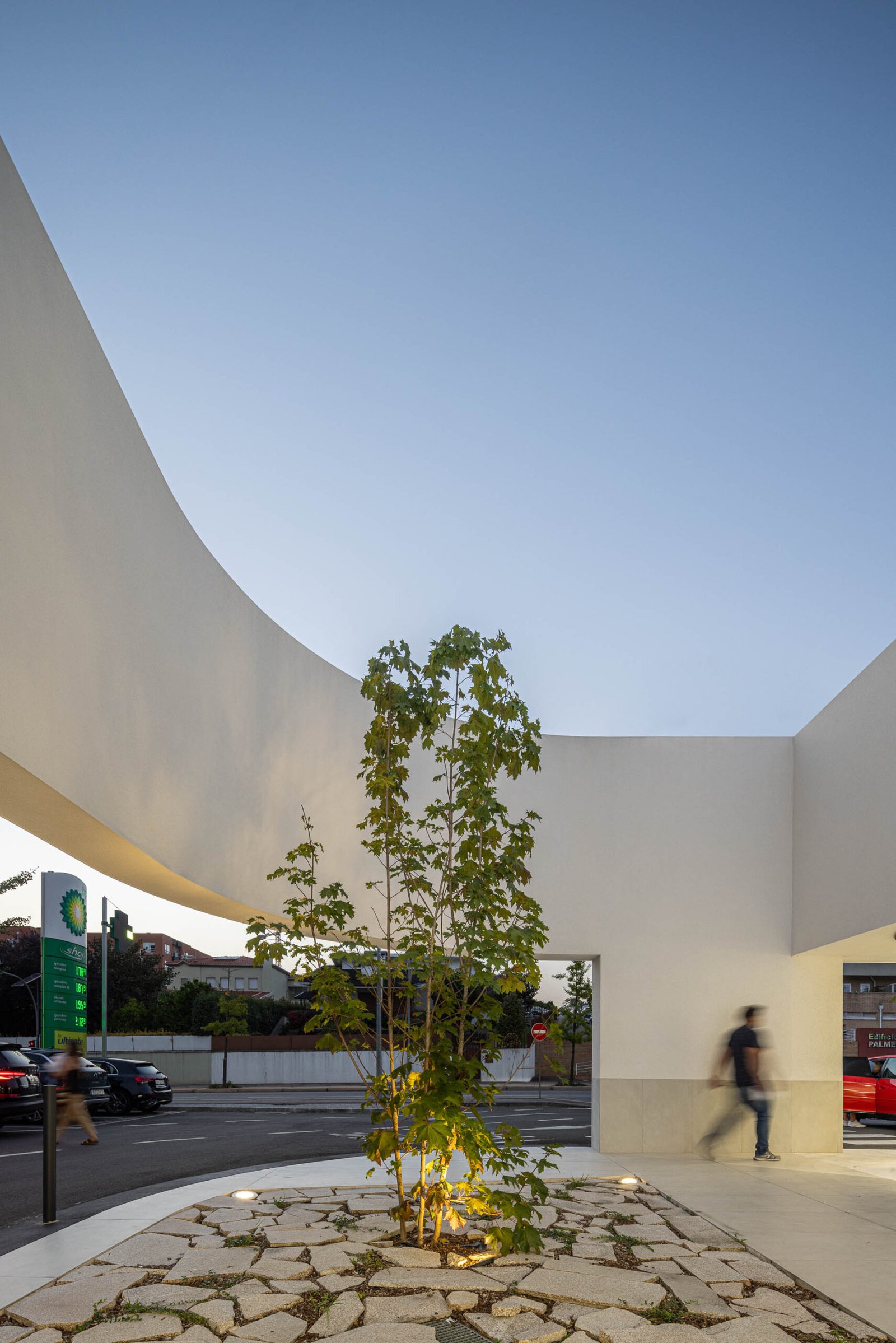 En el exterior, los paneles blancos de las paredes terminan con un arrimadero que se une al pavimento con la misma materialidad, incluido el patio que rodea la zona premium, la máquina expendedora de productos sanitarios y el punto de servicio Farmadrive. El proyecto pretende fomentar la visibilidad y el contacto visual entre el interior y el exterior, creando proximidad tanto para quienes circulan por la vía pública como para los peatones.