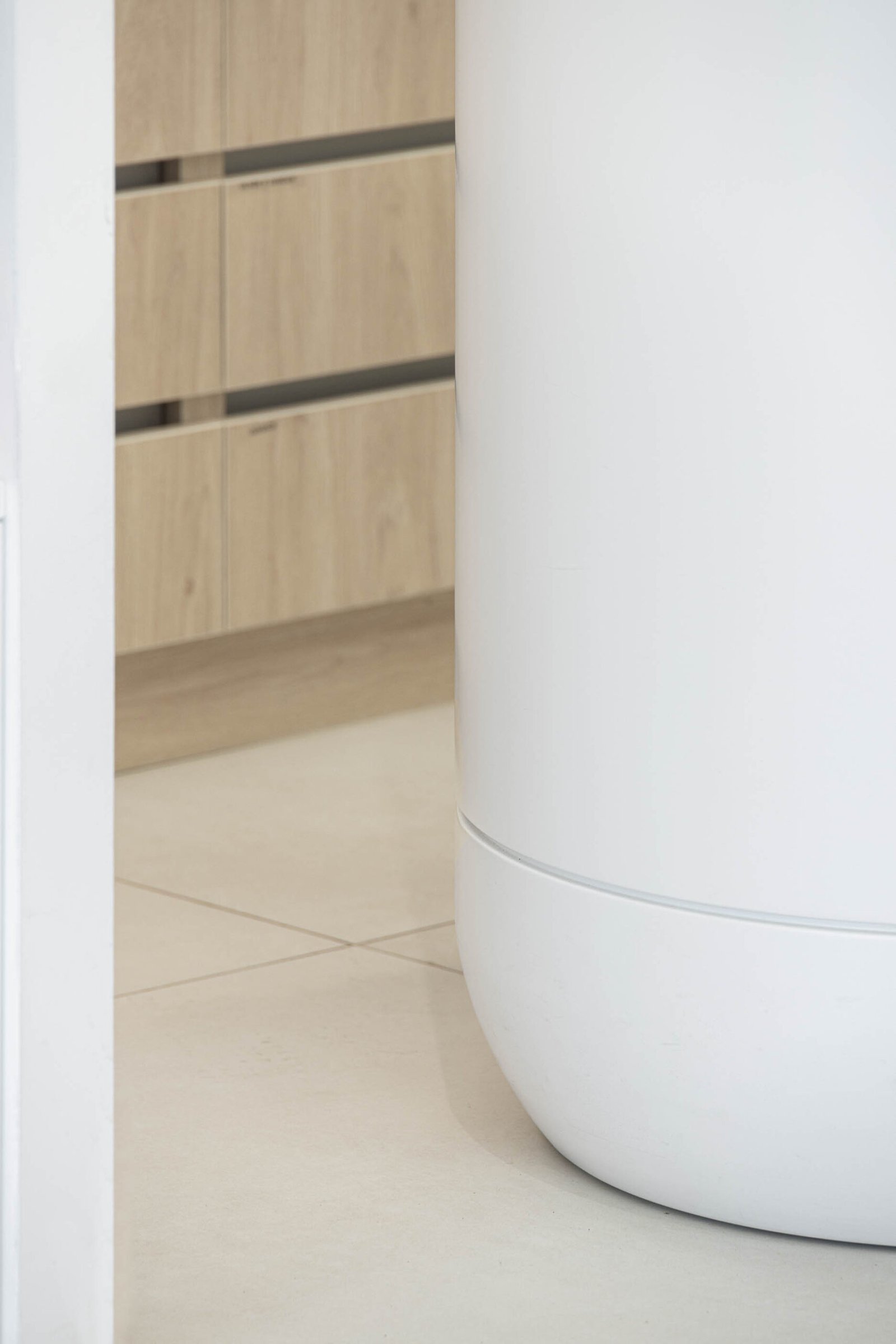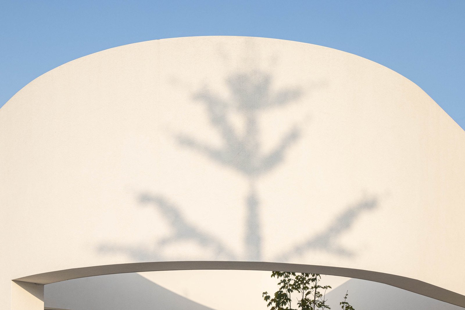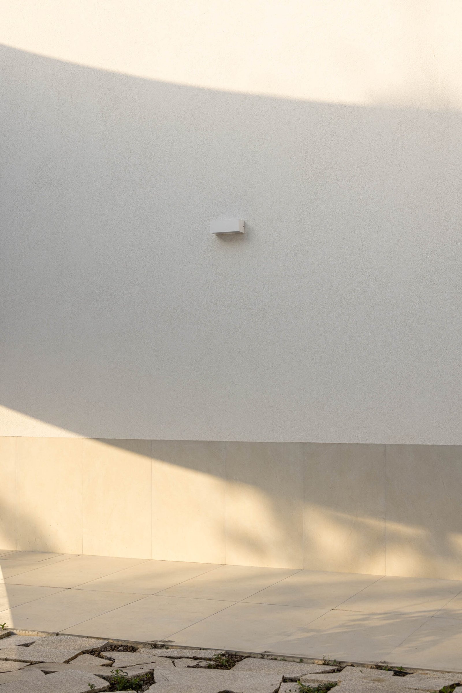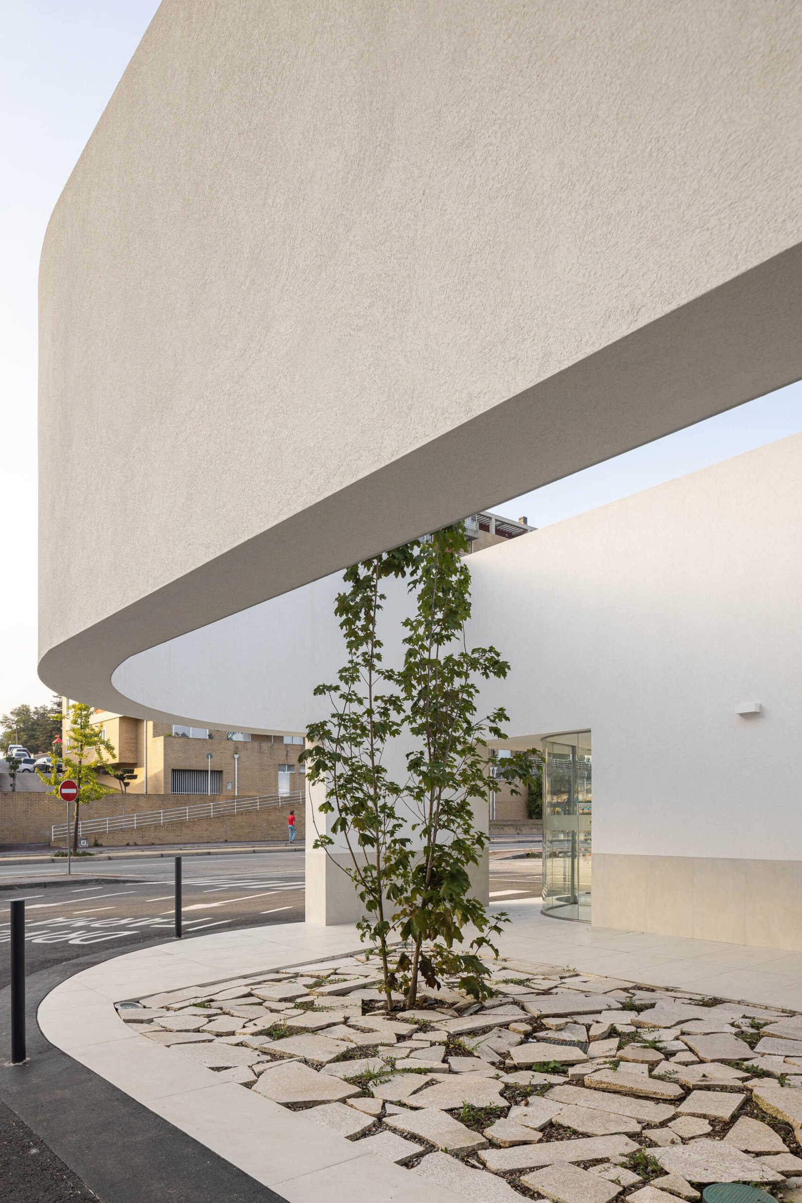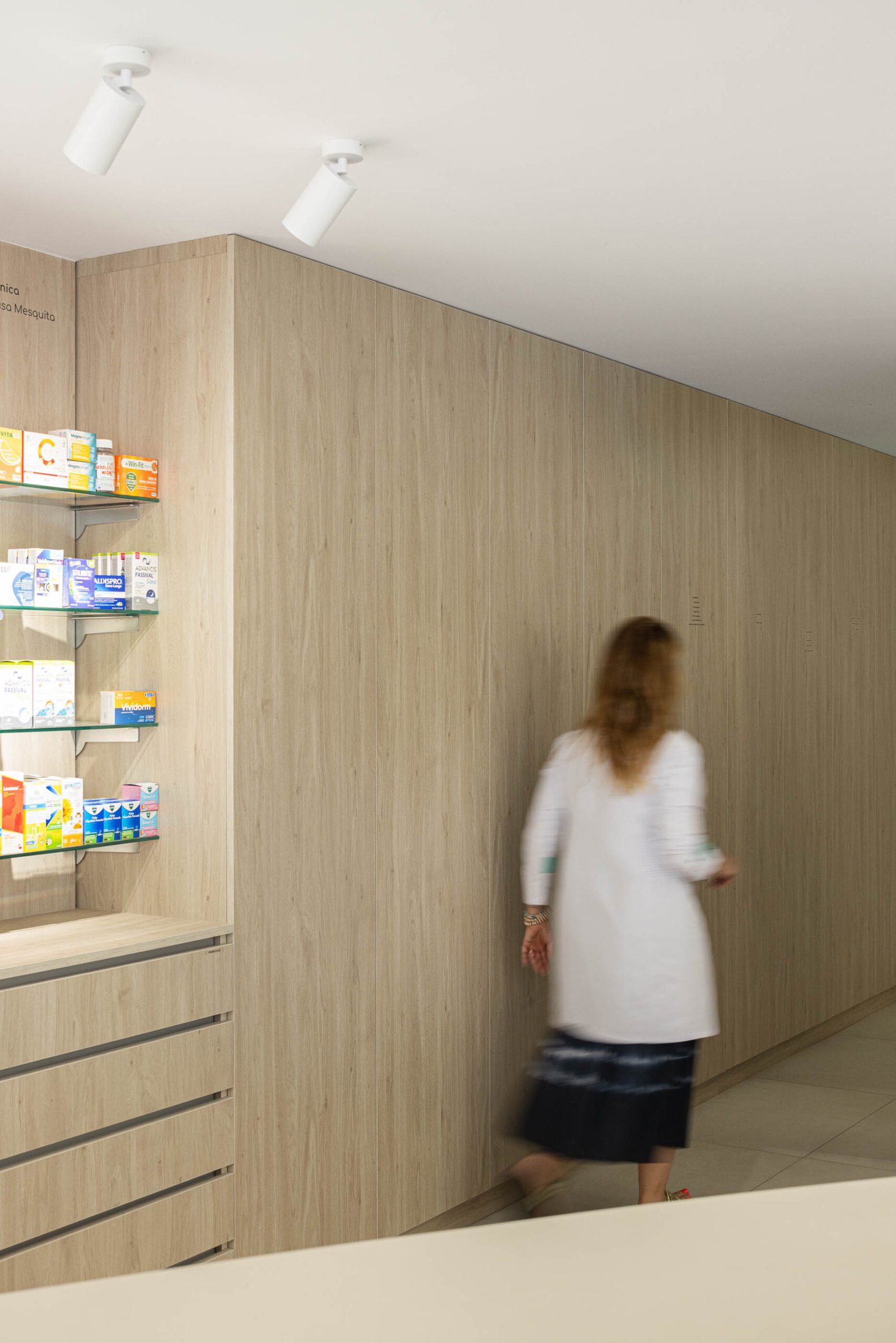 En el exterior, los paneles blancos de las paredes terminan con un arrimadero que se une al pavimento con la misma materialidad, incluido el patio que rodea la zona premium, la máquina expendedora de productos sanitarios y el punto de servicio Farmadrive. El proyecto pretende fomentar la visibilidad y el contacto visual entre el interior y el exterior, creando proximidad tanto para quienes circulan por la vía pública como para los peatones.