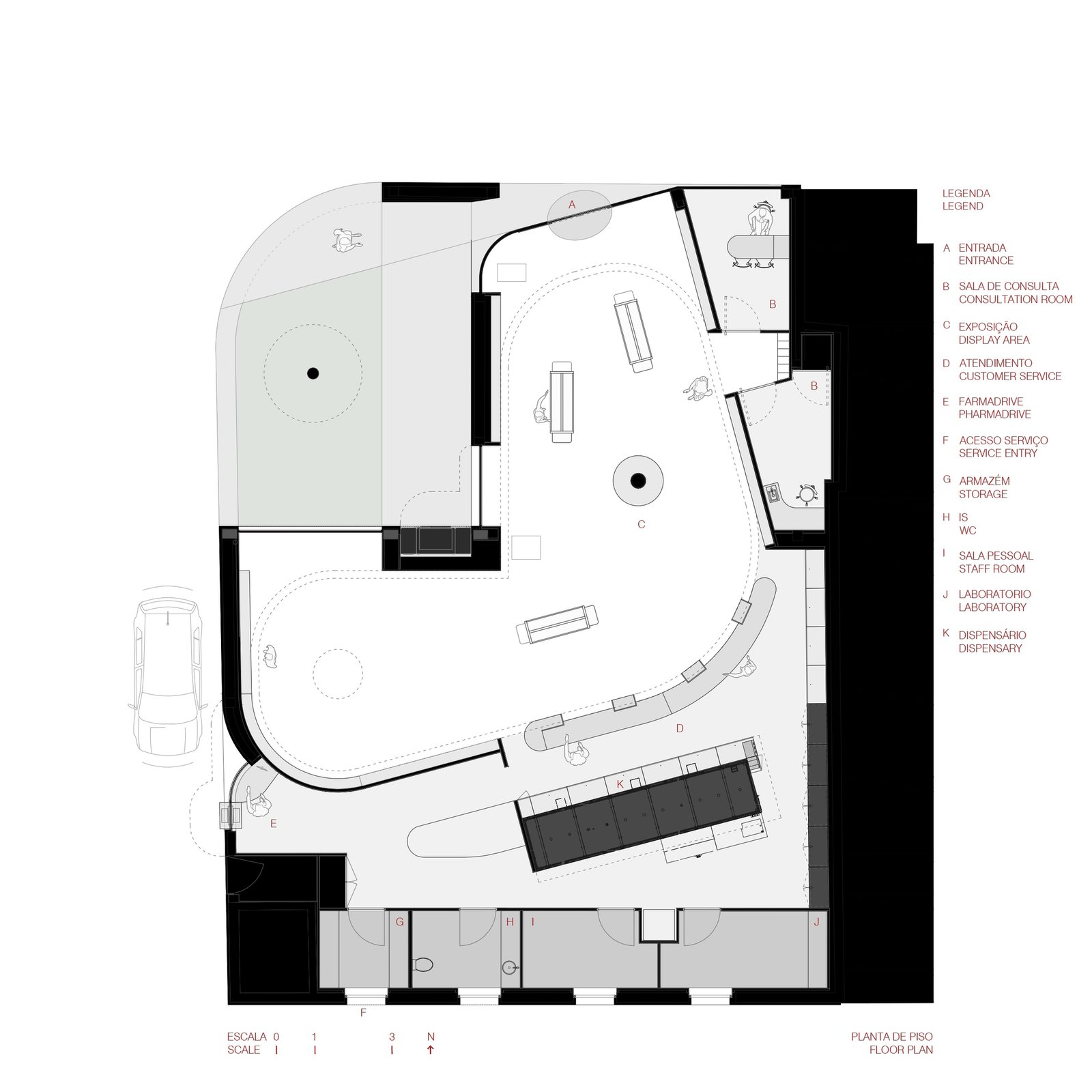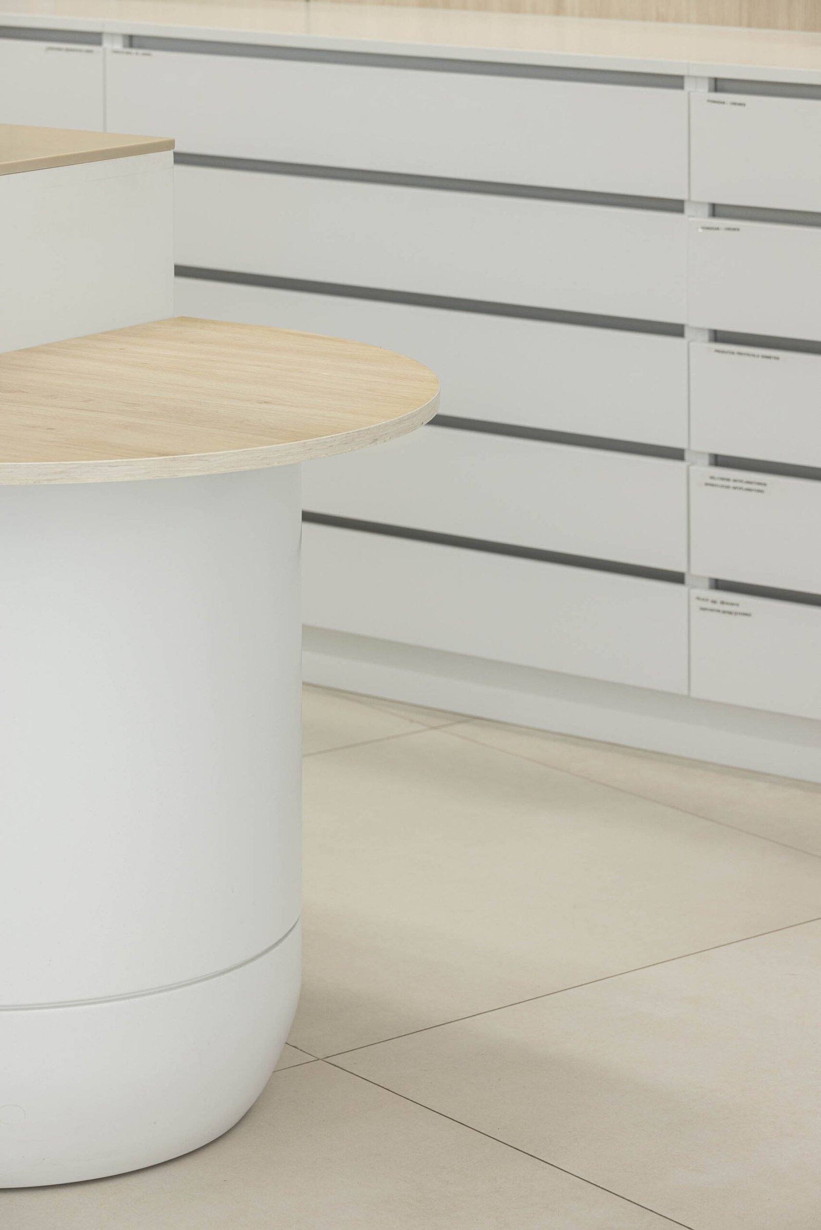 En el centro de la farmacia hay una espaciosa área de servicio con una zona premium para eventos especiales de salud, belleza y bienestar. La integración de un robot dispensador de medicamentos simplifica y agiliza la gestión de la medicación de los pacientes. Este elemento central permite organizar eficazmente el espacio, separando la zona pública de las privadas, como el laboratorio, el almacén, la entrada de servicio, la zona de medicación y el espacio interno de Farmadrive.