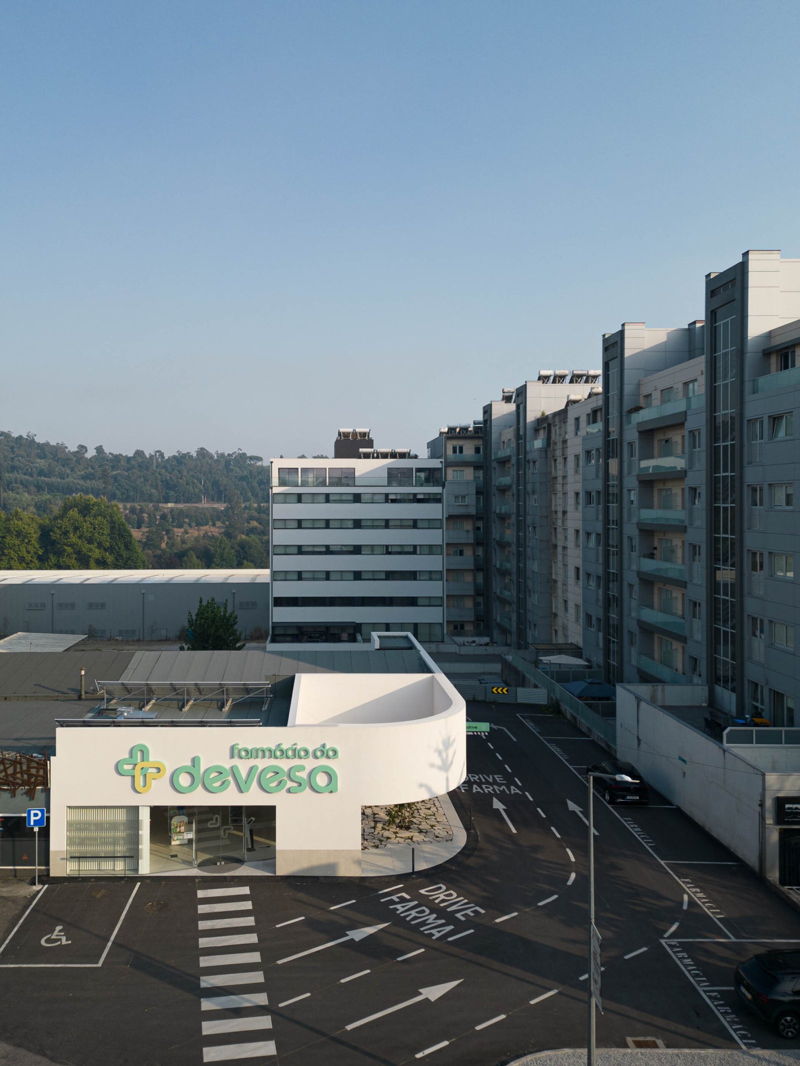 La Farmacia Devesa está situada en Vila Nova de Famalicão, entre las zonas verdes de la ciudad y el centro urbano. Su ubicación privilegiada, con acceso directo por la Avenida do Brasil, desempeñó un papel fundamental en la elección del emplazamiento y la realización del proyecto.