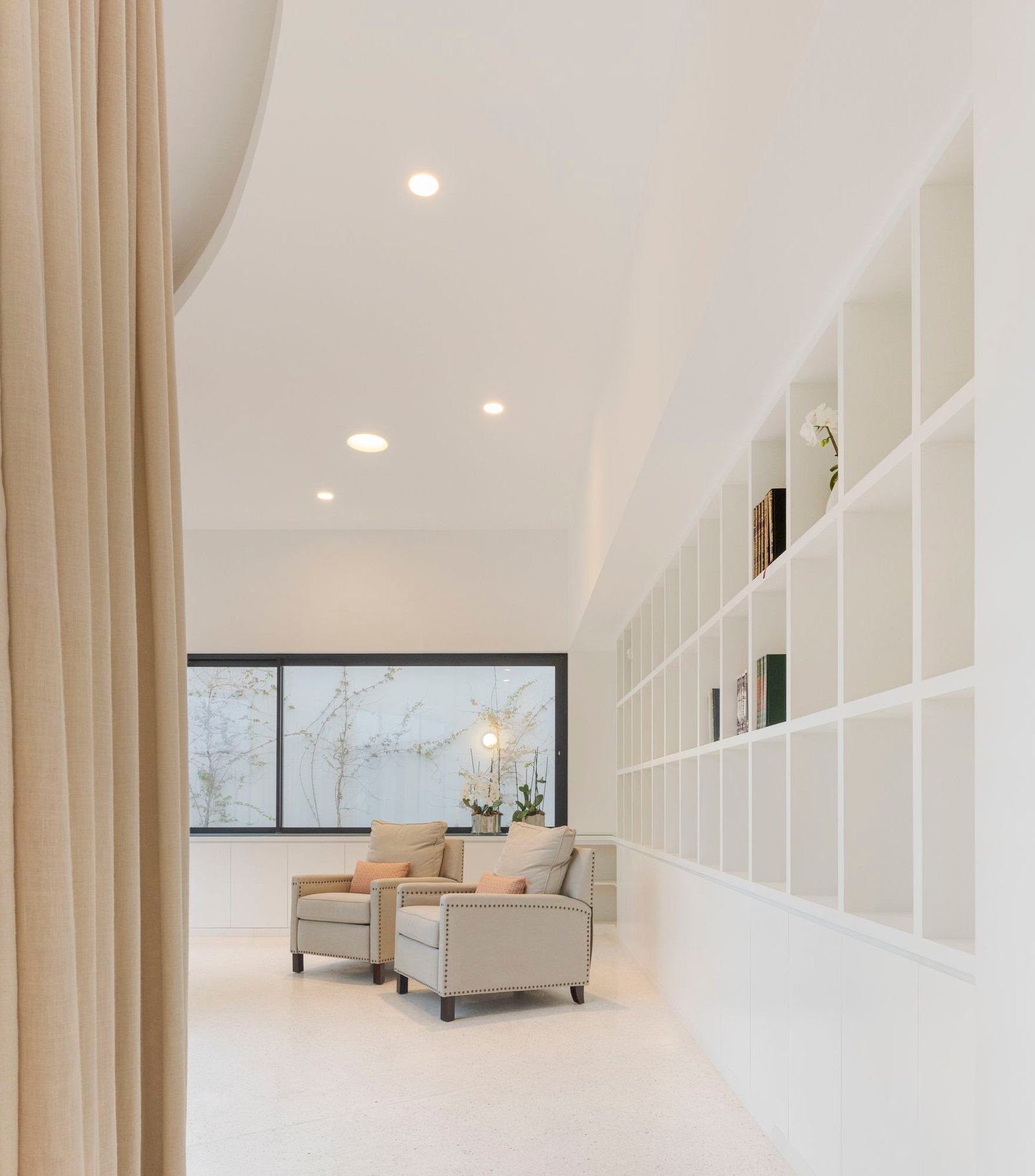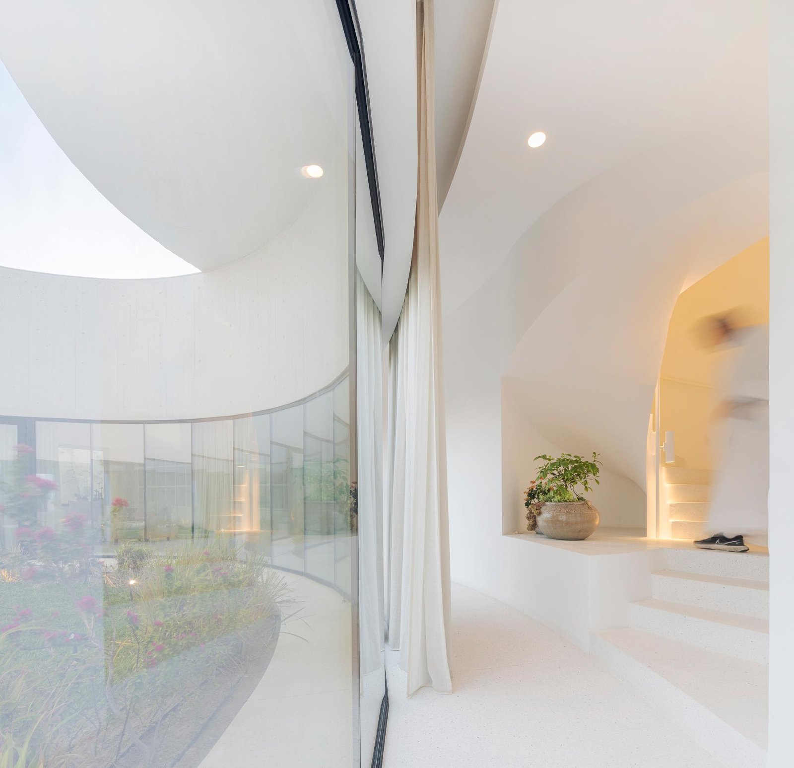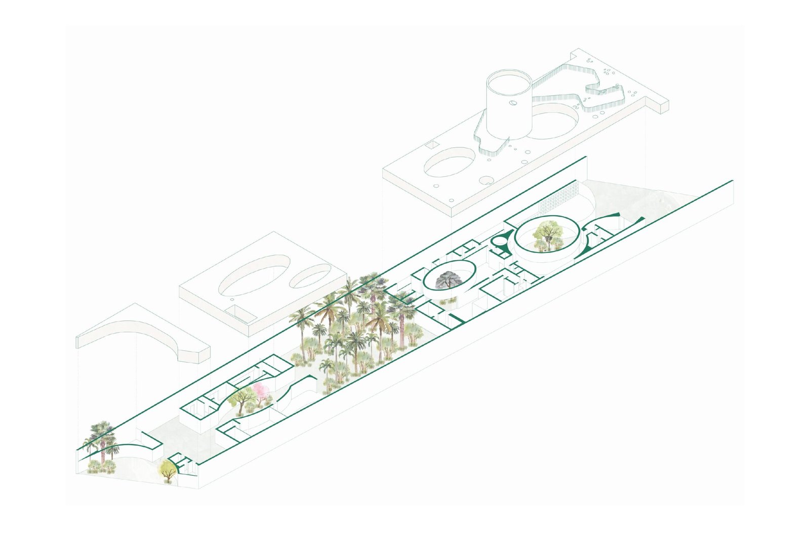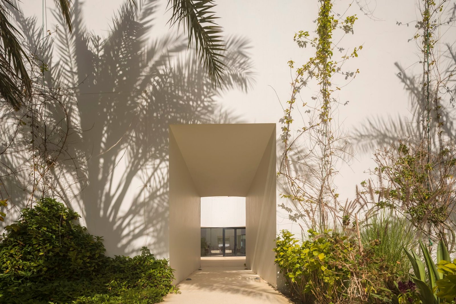 Un «oasis» verde central divide las áreas de servicio de los espacios privados y sociales. El interior está repleto de habitaciones de proporciones generosas que se abren a varios patios ovalados y pequeños jardines verdes, conectados por caminos no lineales que reúnen todos los elementos de la vivienda. Se crea un juego rítmico de profundidad y sombra a medida que un corredor de circulación axial cruza sucesivos jardines y patios, que conducen desde la entrada principal a los espacios familiares privados.