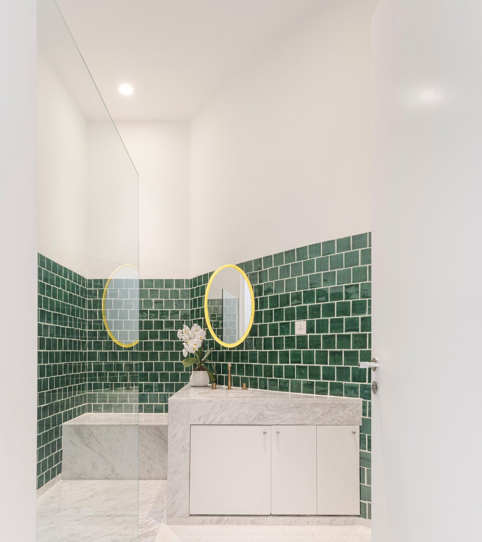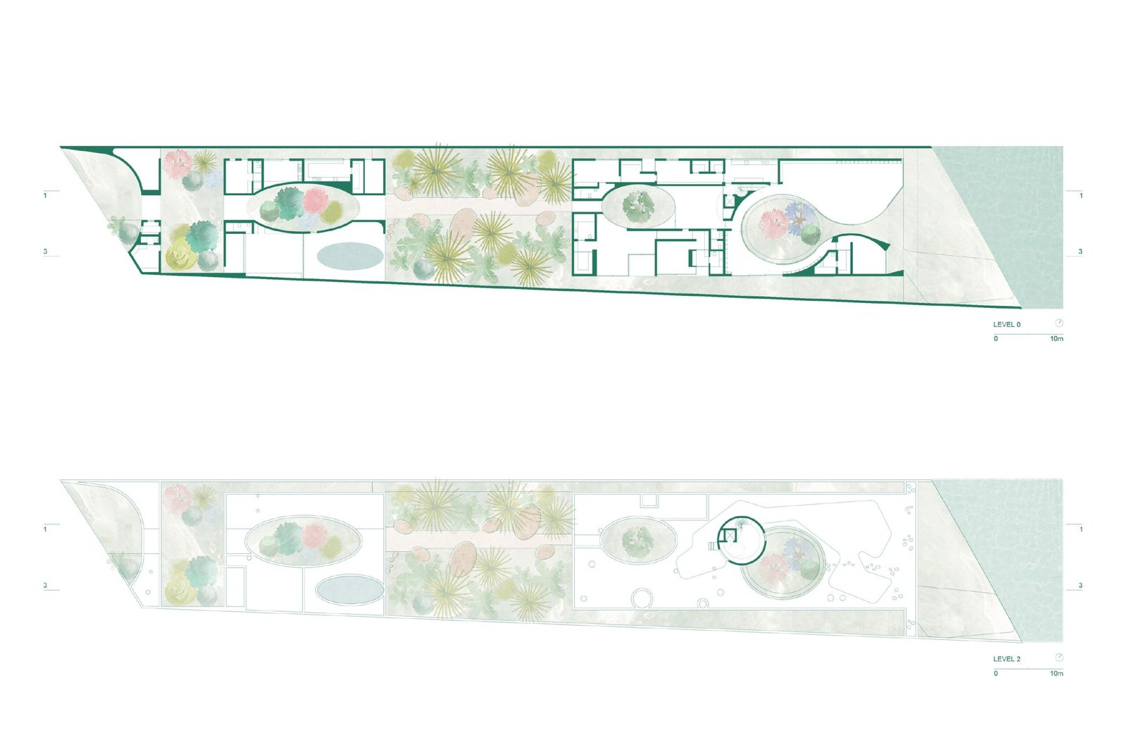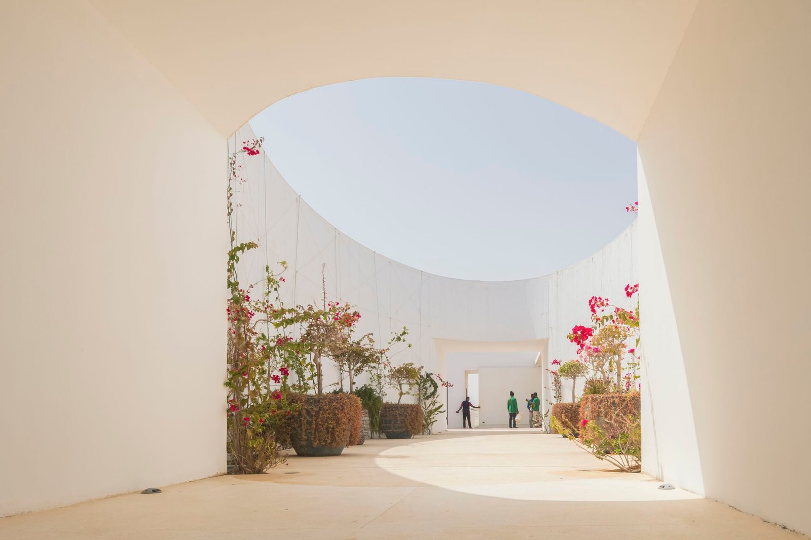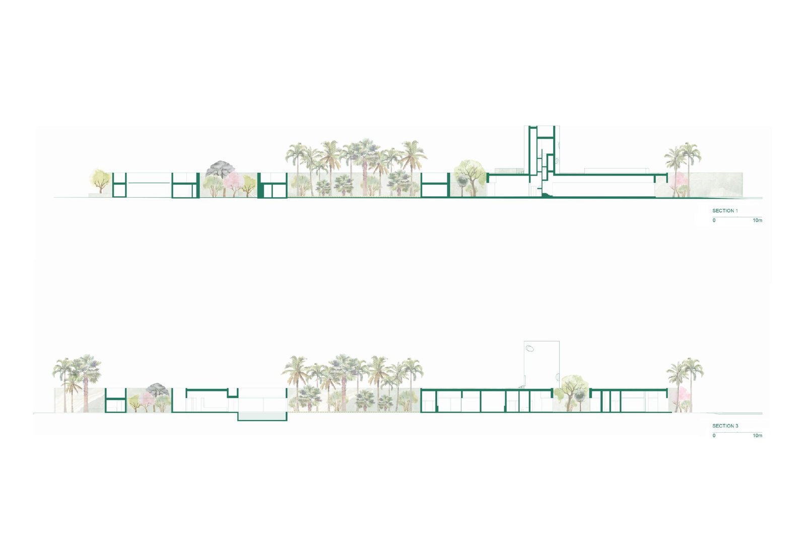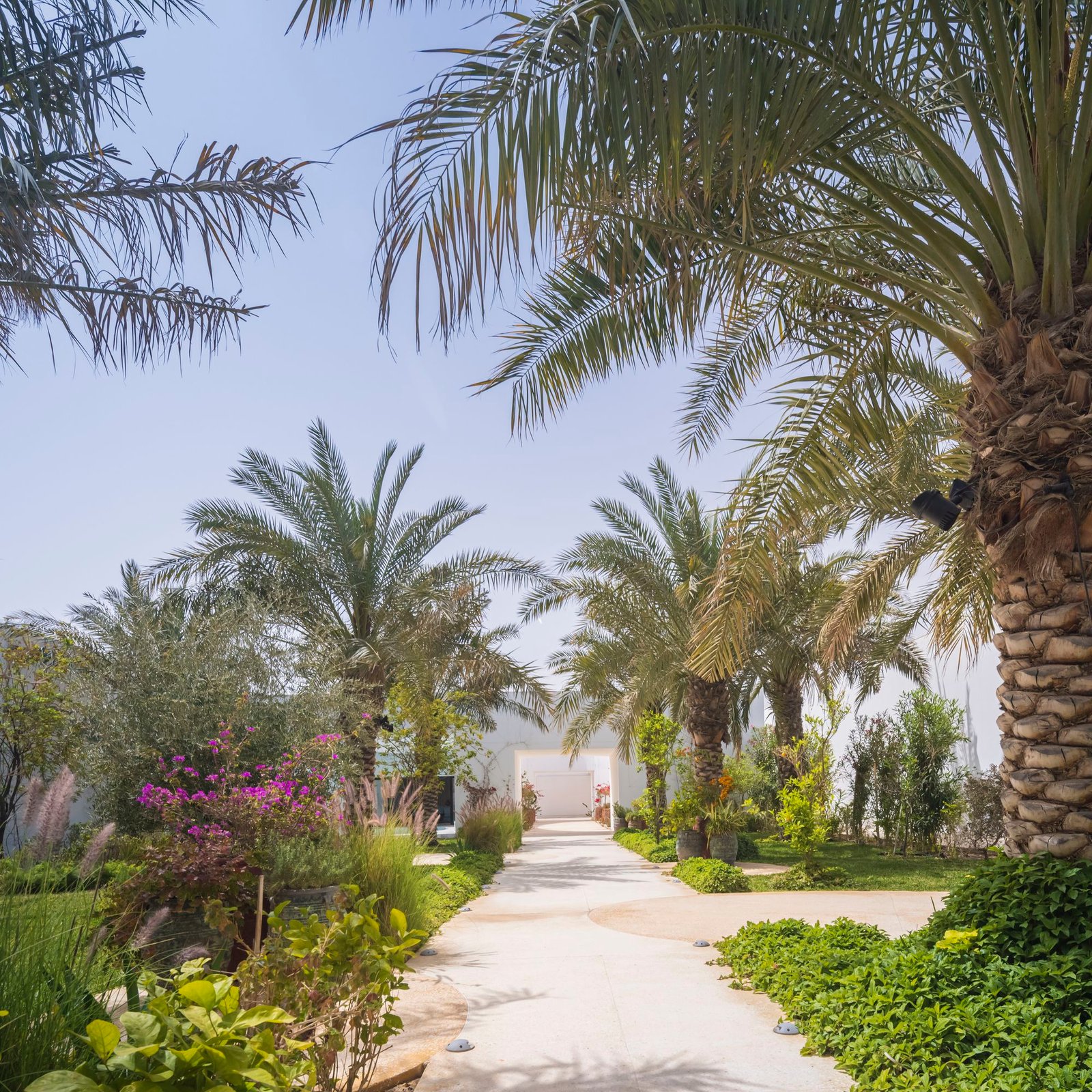 Un «oasis» verde central divide las áreas de servicio de los espacios privados y sociales. El interior está repleto de habitaciones de proporciones generosas que se abren a varios patios ovalados y pequeños jardines verdes, conectados por caminos no lineales que reúnen todos los elementos de la vivienda. Se crea un juego rítmico de profundidad y sombra a medida que un corredor de circulación axial cruza sucesivos jardines y patios, que conducen desde la entrada principal a los espacios familiares privados.
