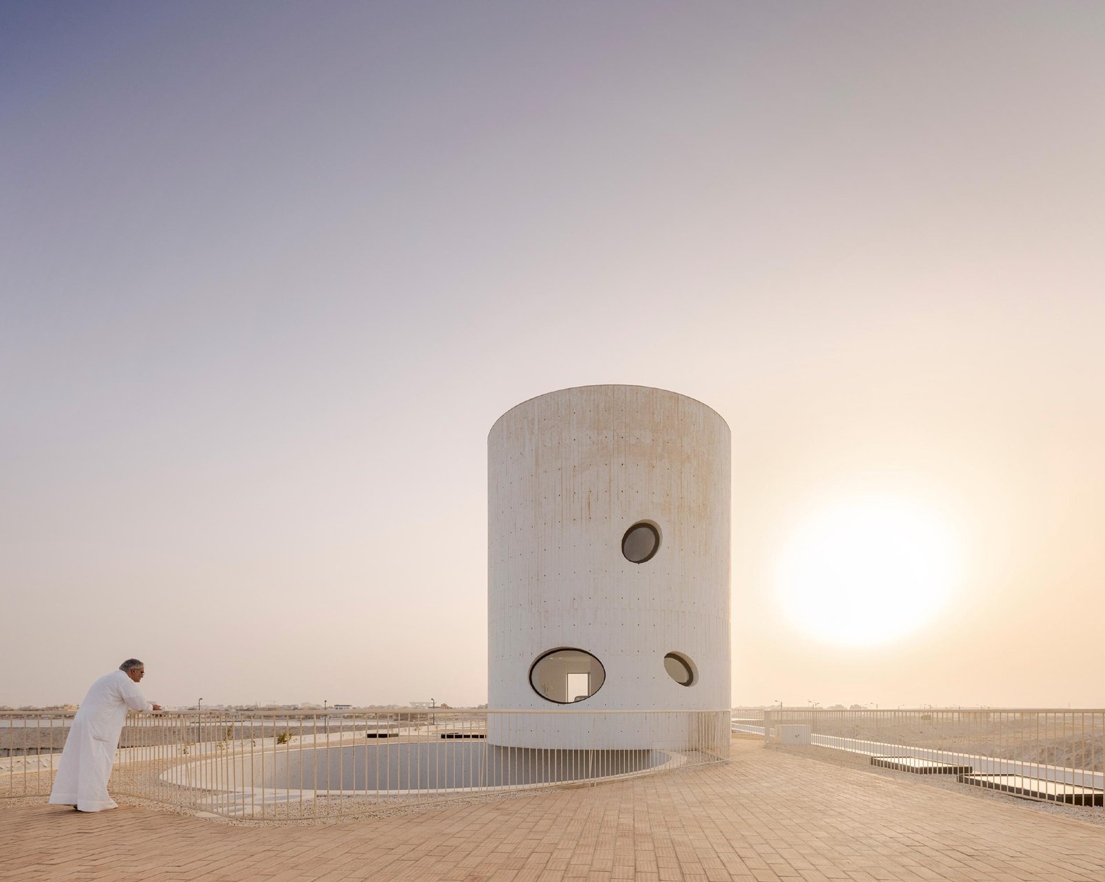 En el corazón del «oasis» central, un alto volumen cilíndrico atrae la mirada. Se alza como un faro costero, elevándose hacia arriba como un espacio para la soledad y la meditación. Proporciona un entorno tranquilo para la serenidad y la contemplación. Desde la torre, se puede acceder a la azotea, que se transforma en un espacio de paseo contemplativo. La azotea y la torre ofrecen vistas panorámicas de los jardines de la casa, las dunas y el horizonte infinito del mar.