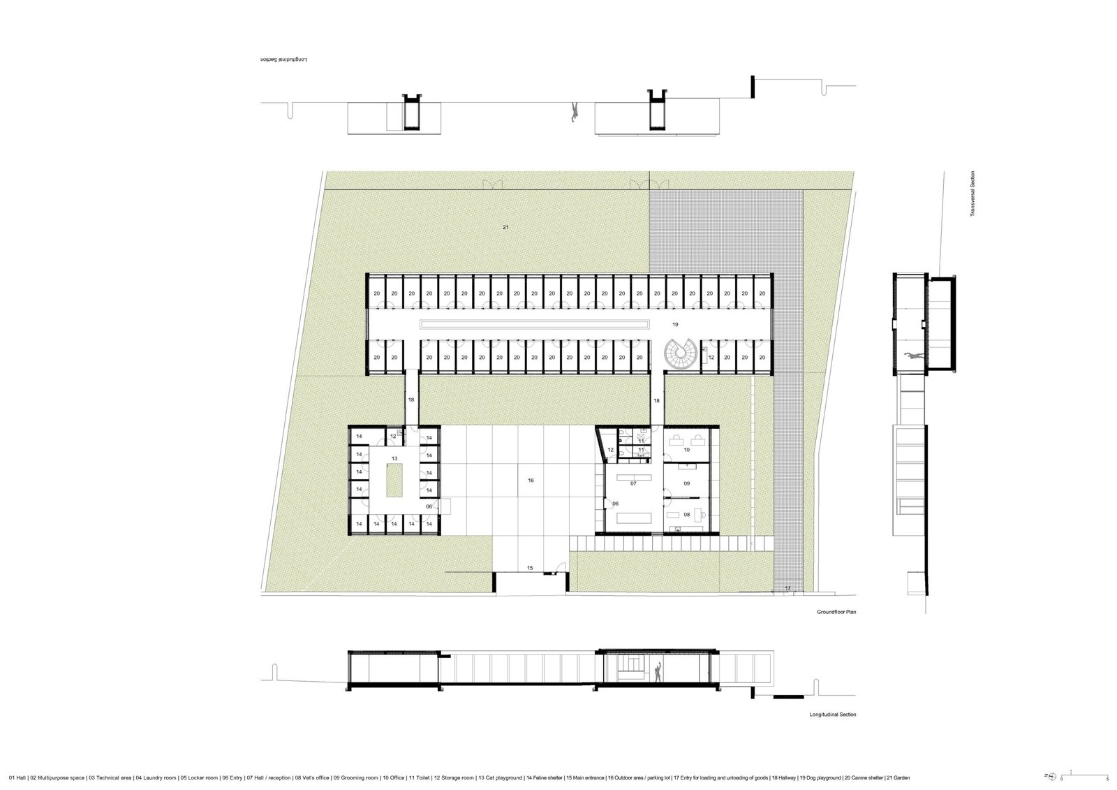 Arriba tenemos cuarenta y un refugios para perros separados por el corredor central con un pequeño jardín para obstruir el contacto visual de los animales uno frente al otro. En el piso inferior, con un acceso de escalera de caracol, tenemos un espacio de usos múltiples, una sala técnica, una sala de lavandería y un vestuario y baño para empleados.
