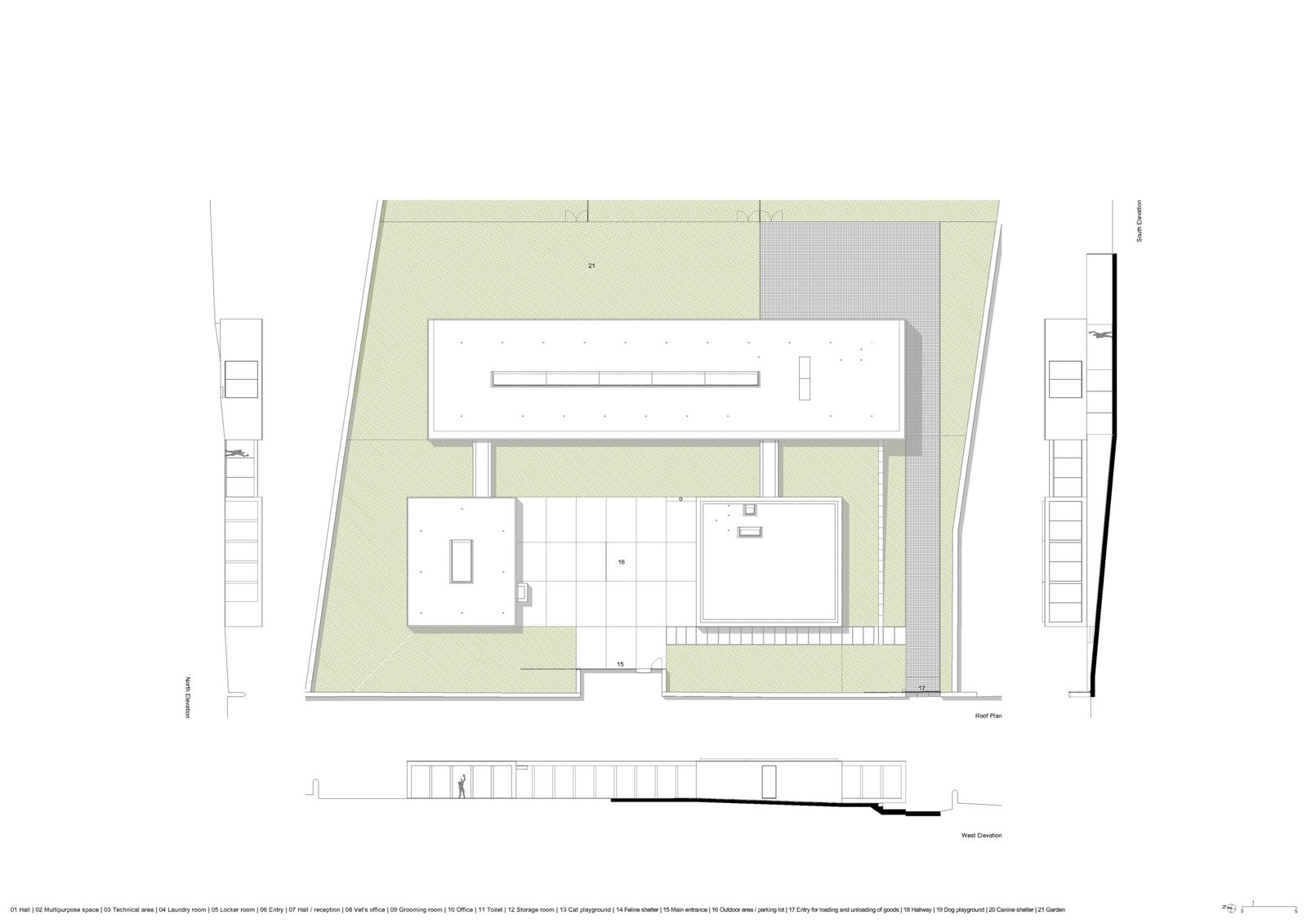 El programa restante es un complemento de la actividad del espacio, con una oficina veterinaria, una sala de aseo, áreas de entrenamiento al aire libre y una piscina para mascotas. El programa se distribuye en tres edificios que están interconectados, lo que permite crear tres áreas diferentes. De esta forma conseguimos separar la zona del gato de la zona del perro, evitando la reunión de ambos y reduciendo los ruidos de los animales. En otro edificio encontramos todos los espacios de servicio público. En combinación con las necesidades de diseño programático, los tres volúmenes fueron diseñados para reducir el impacto del área de construcción a fin de mejorar su integración con el paisaje.