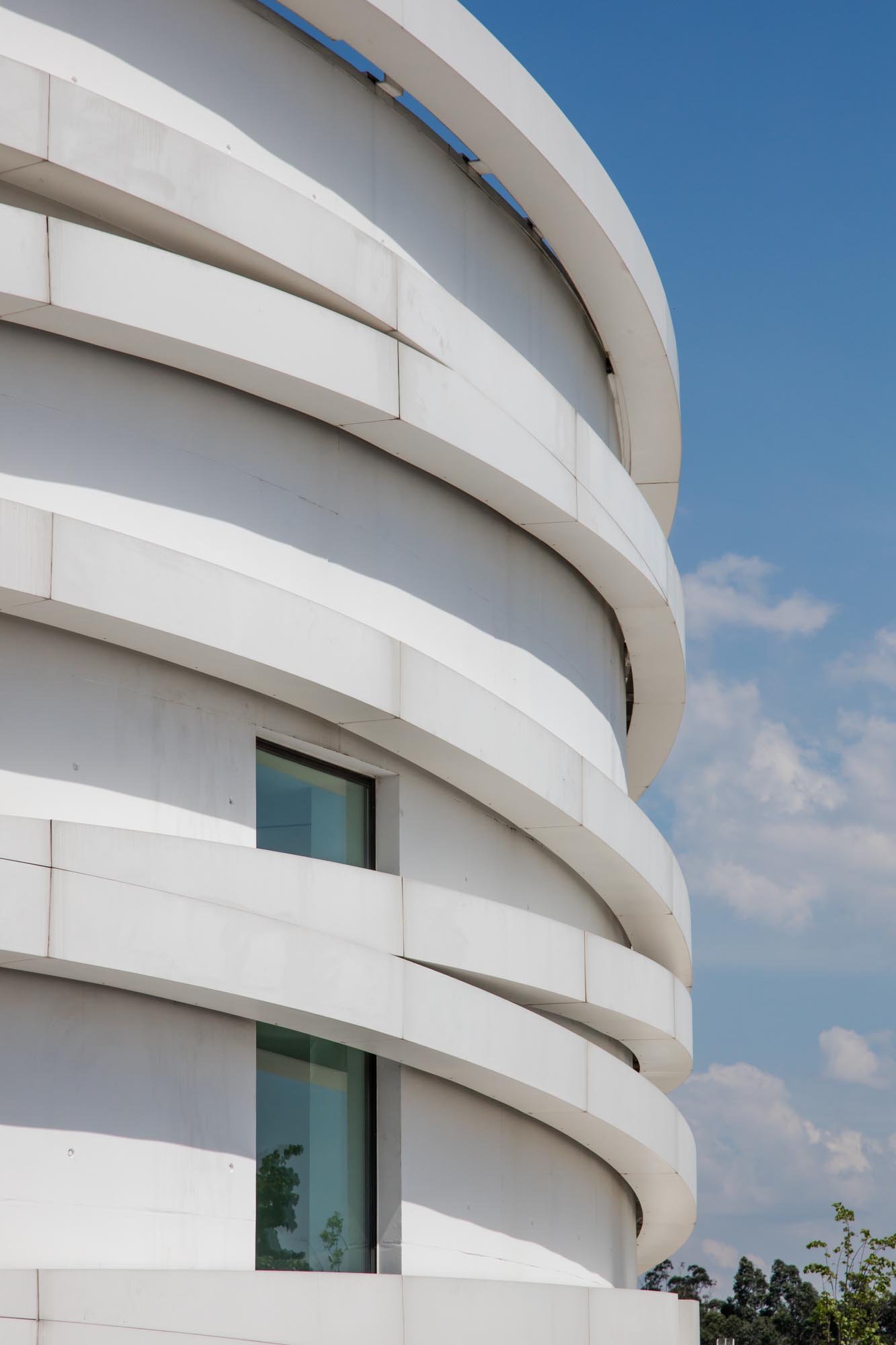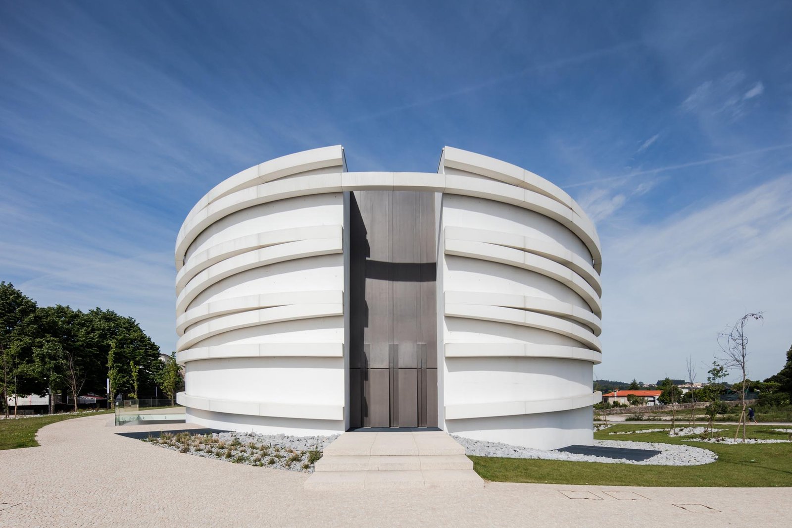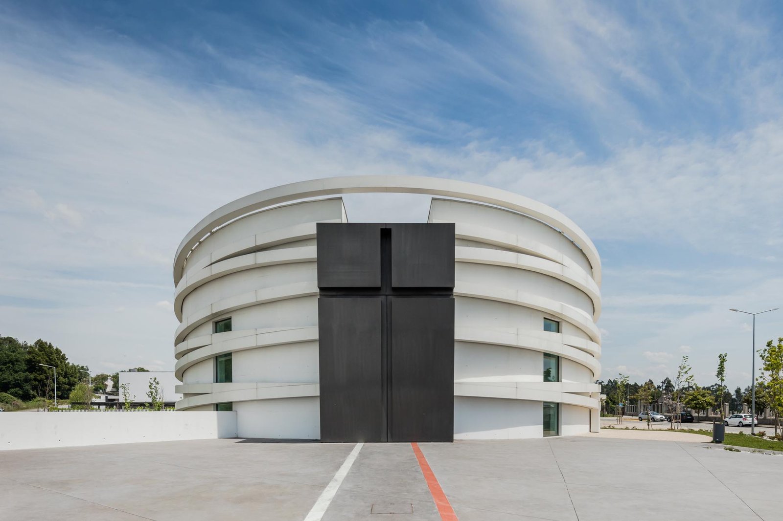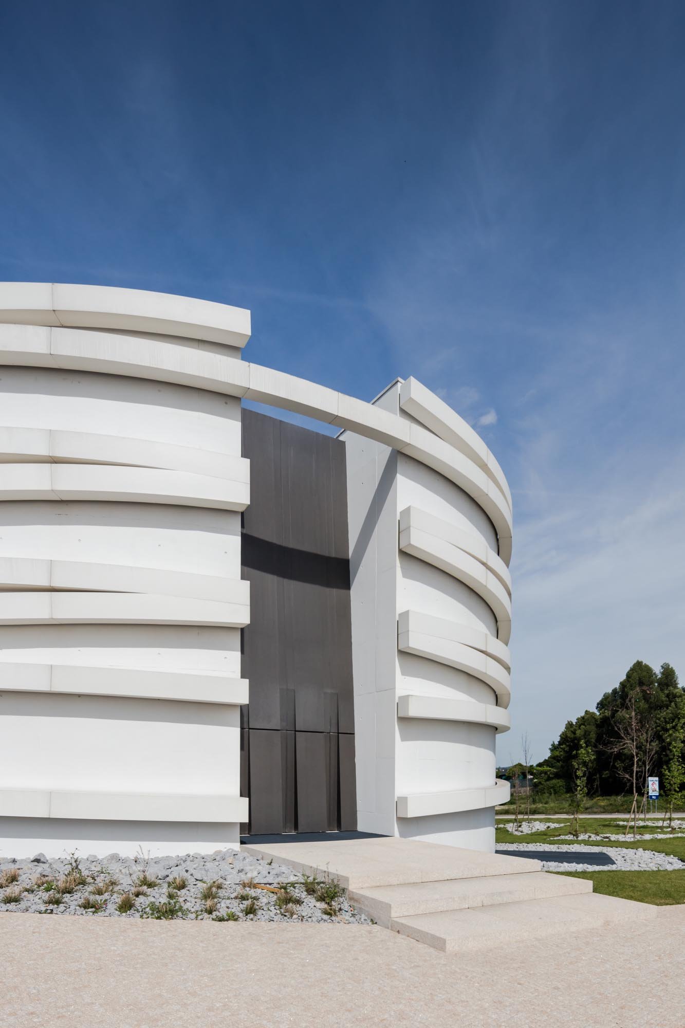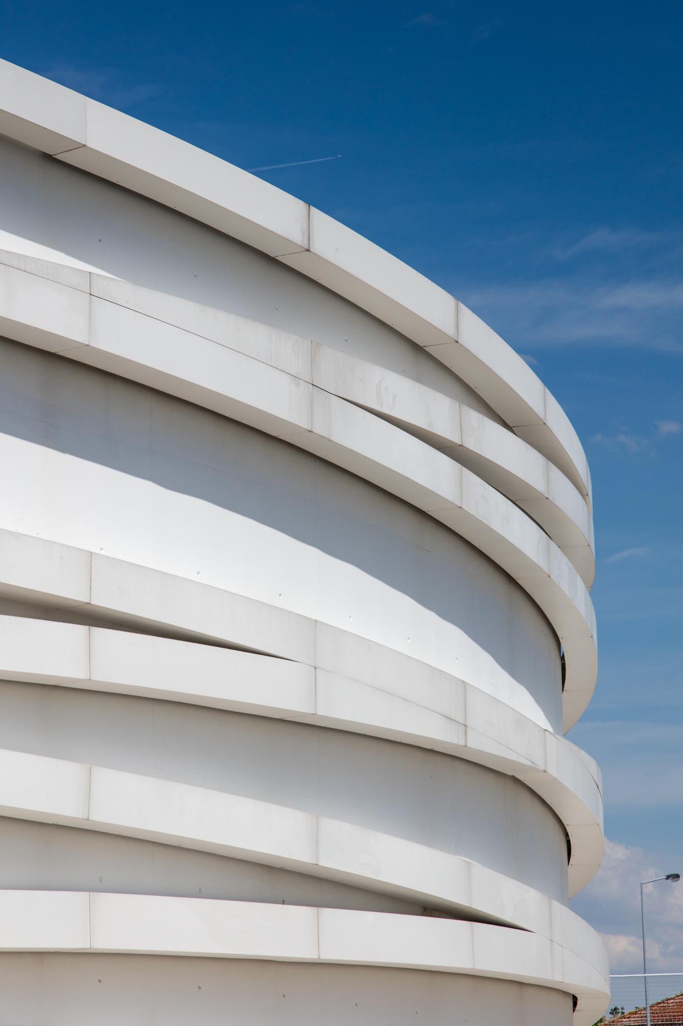 El volumen materializa su forma a través de las paredes exteriores de hormigón con casi ninguna abertura, lo que incorpora una imagen misteriosa y austera, a pesar de los arcos suspendidos que lo abarcan.