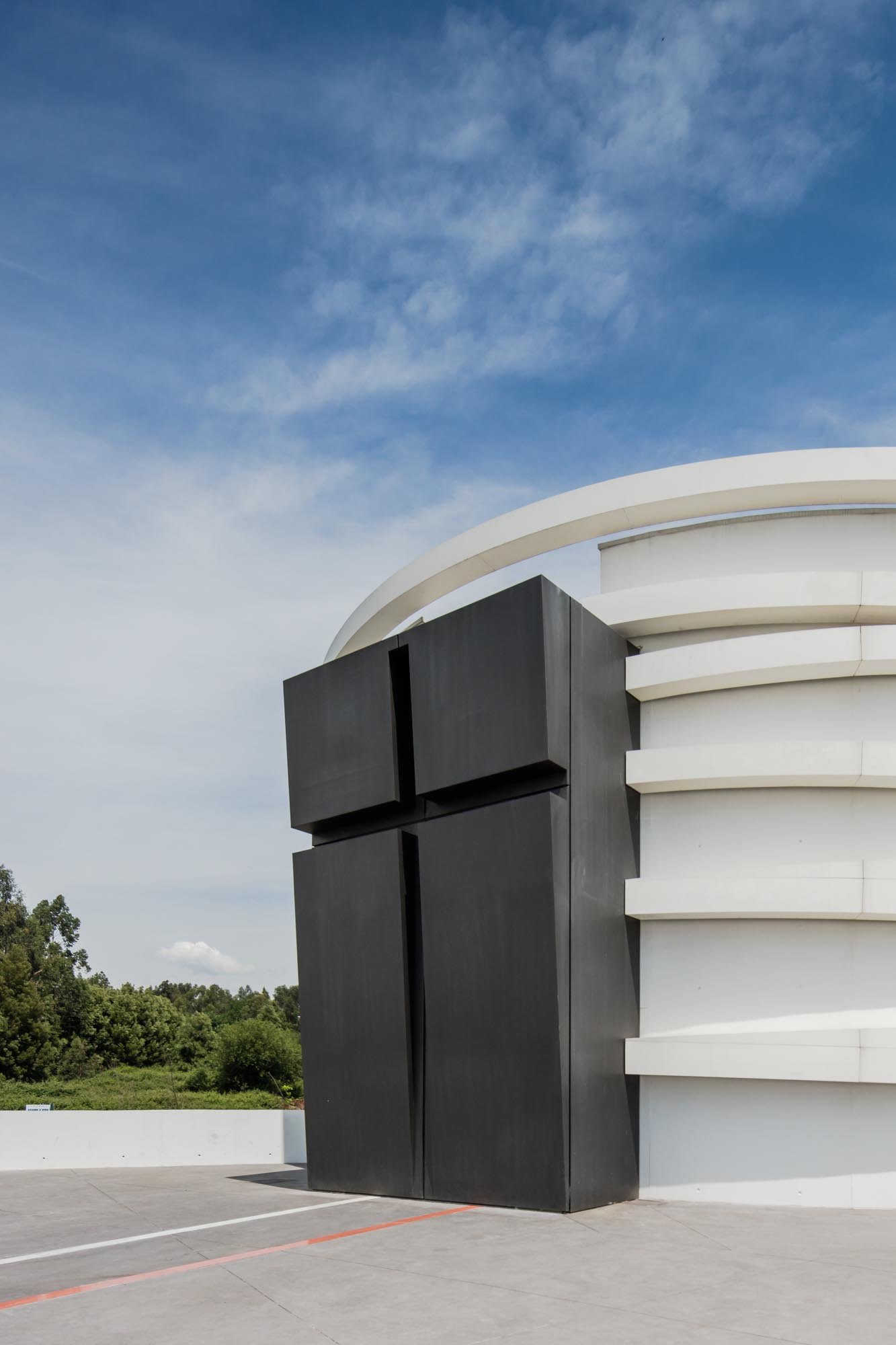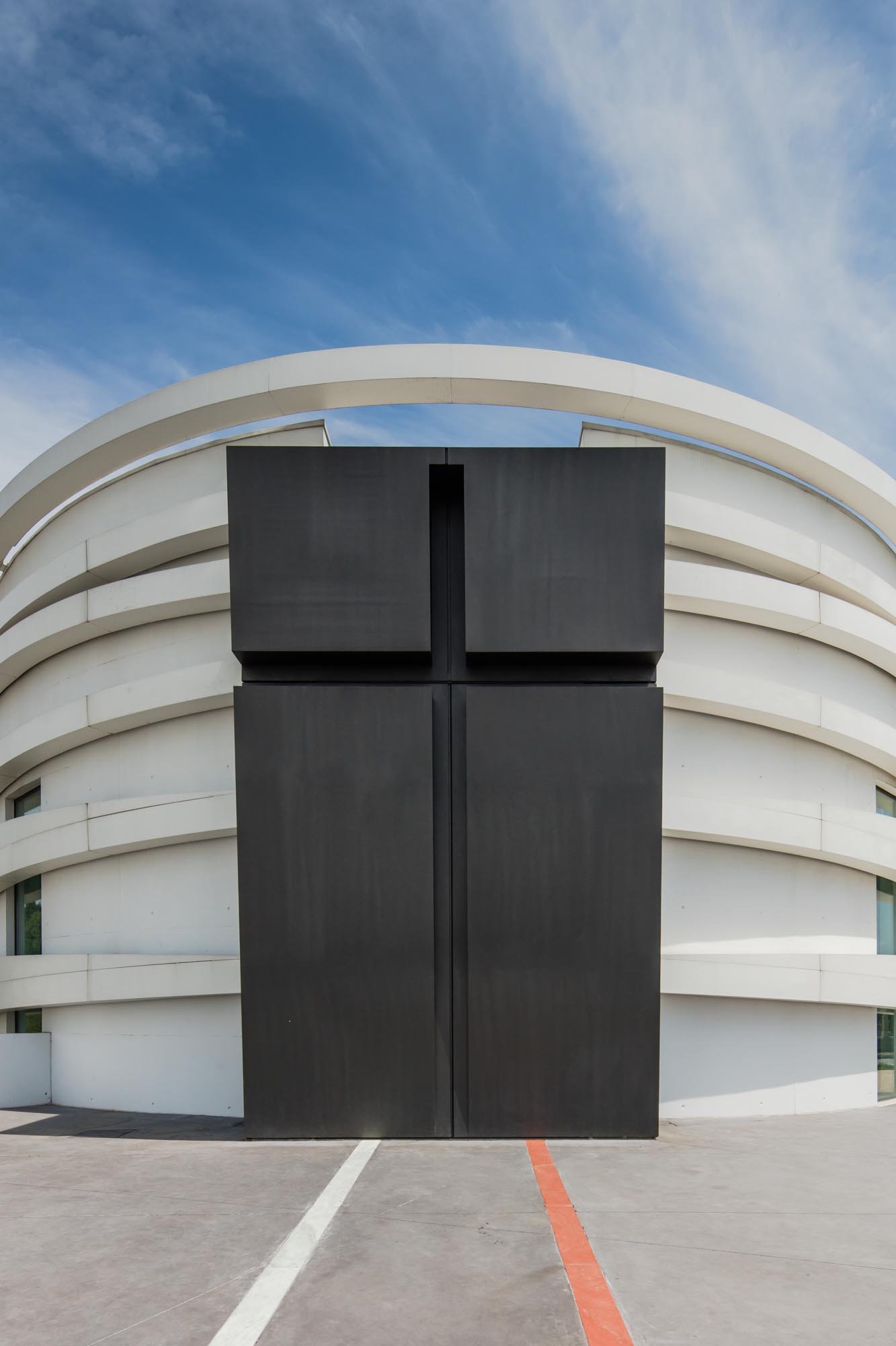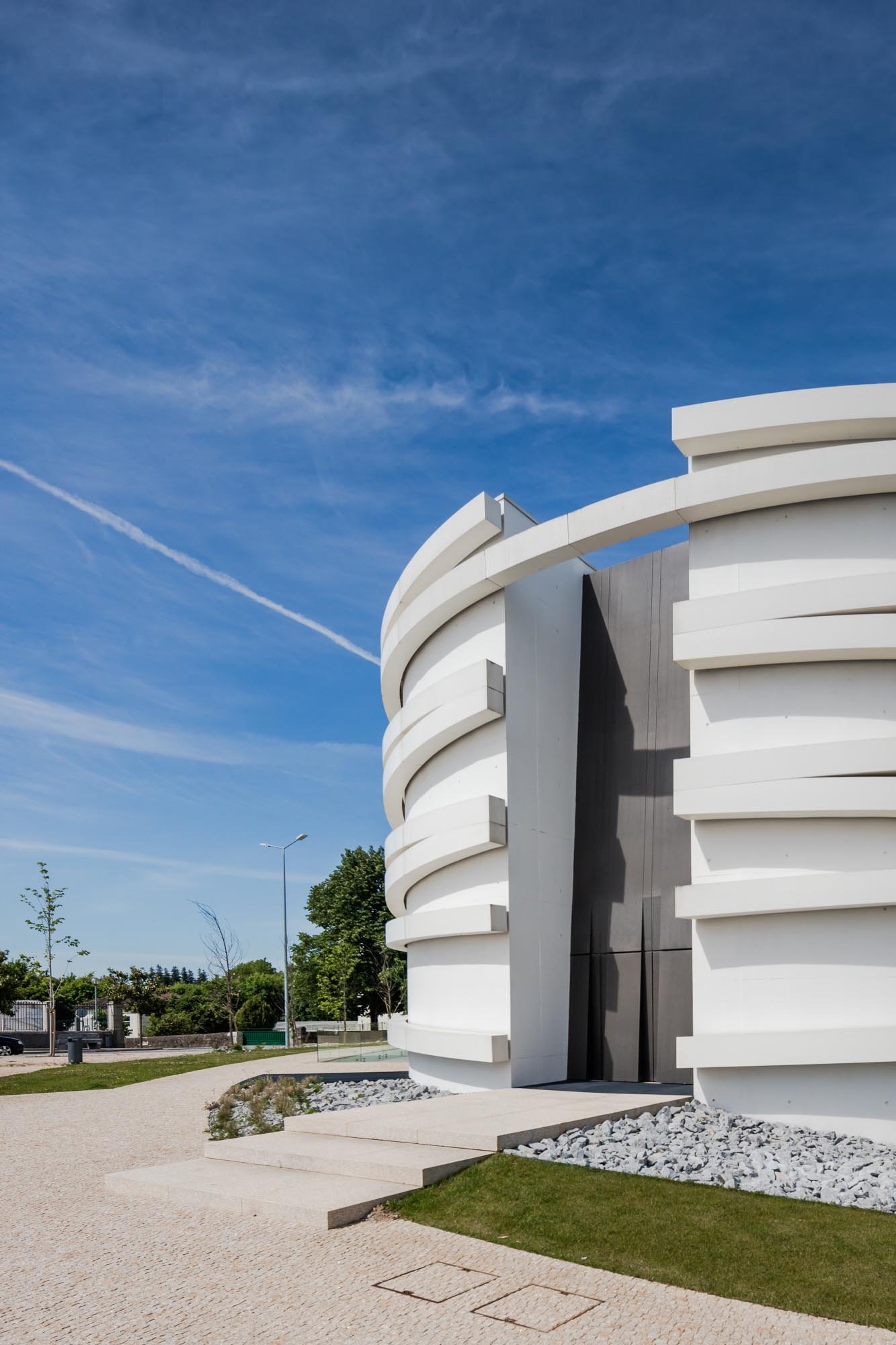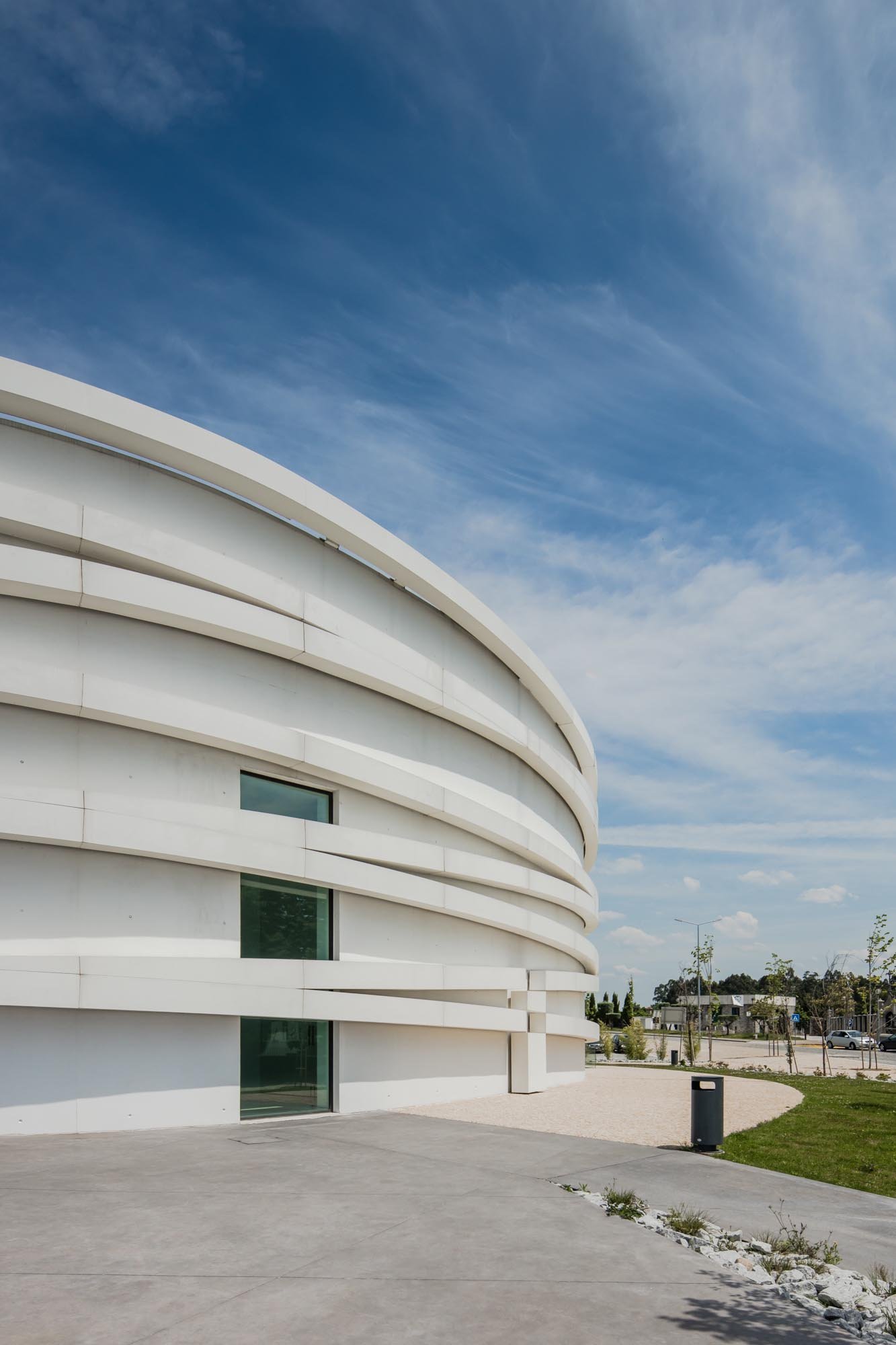 El volumen materializa su forma a través de las paredes exteriores de hormigón con casi ninguna abertura, lo que incorpora una imagen misteriosa y austera, a pesar de los arcos suspendidos que lo abarcan.